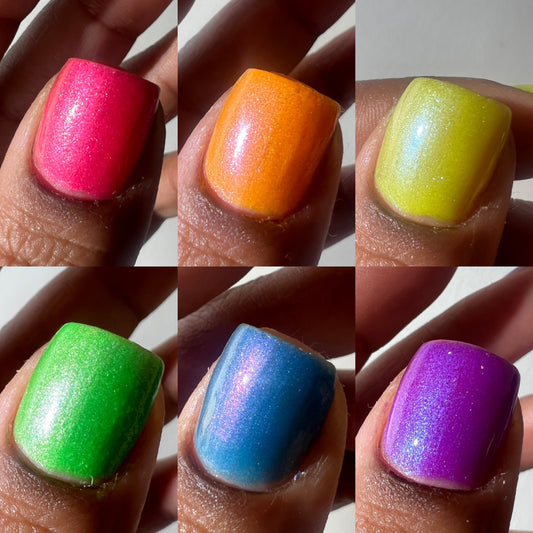 Neon Dreams is such a fun collection and perfect for summer. The colors are bright and playful and the formula went on so smooth. I did a skittle mani and wore it for over a week with no chips. They stayed vibrant the whole time. Try these with a matte top coat too, they look so good that way!