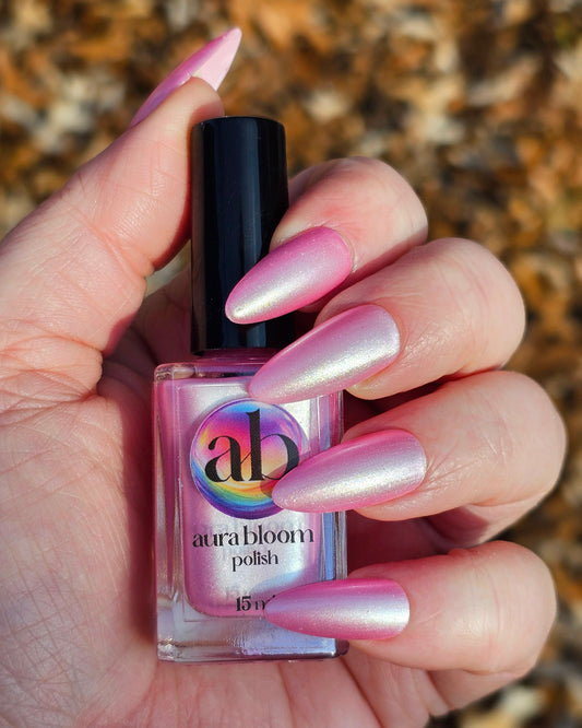 Aurora polishes are polishes that contain an aurora color shifting shimmer. The shimmer shifts between multiple colors based on the direction, angle, or lighting they are in, but they will still show the underlying color. These may, or may not, contain glitter, micro flakes, or standard flakes as well.