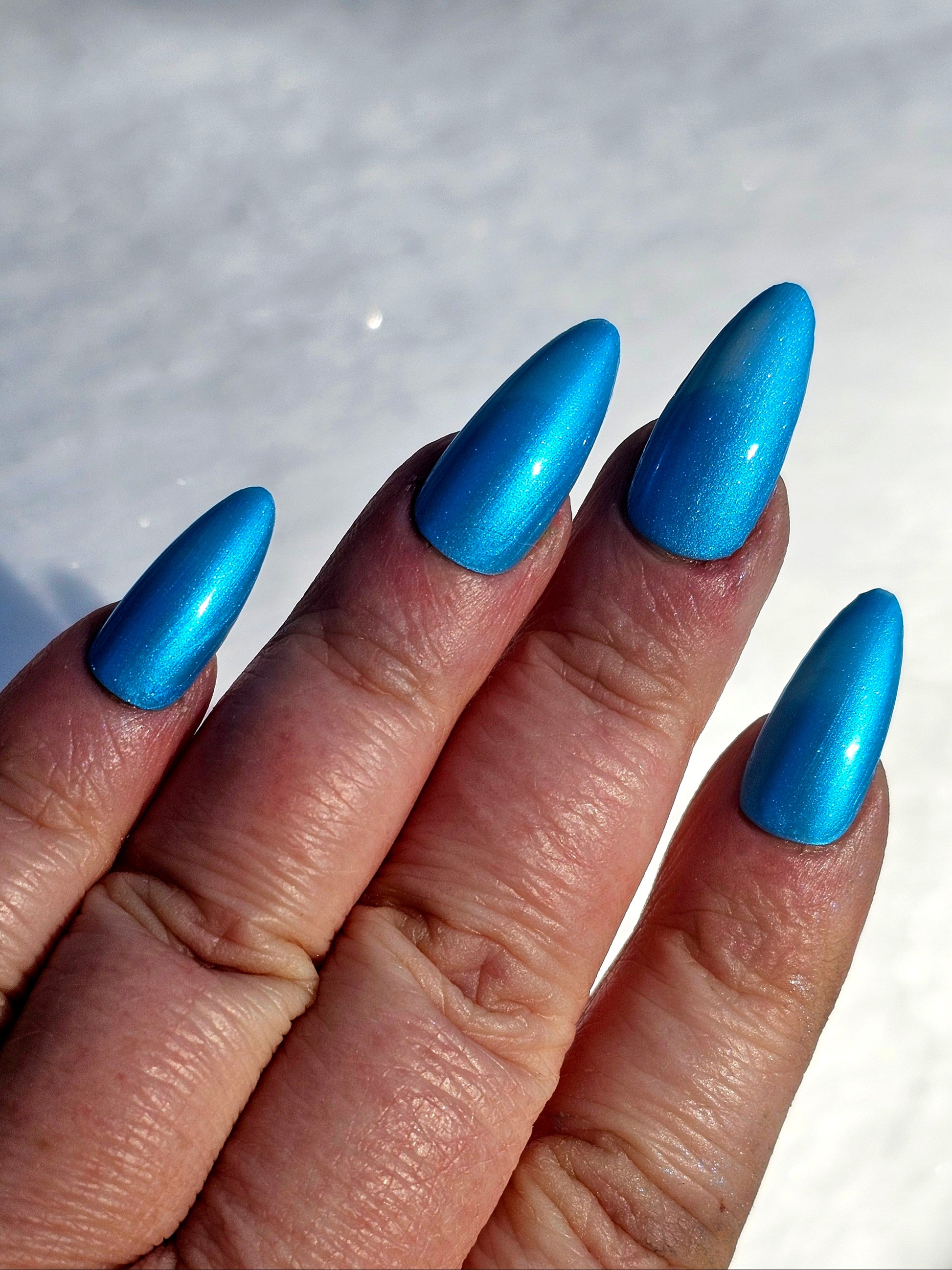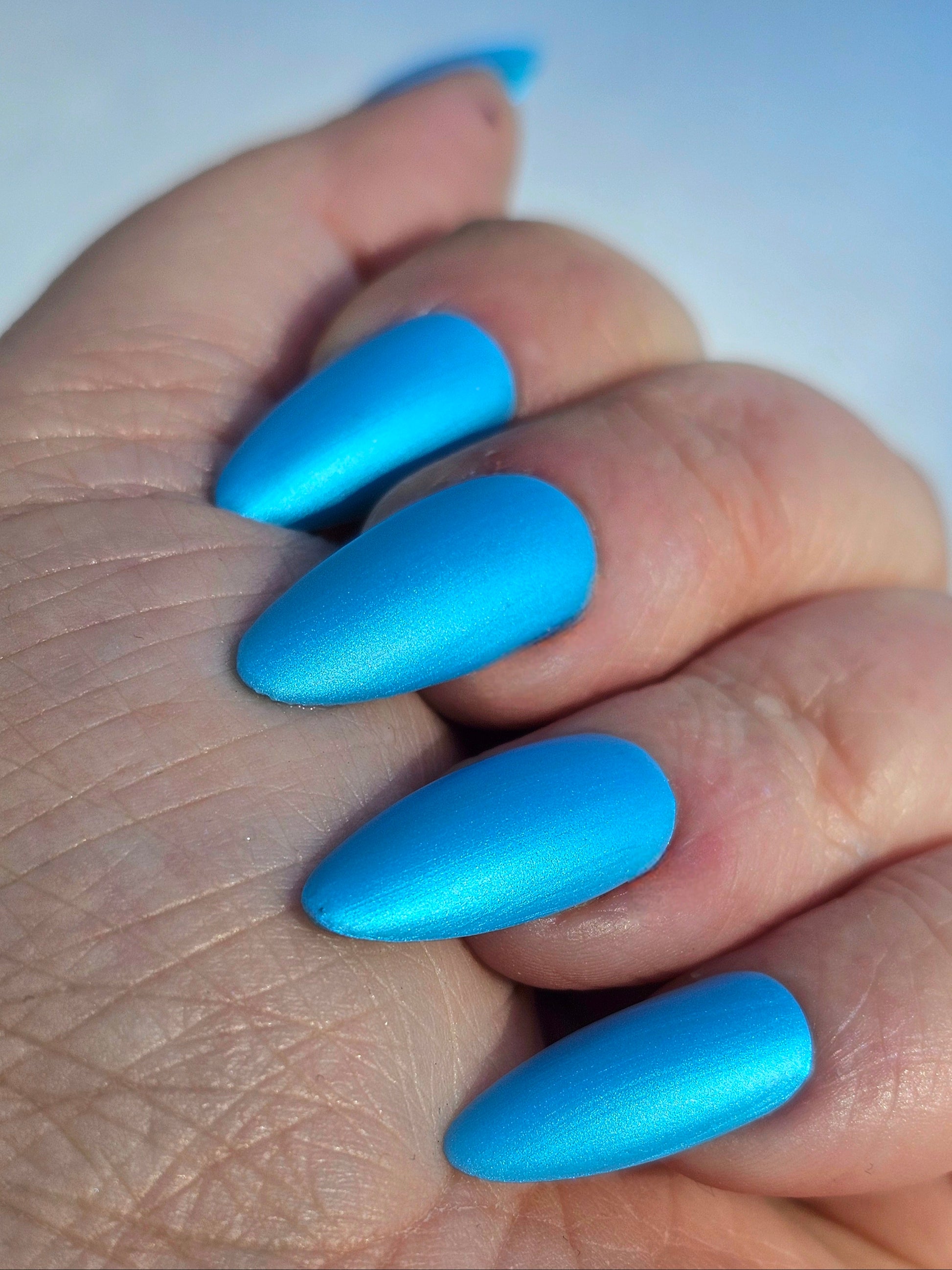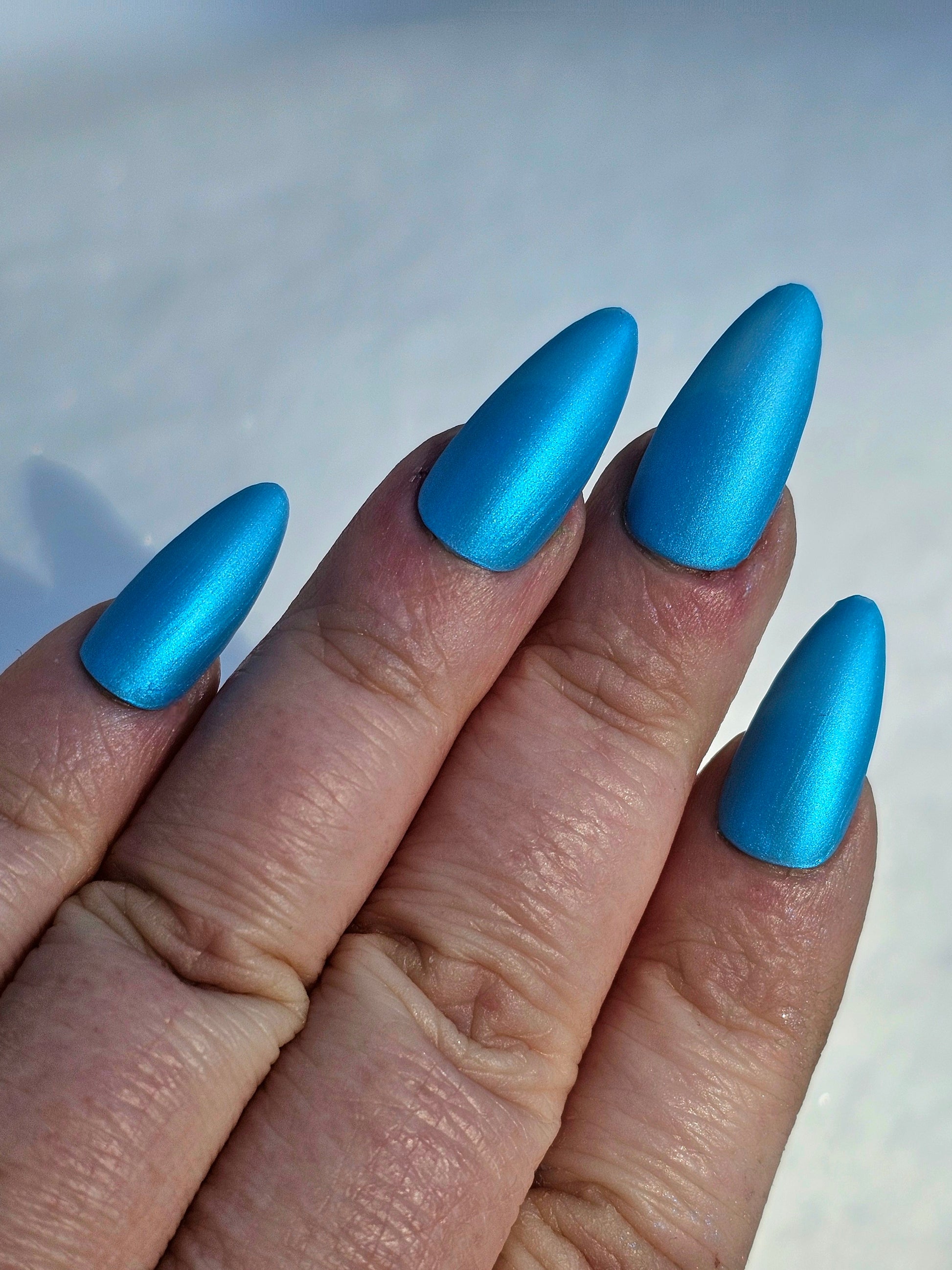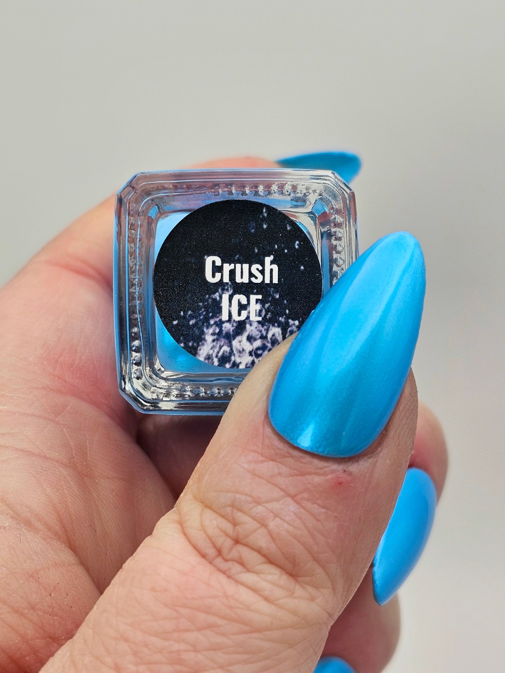 Crush ICE is a baby blue polish with a bright blue shimmer. Photos show this polish with our Flash Freeze QDTC and some photos are with the Magical Matte Top Coat.
