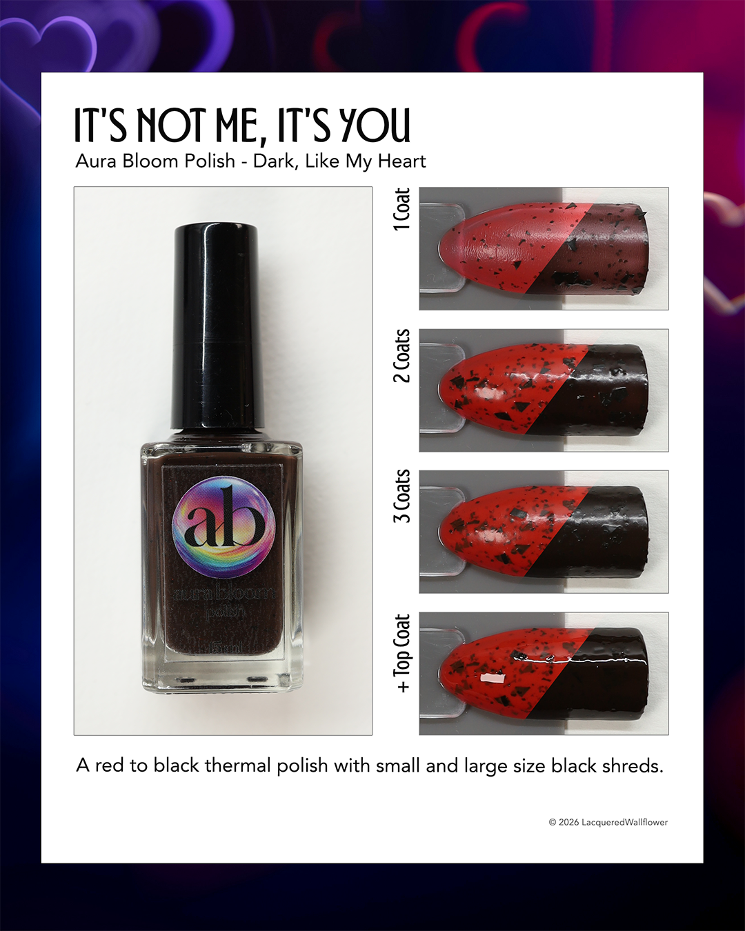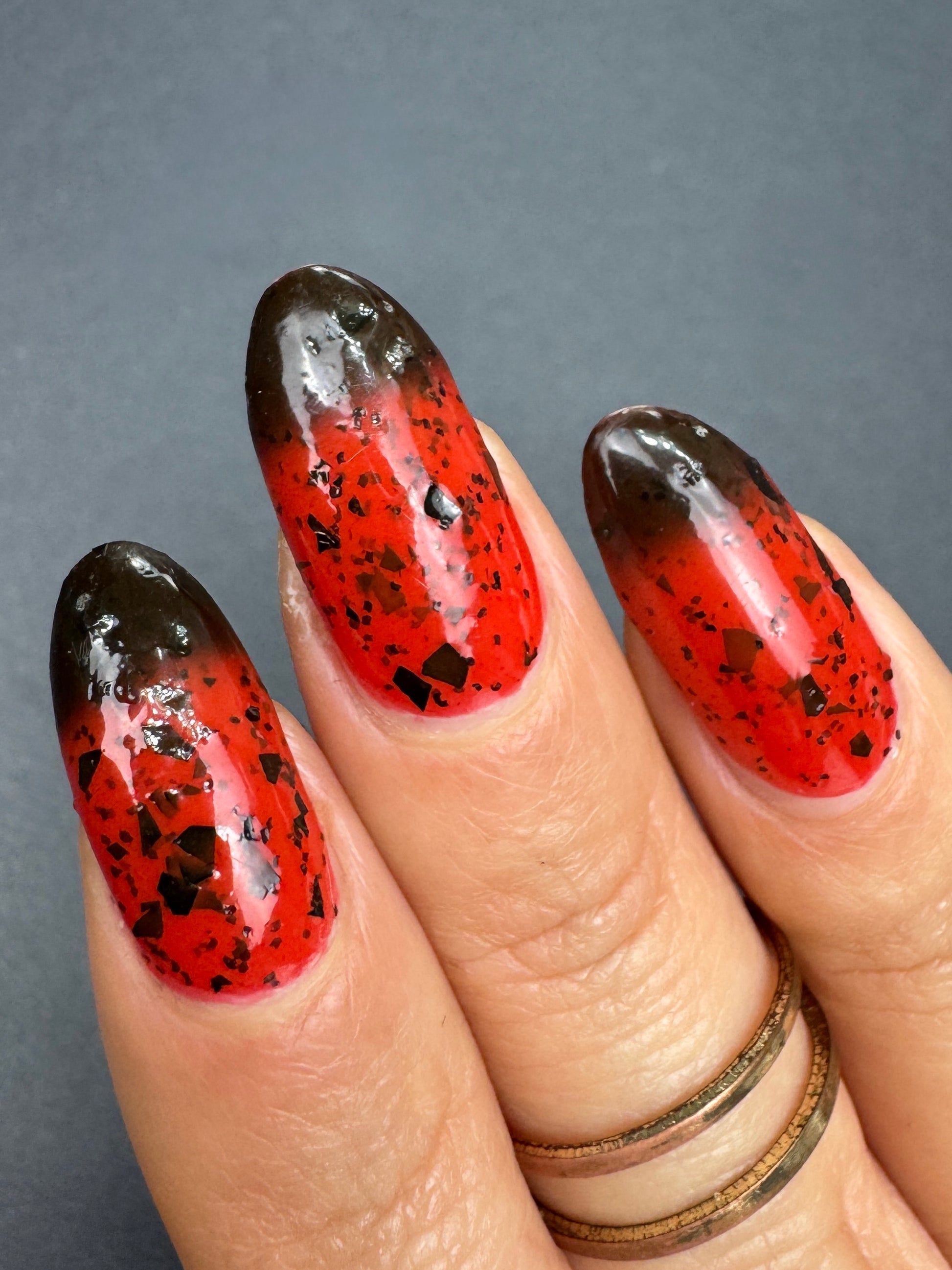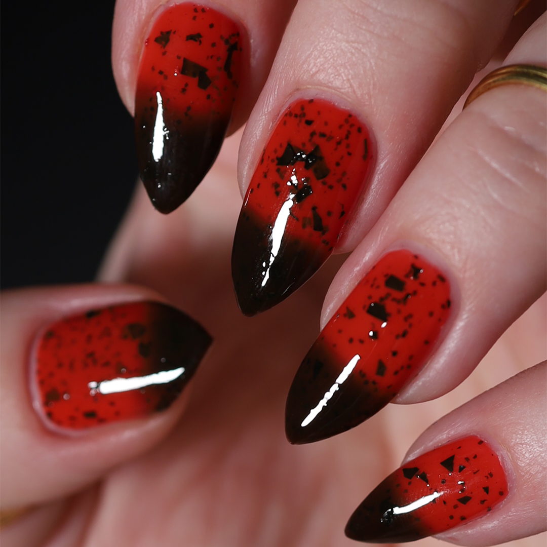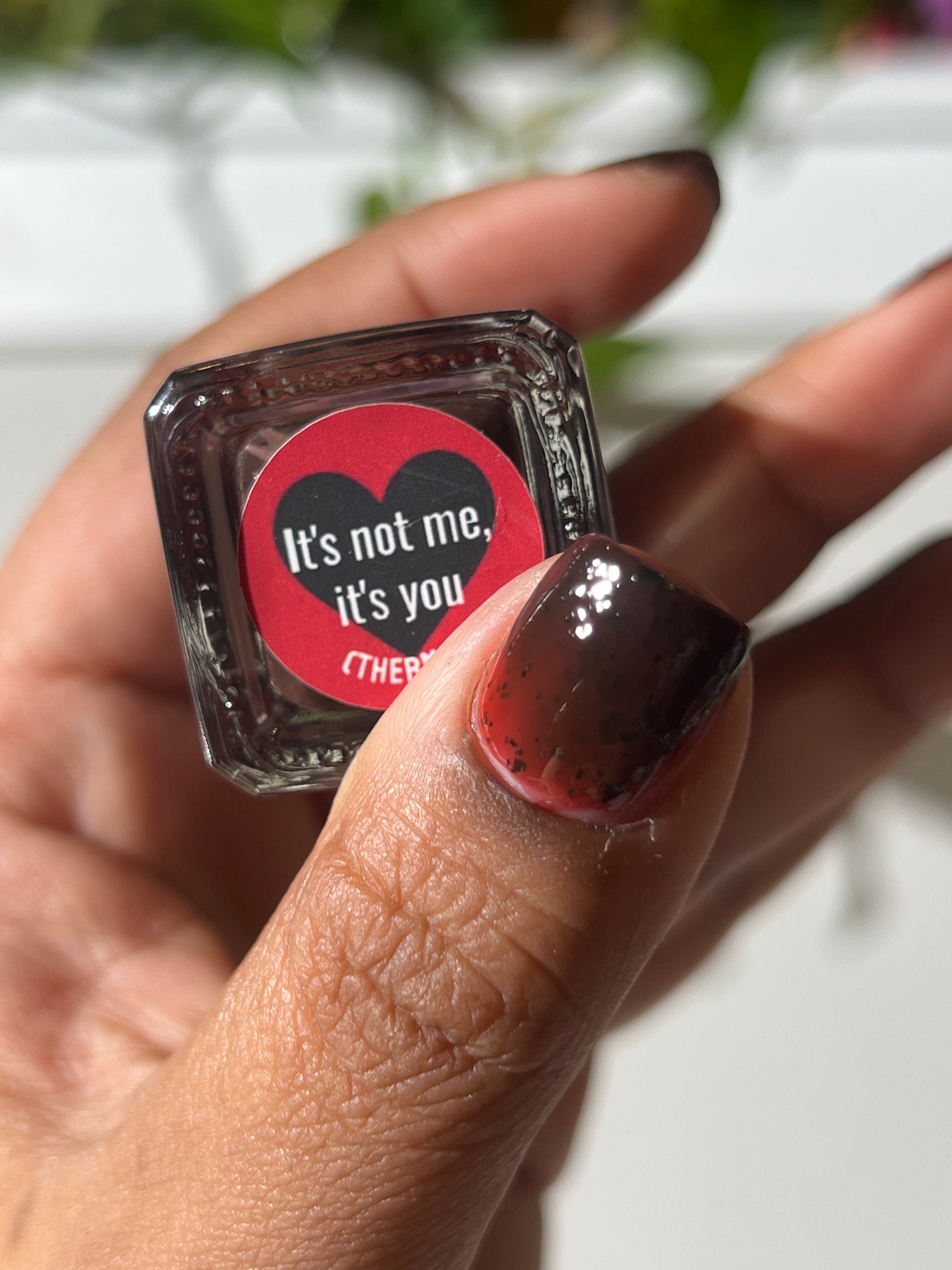 It's not me, it's you is a red to black thermal polish with small and large size black shreds *Please note, this polish may appear more of a blackish brown in some temps or lighting due to the composition of the thermal pigment*