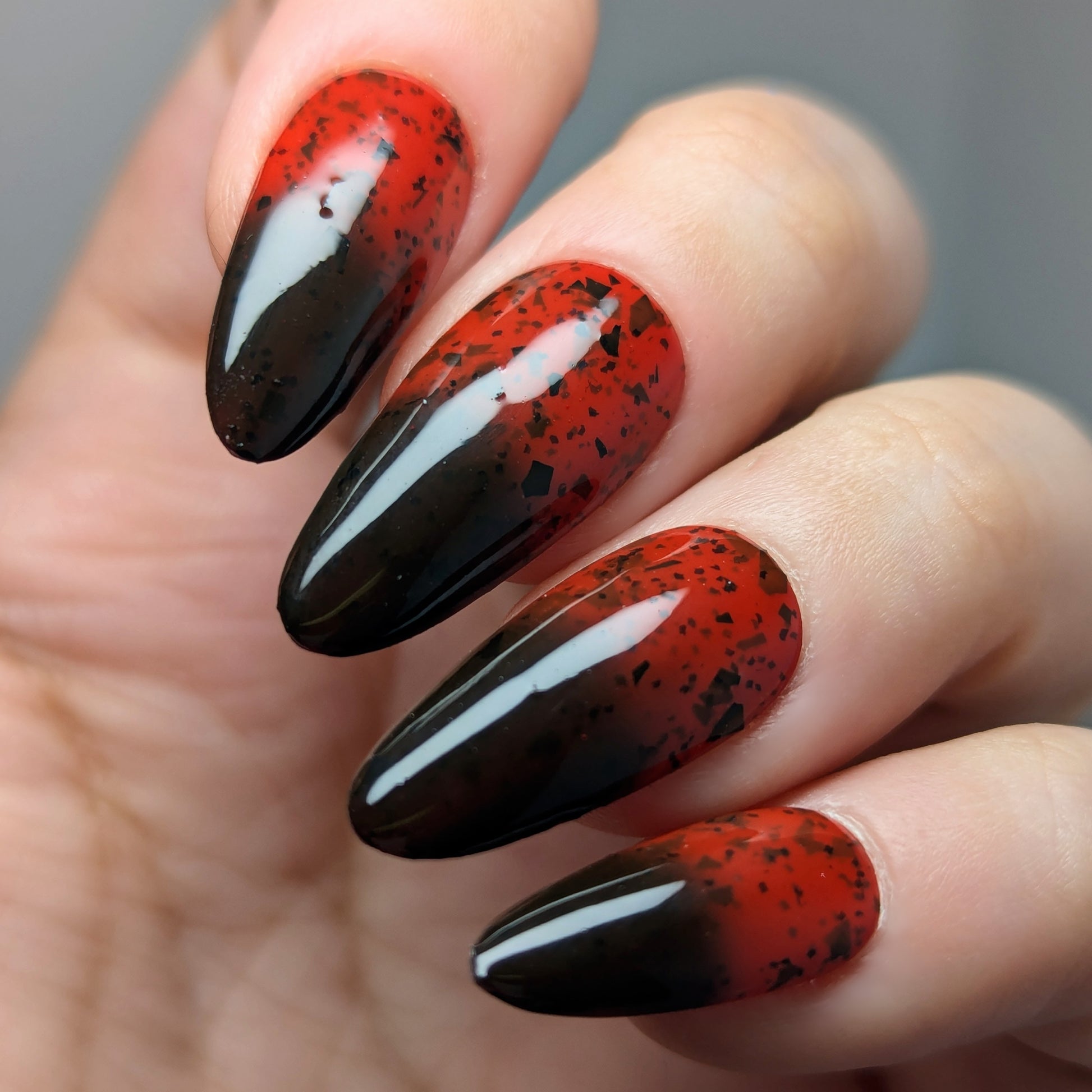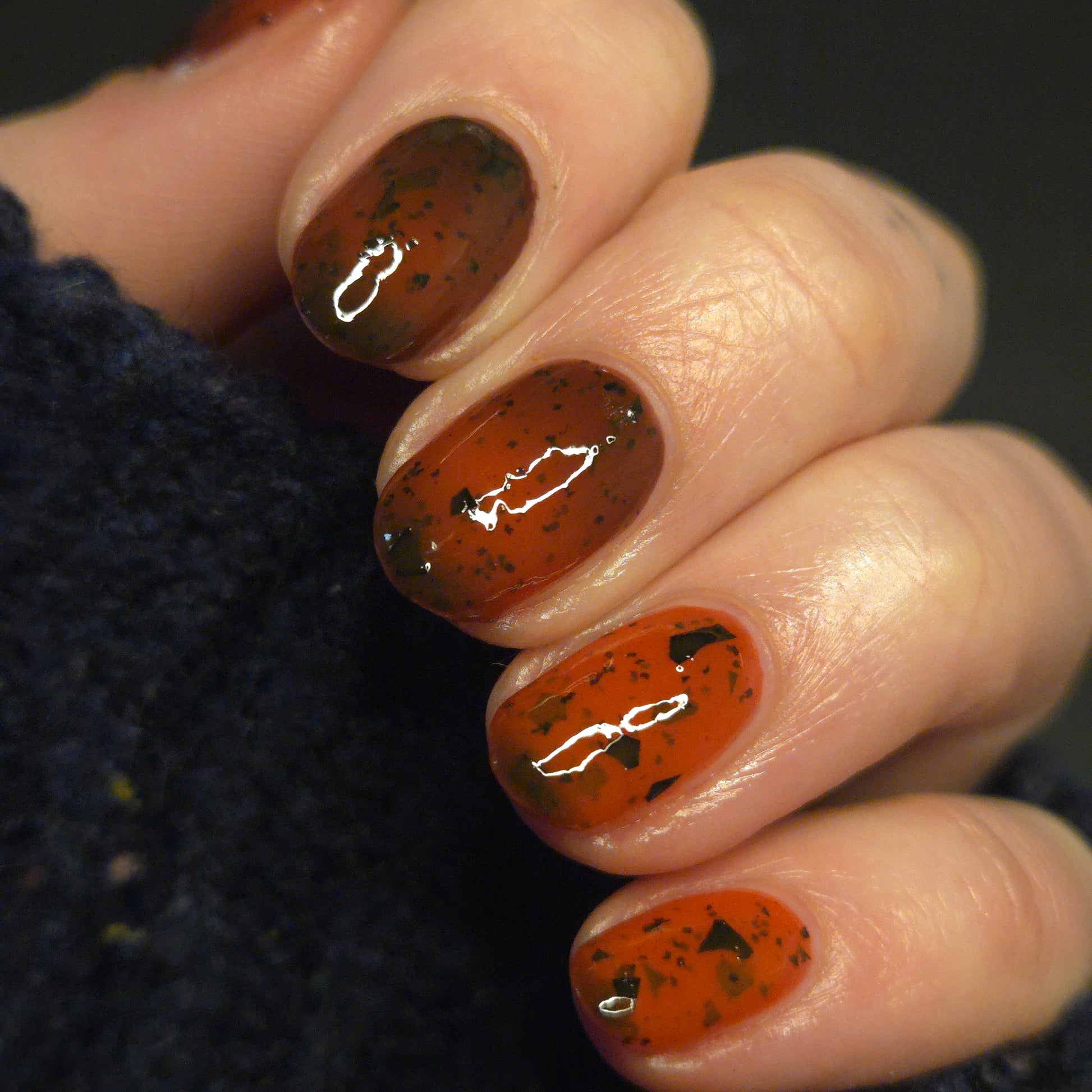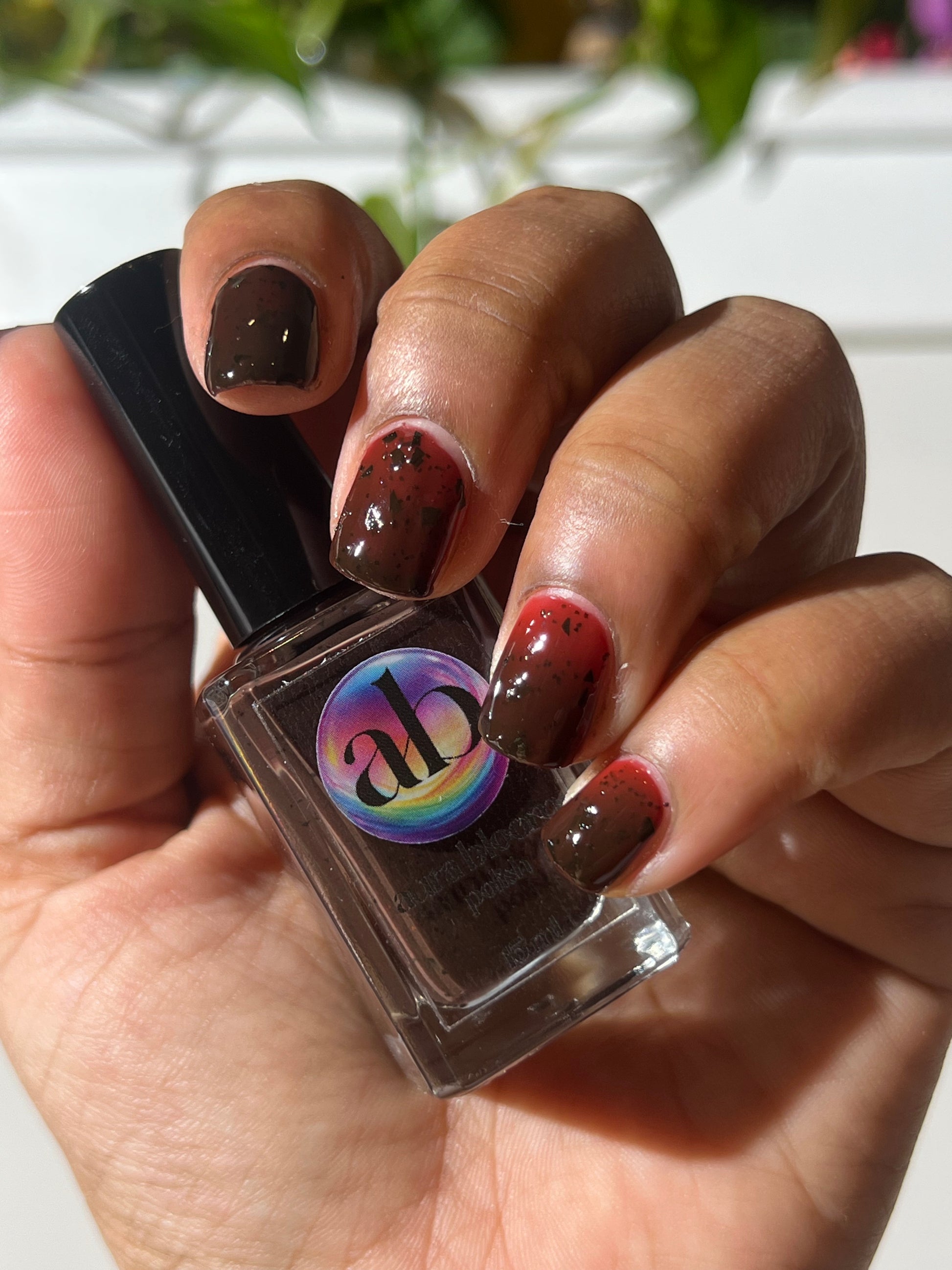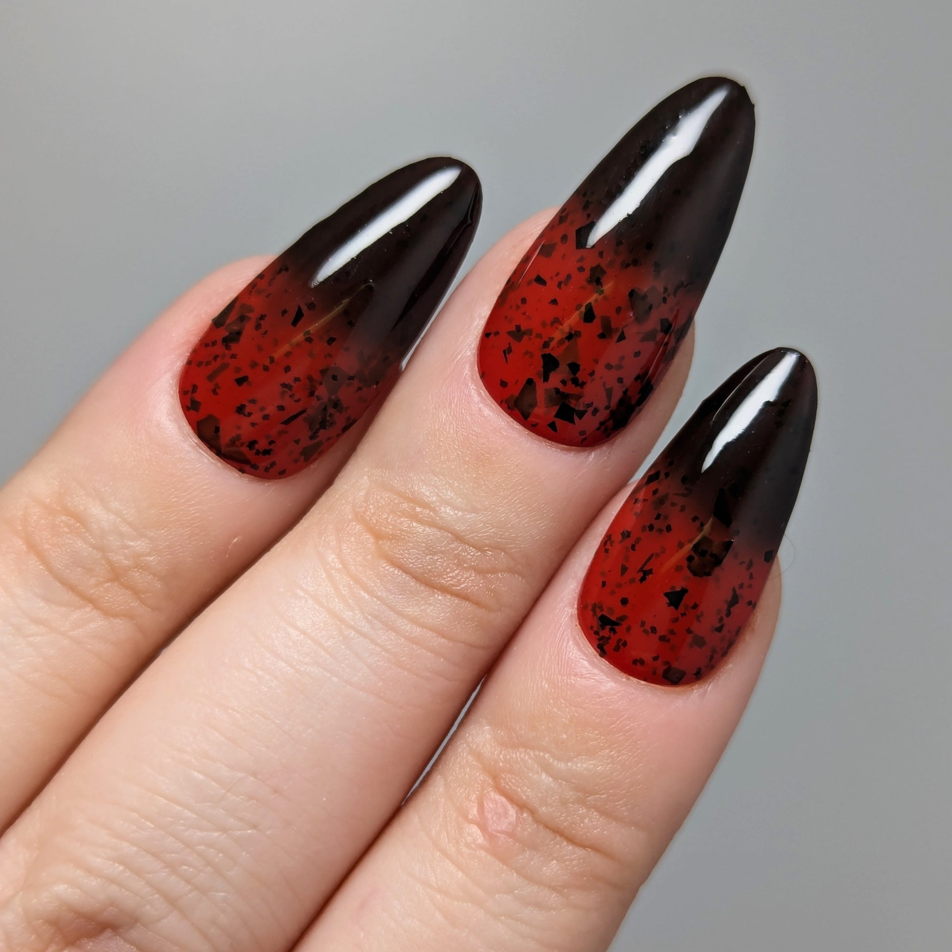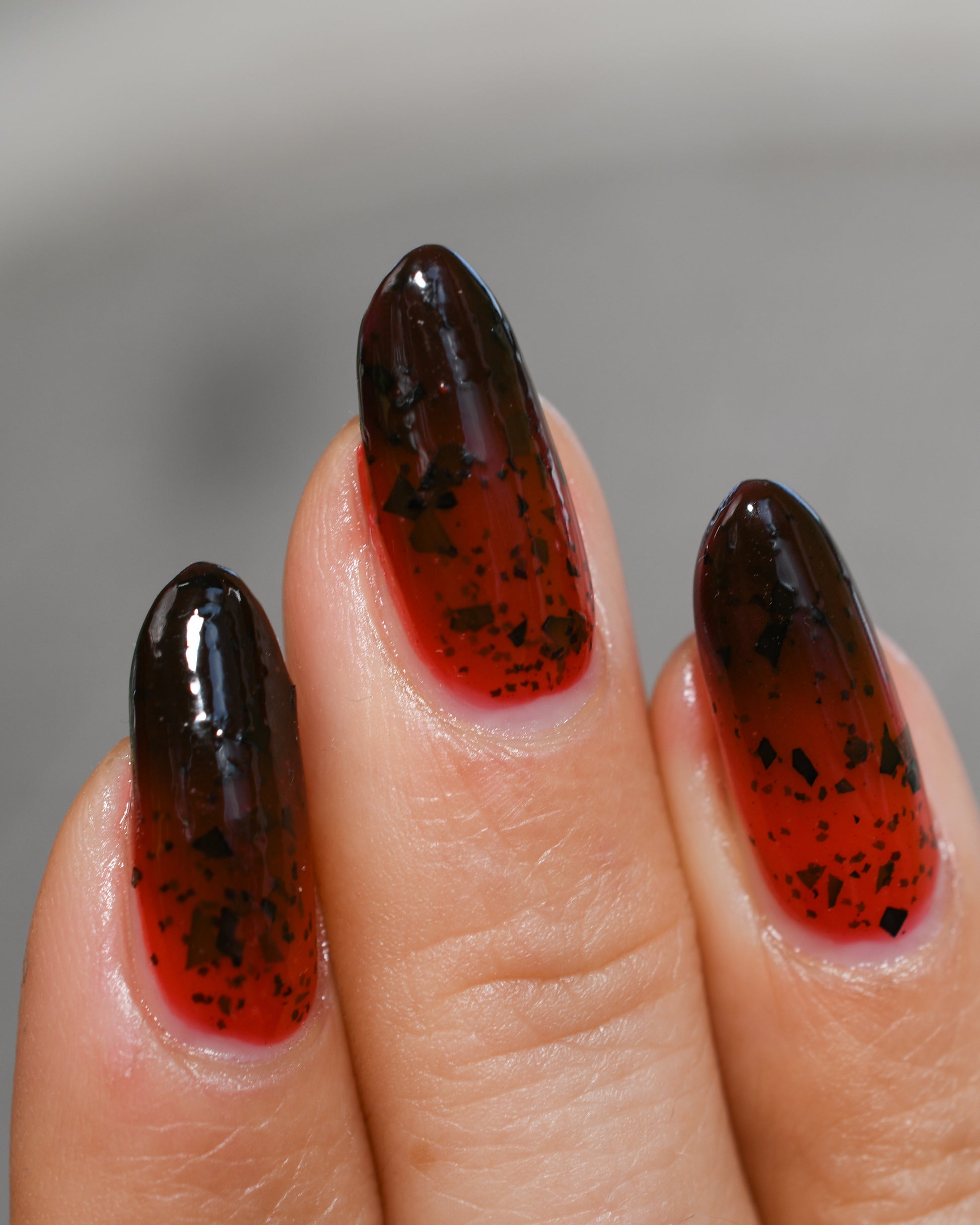 It's not me, it's you is a red to black thermal polish with small and large size black shreds *Please note, this polish may appear more of a blackish brown in some temps or lighting due to the composition of the thermal pigment*