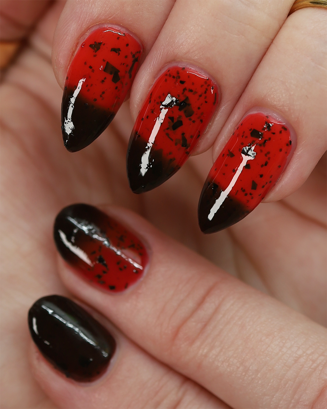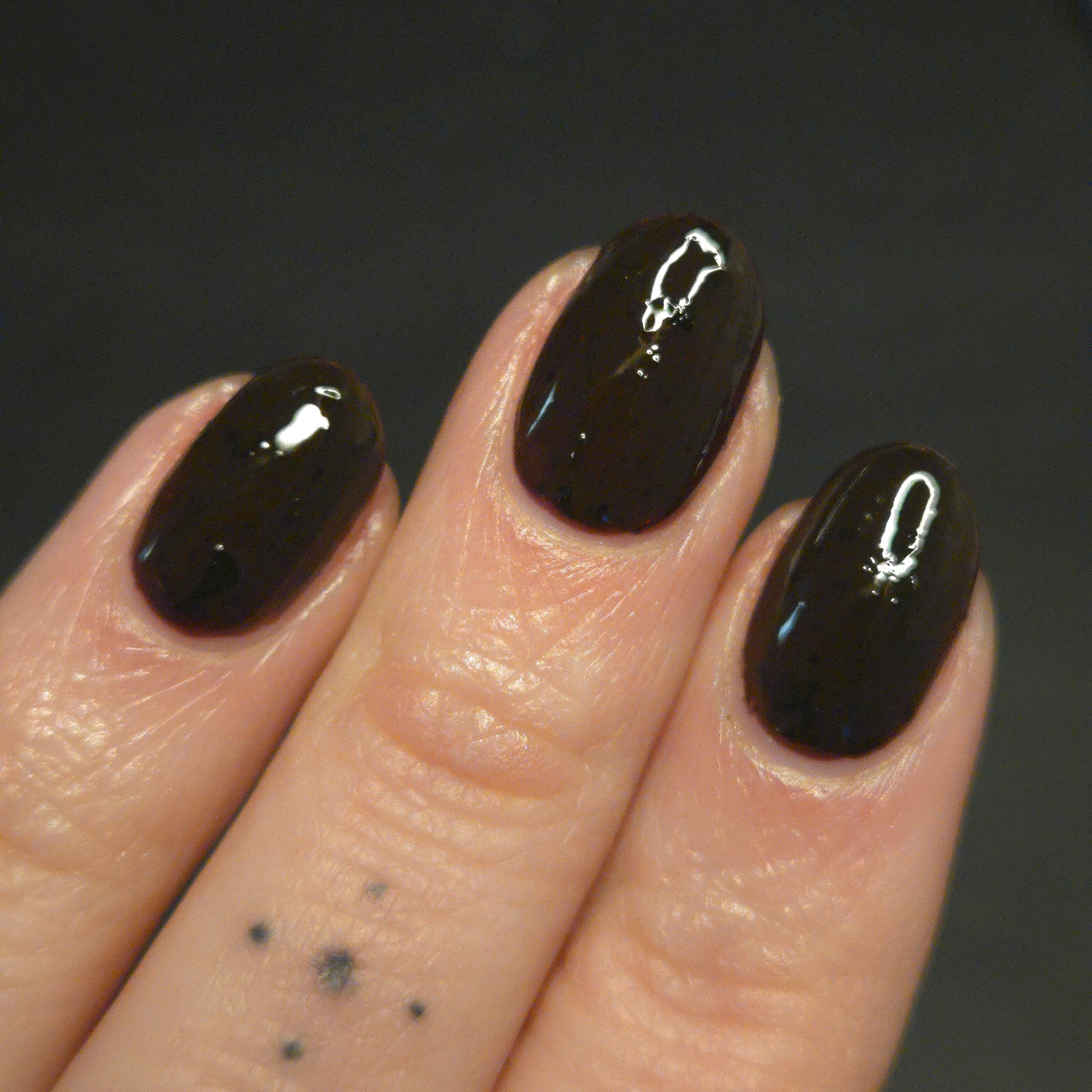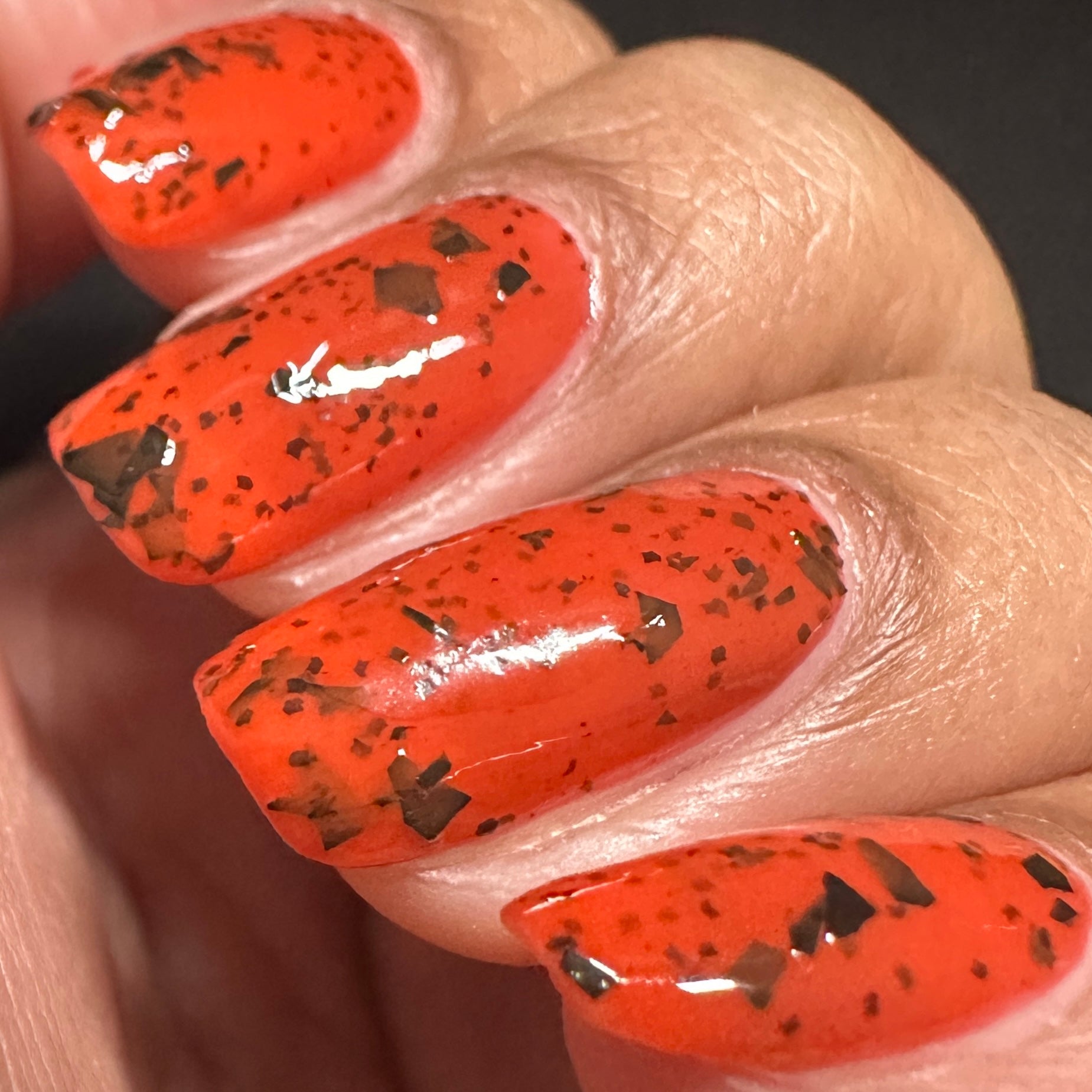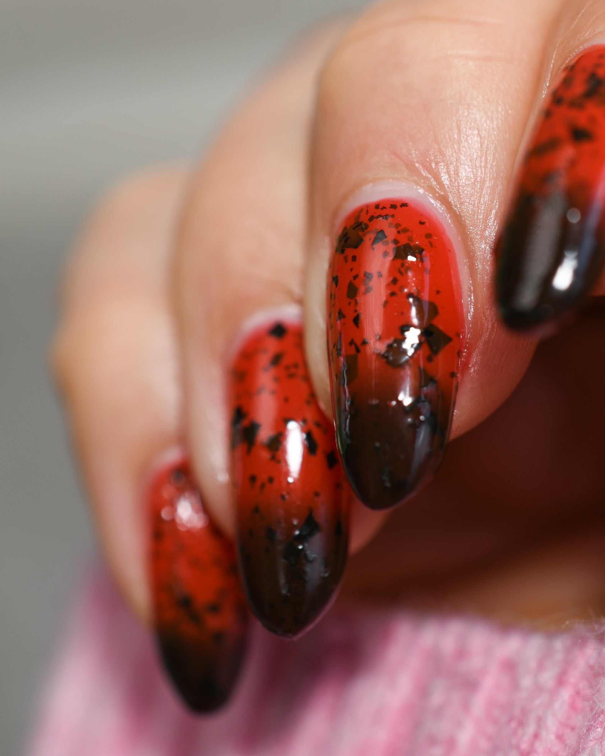 It's not me, it's you is a red to black thermal polish with small and large size black shreds *Please note, this polish may appear more of a blackish brown in some temps or lighting due to the composition of the thermal pigment*