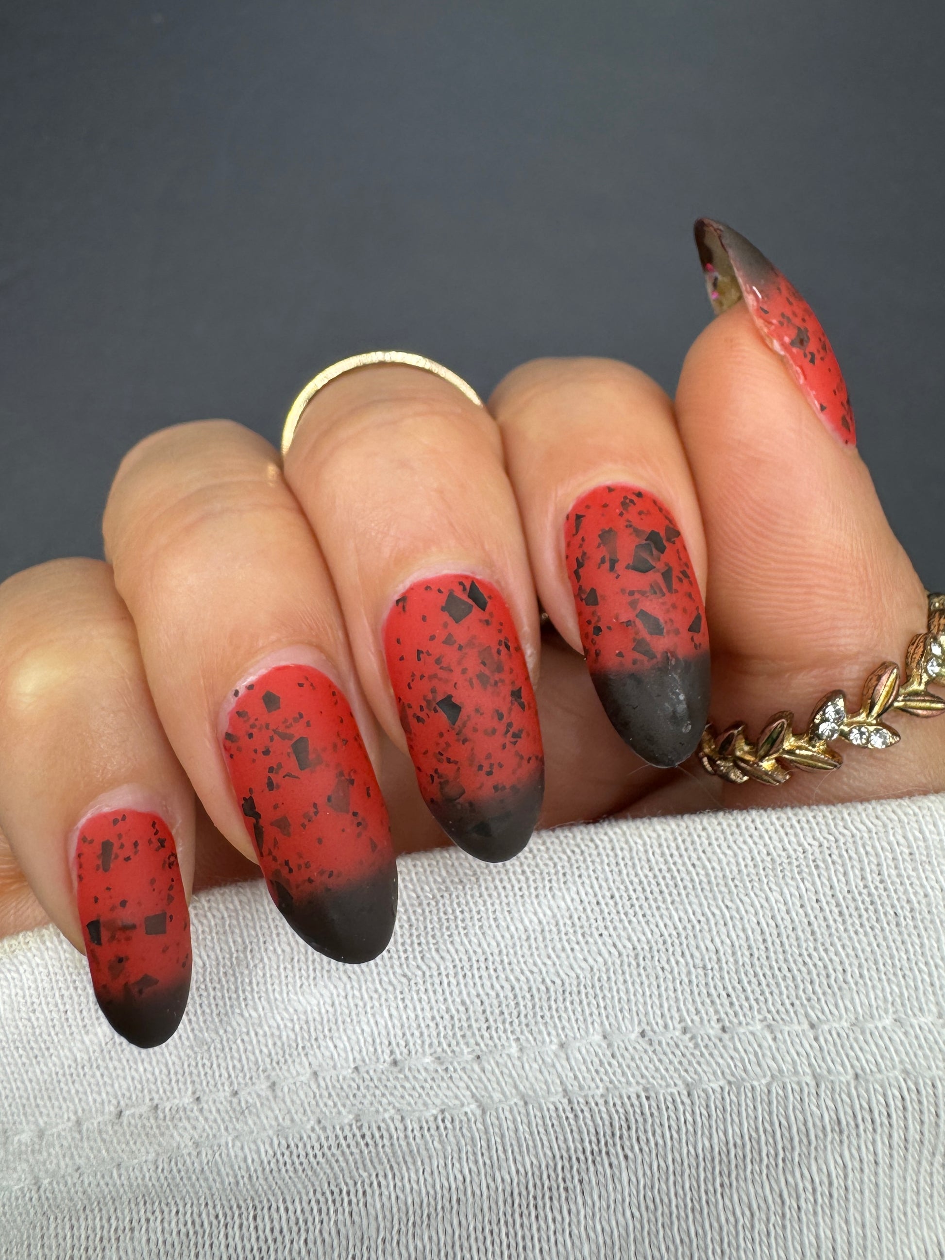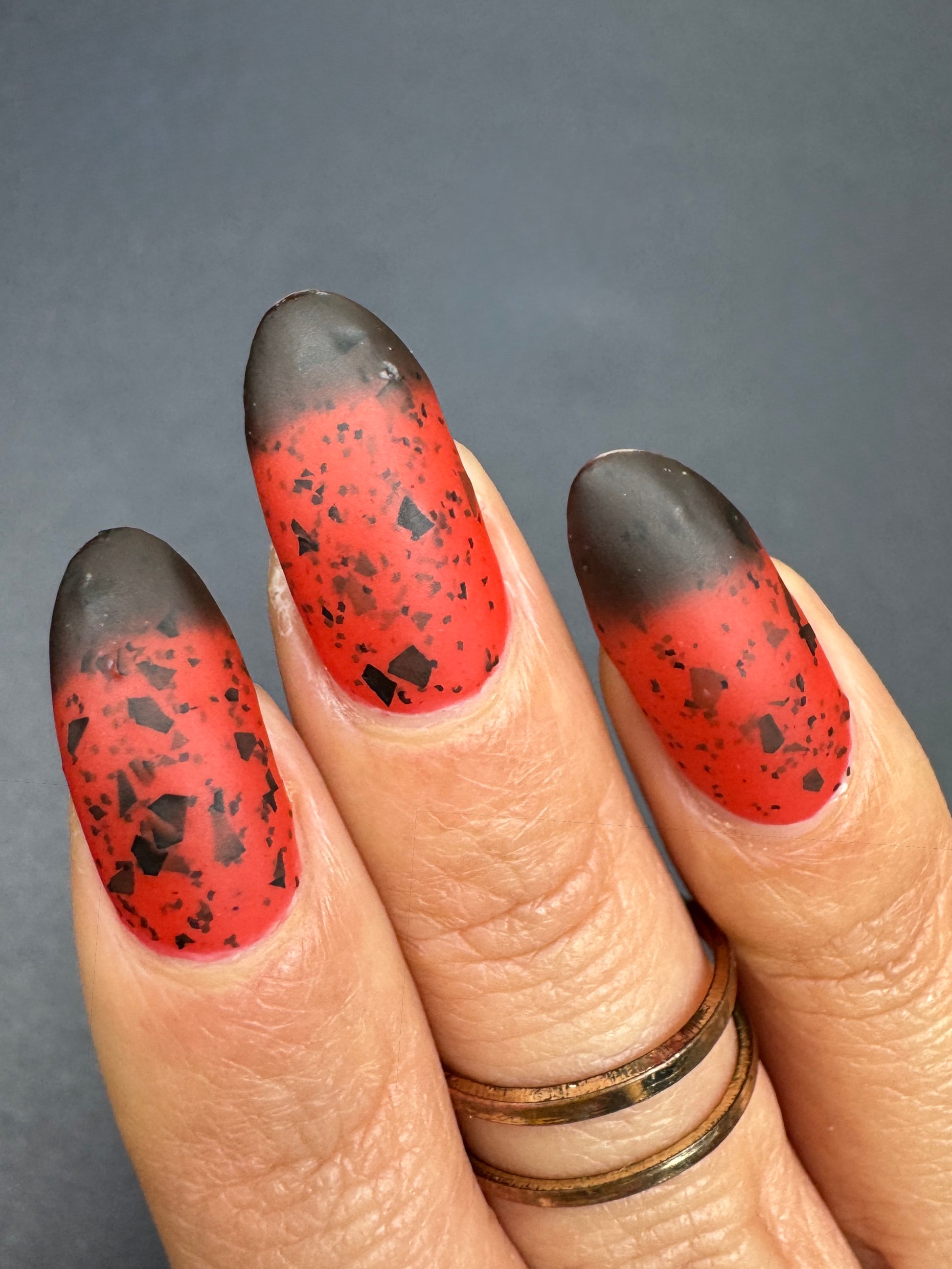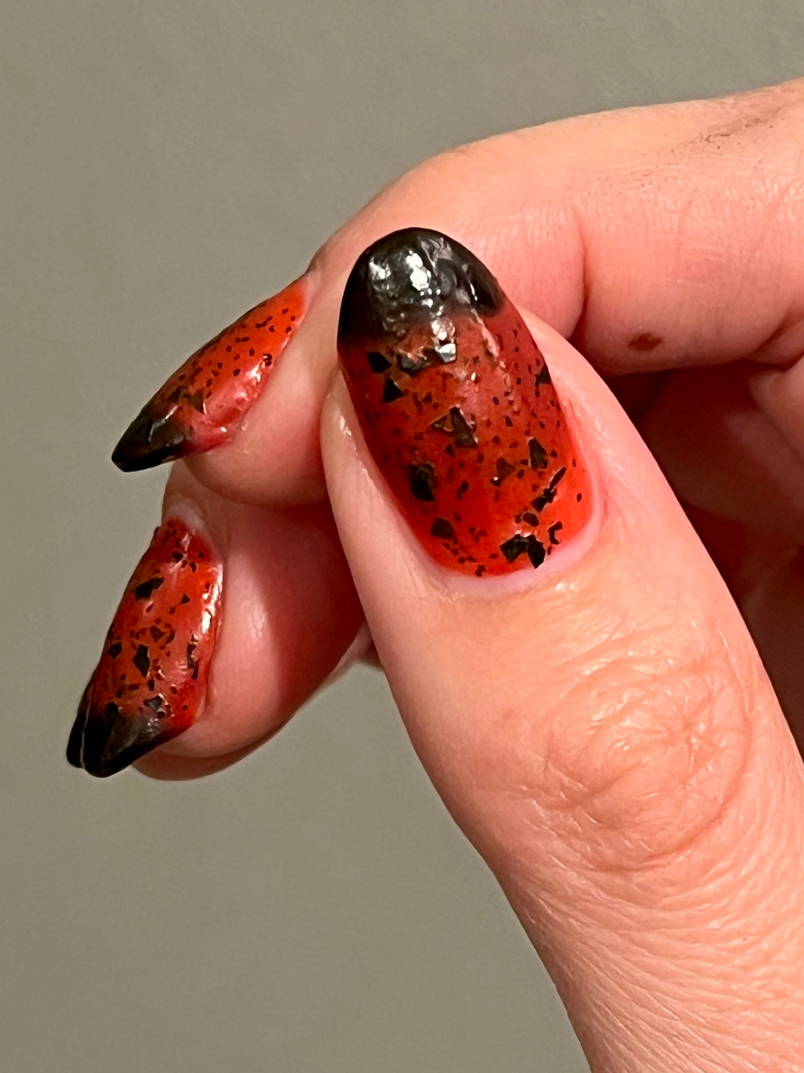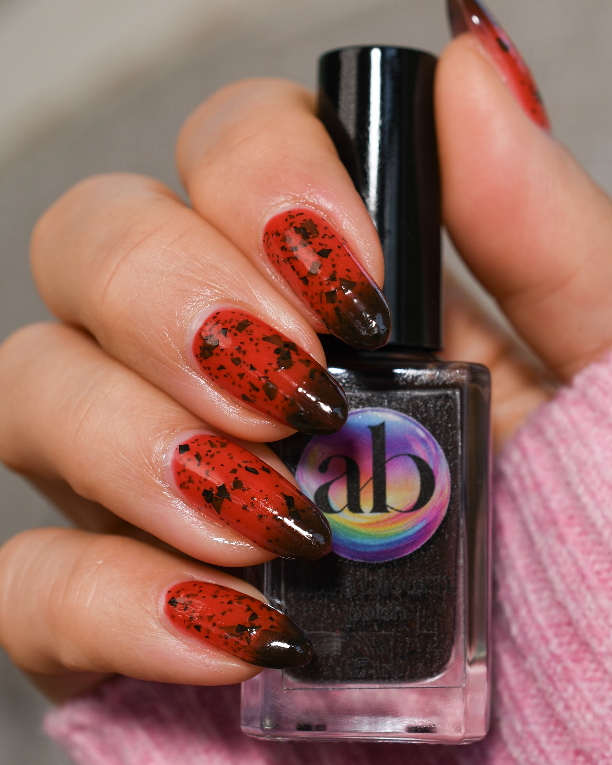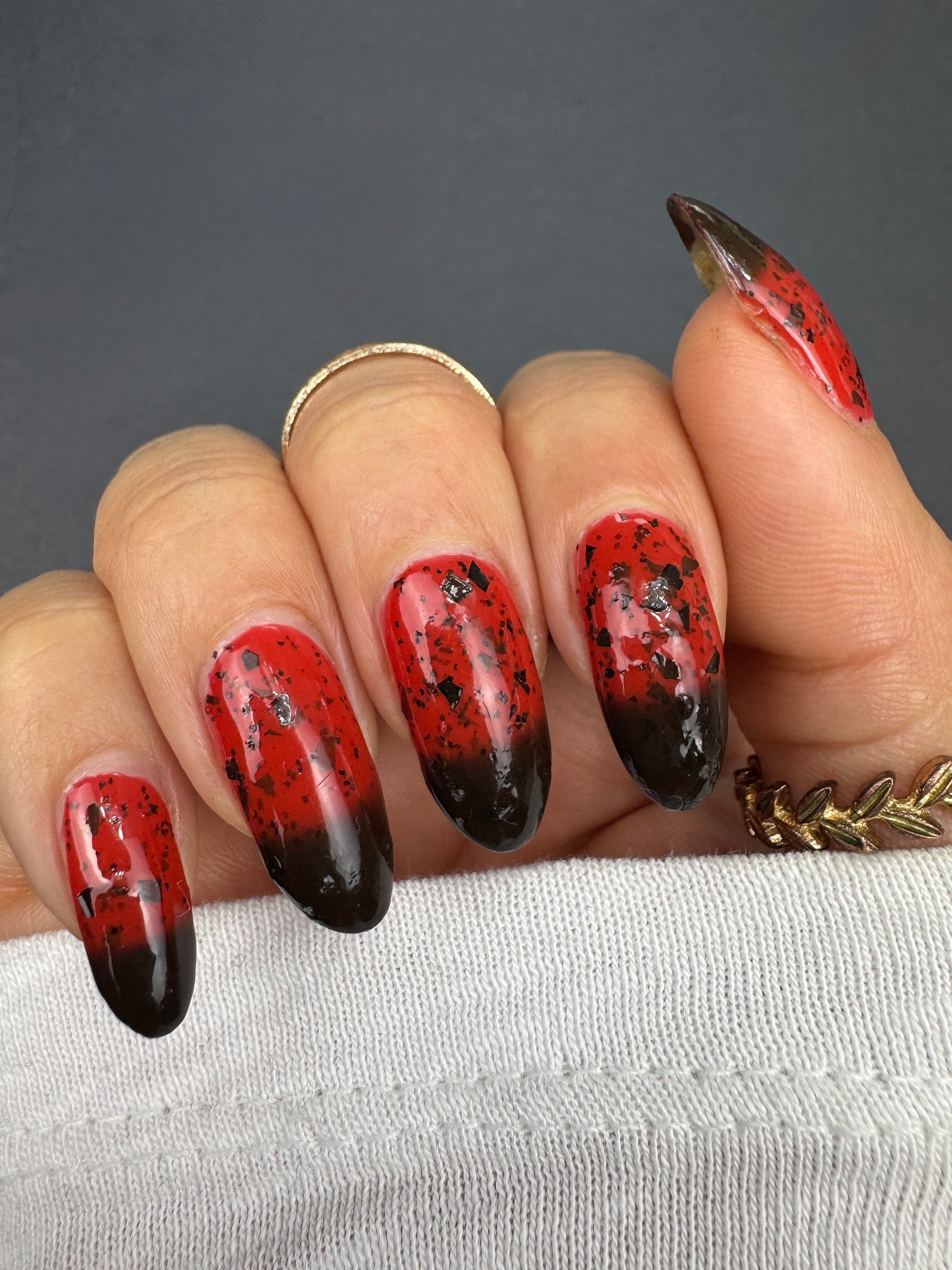 It's not me, it's you is a red to black thermal polish with small and large size black shreds *Please note, this polish may appear more of a blackish brown in some temps or lighting due to the composition of the thermal pigment*