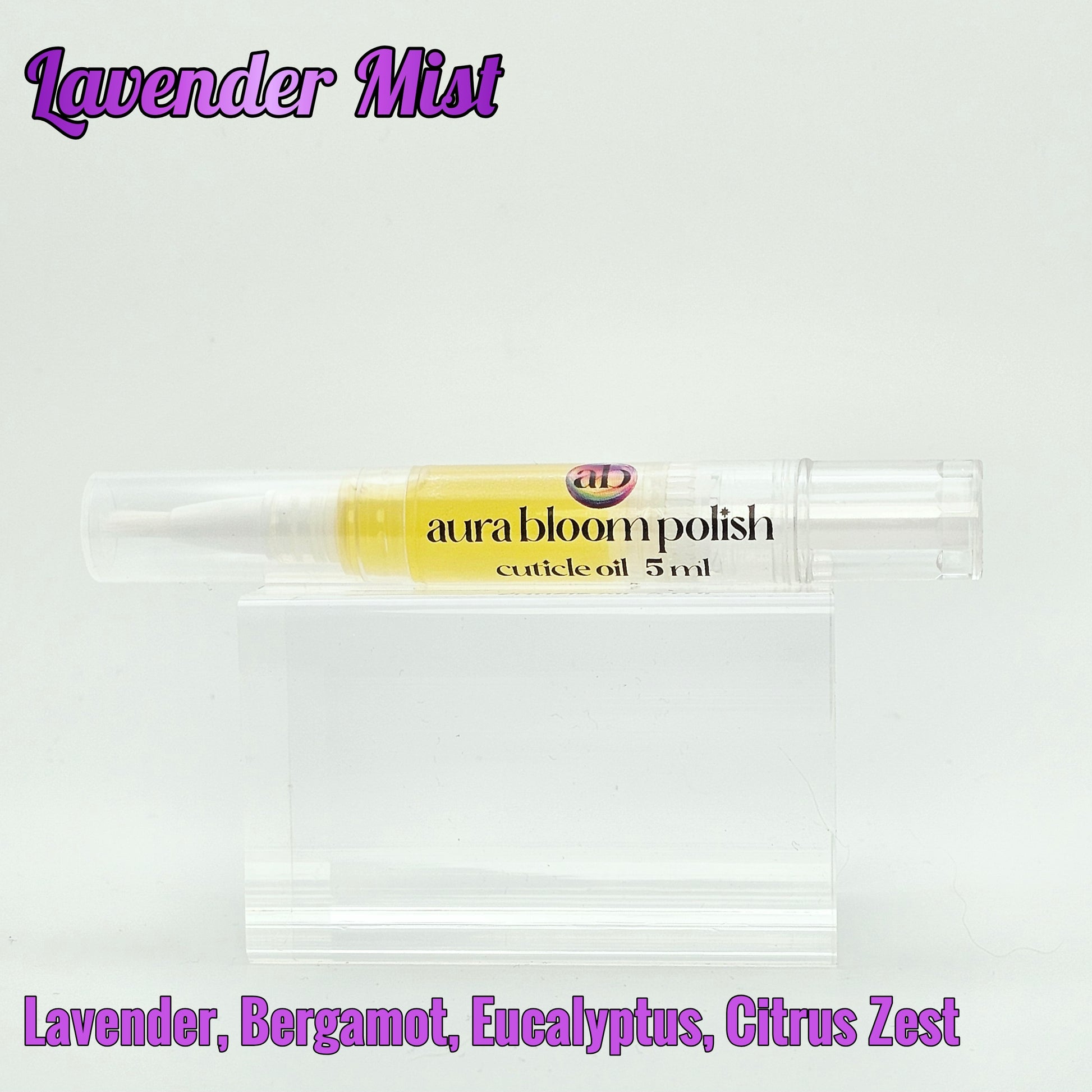 Lavender Mist Cuticle Oil is lavender scented with notes of bergamot, eucalyptus, citrus zest, and lily of the valley.