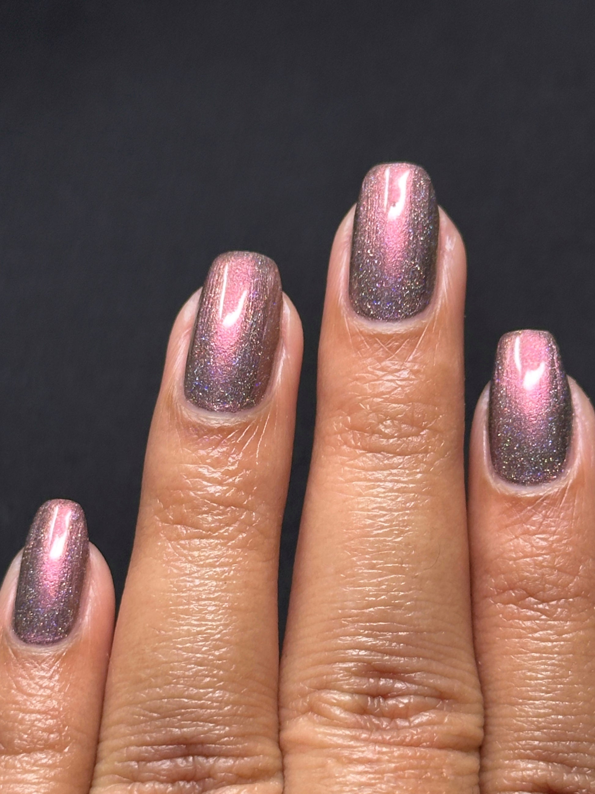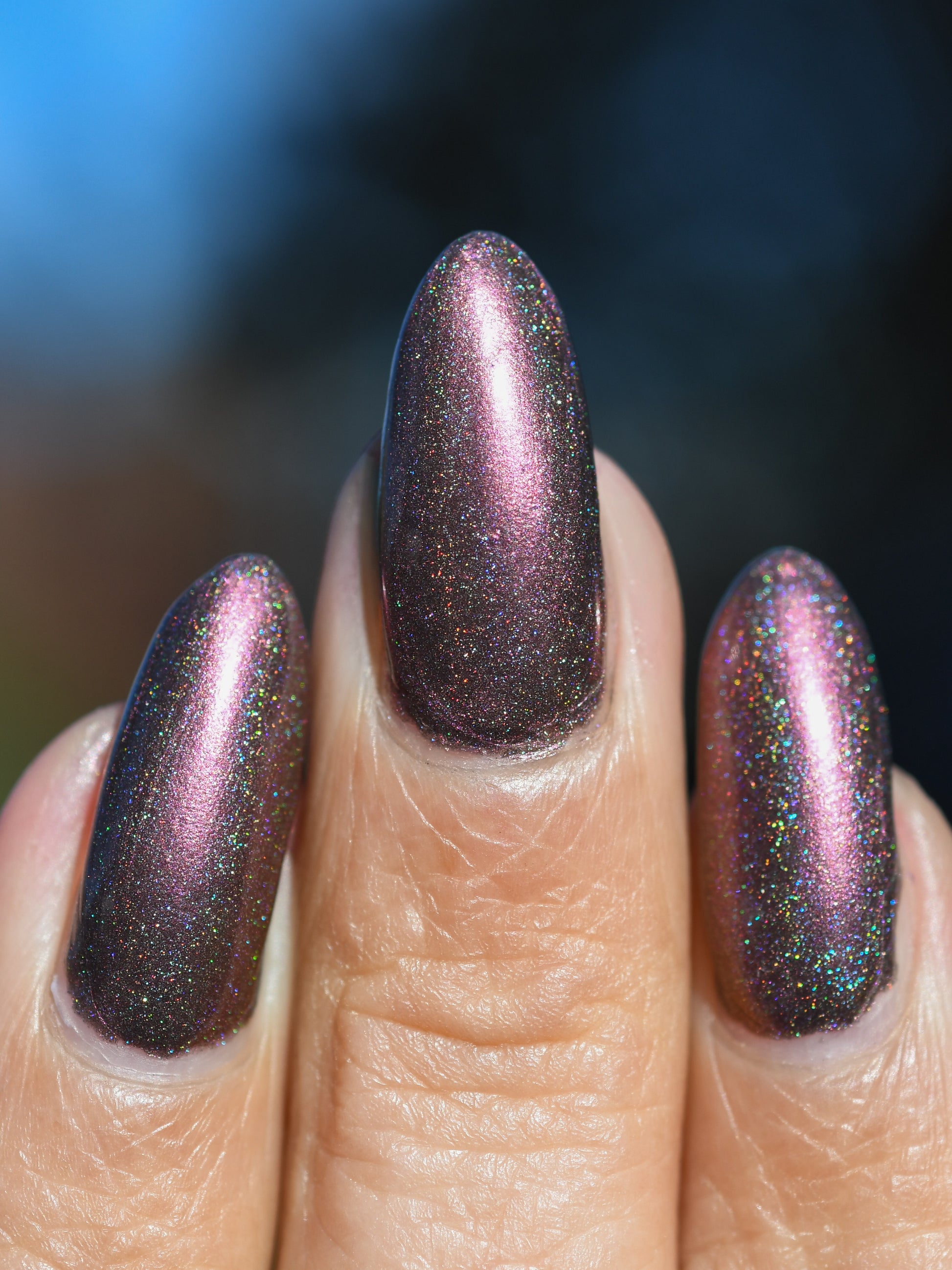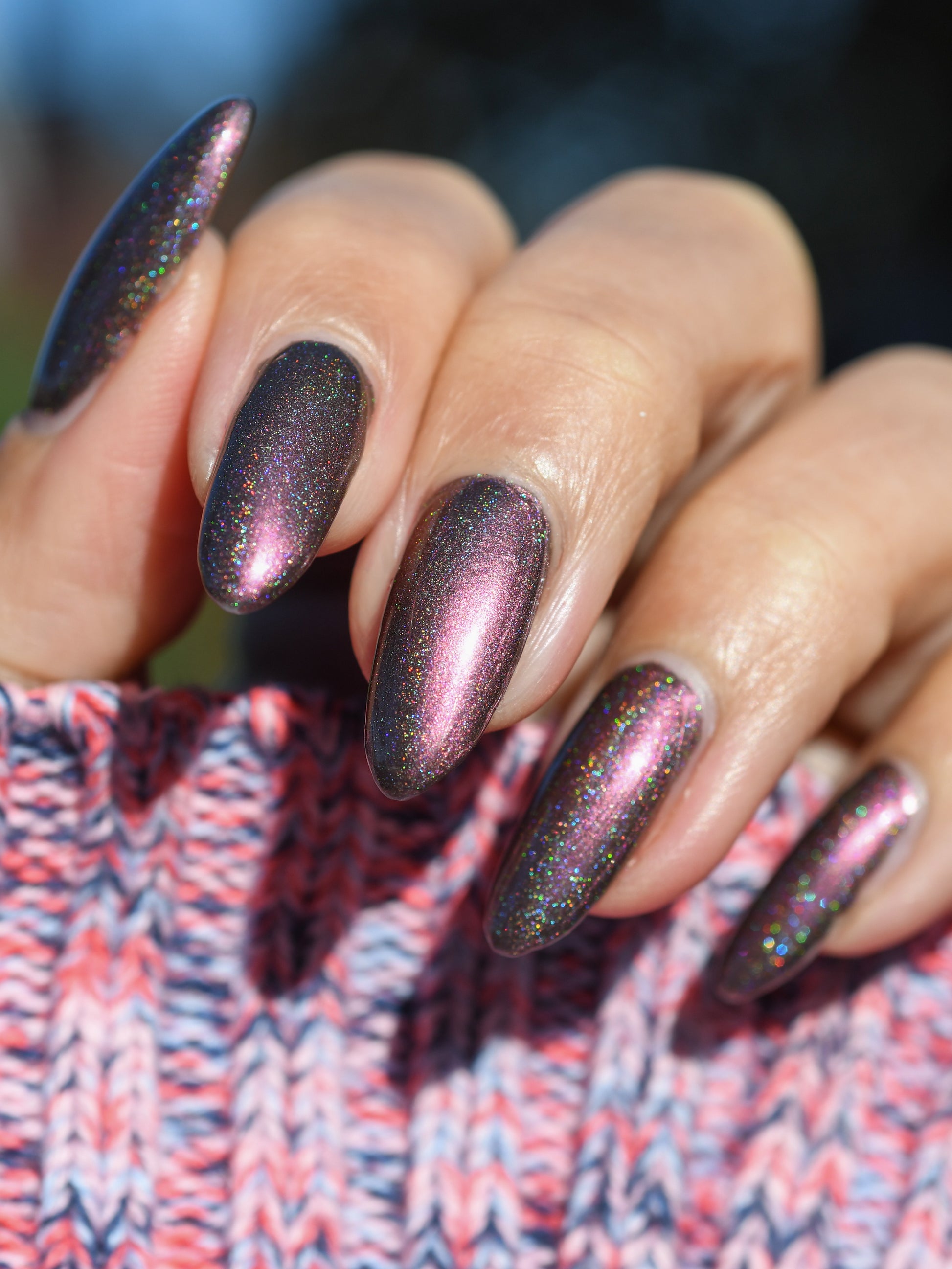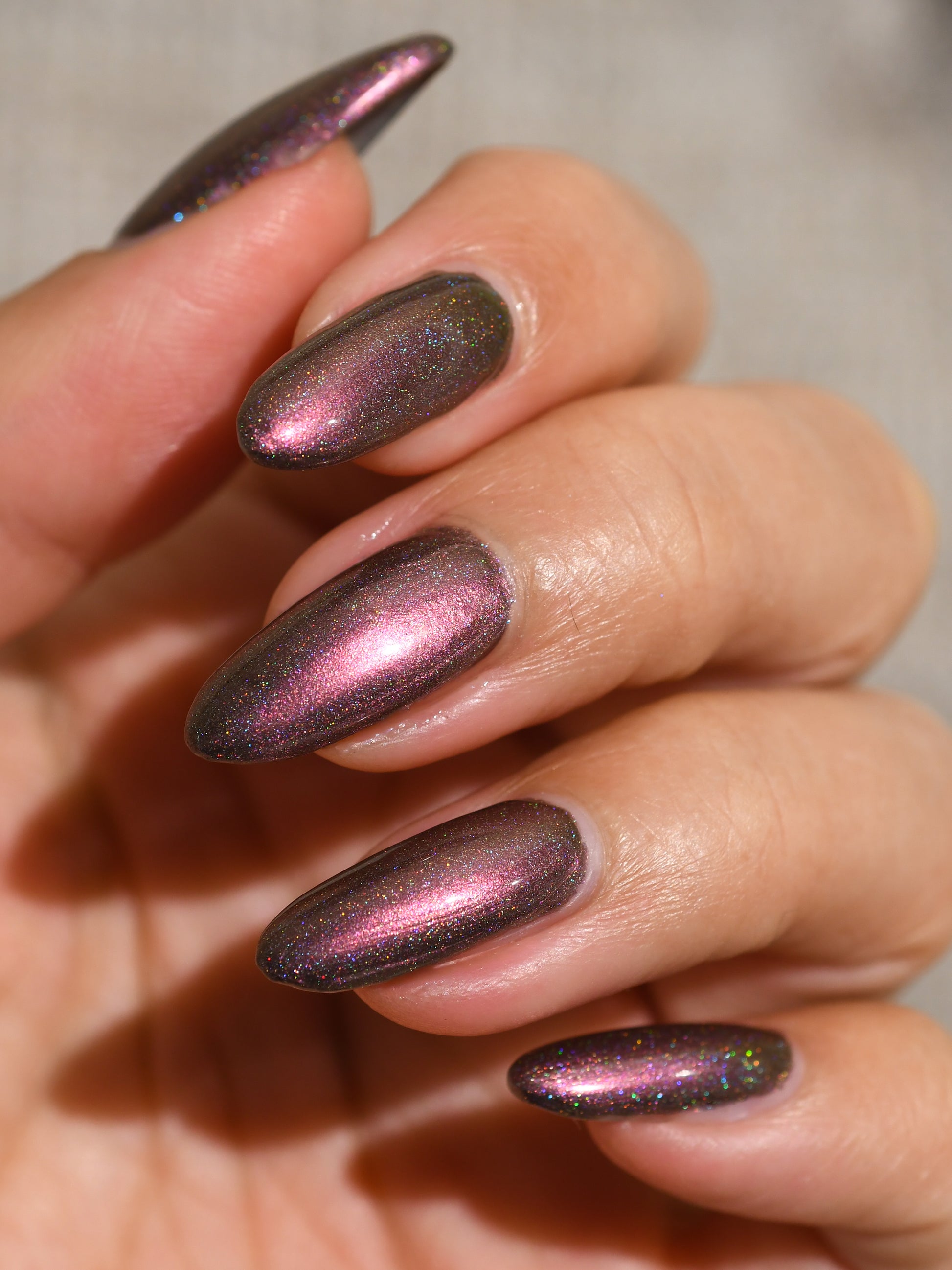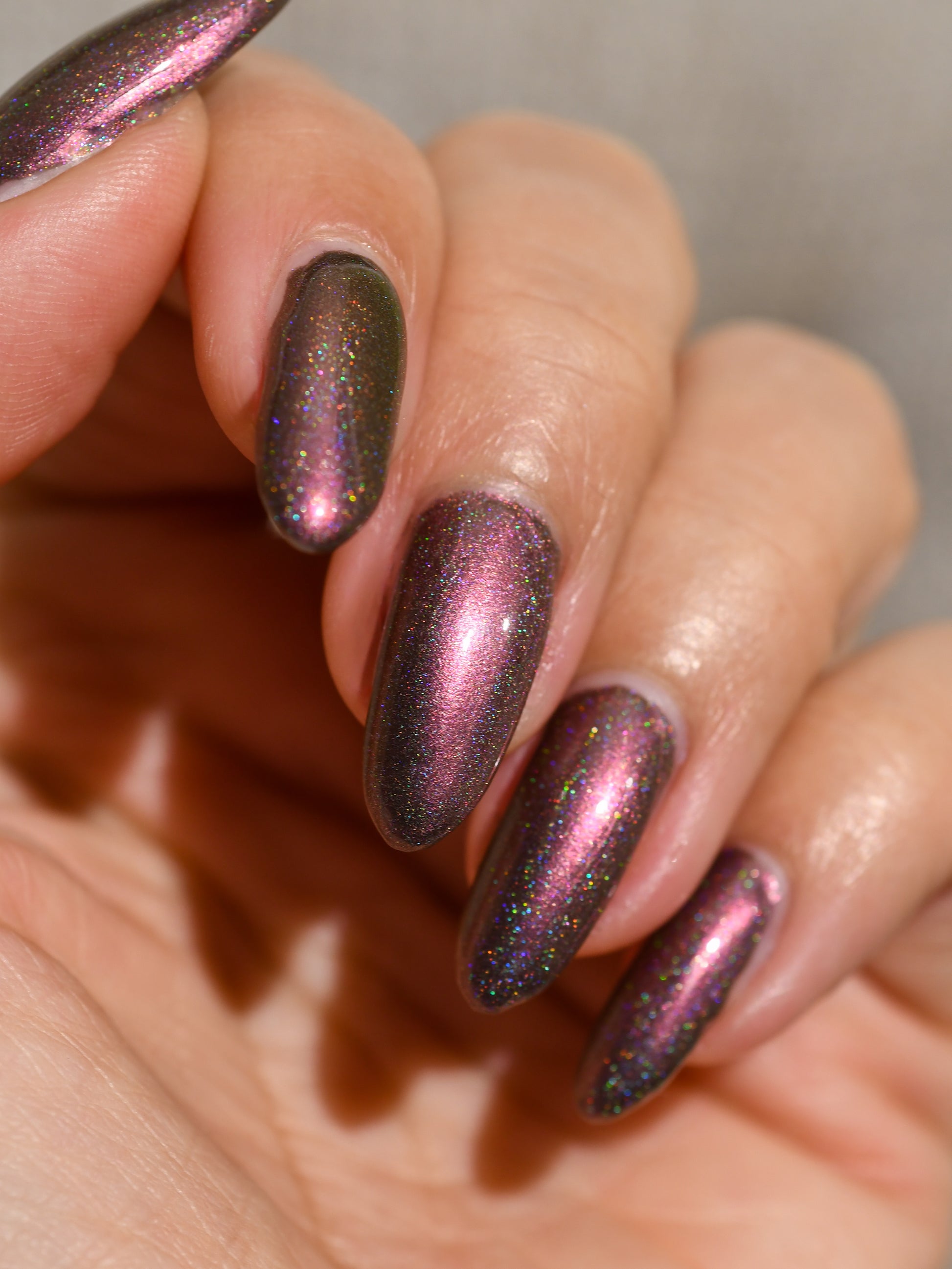 Runic Rouge is a brownish black linear holographic polish with a maroon red pearlescent shimmer.