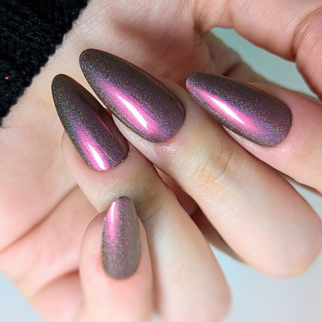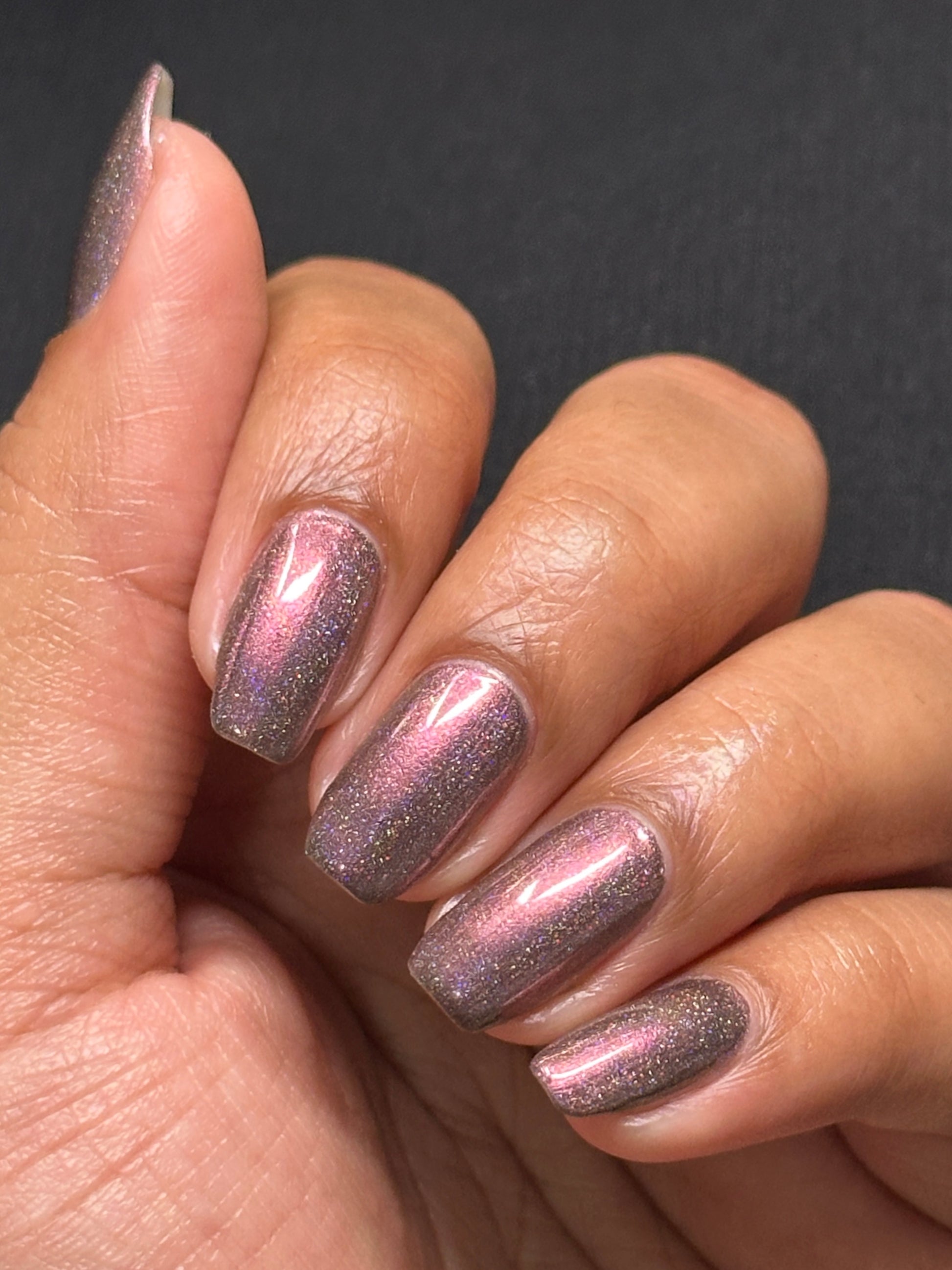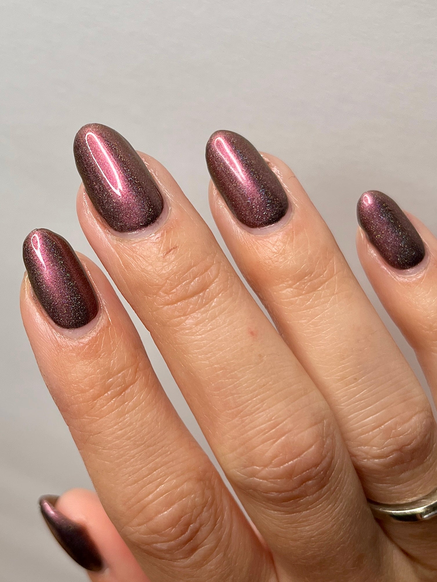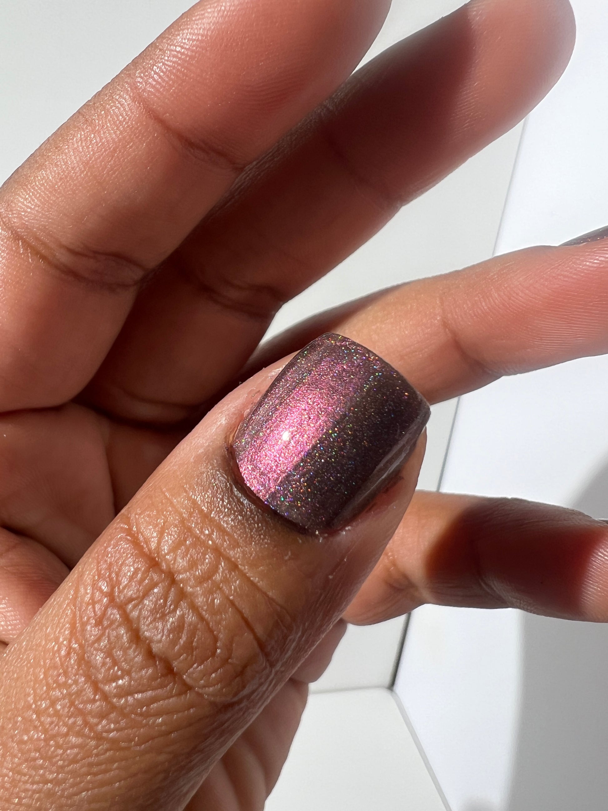 Runic Rouge is a brownish black linear holographic polish with a maroon red pearlescent shimmer.