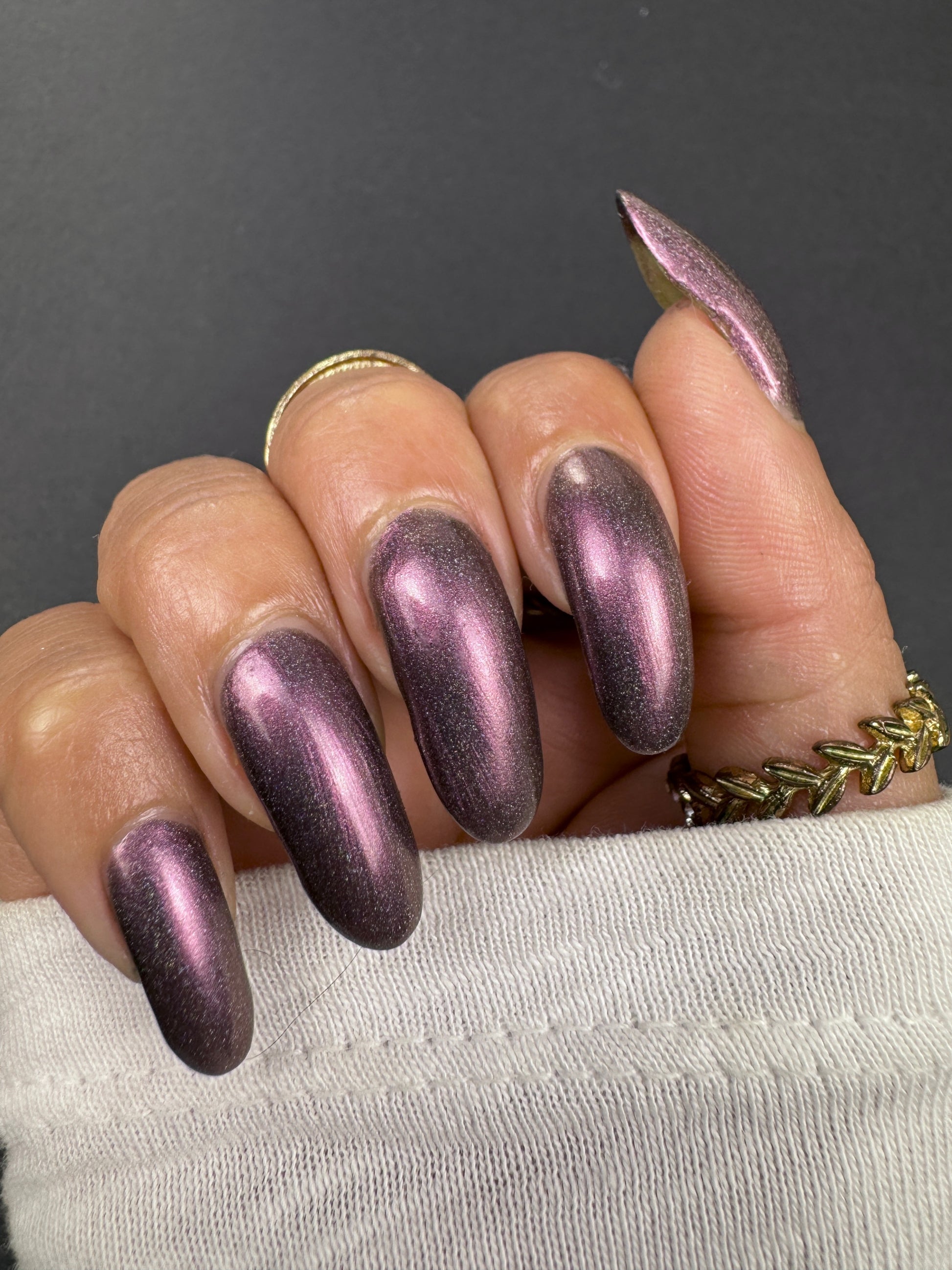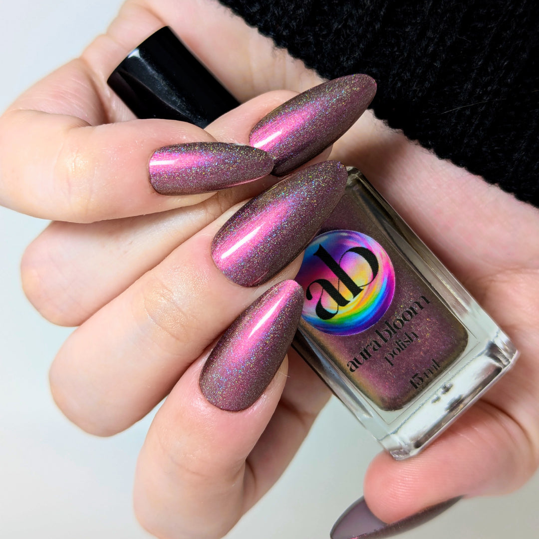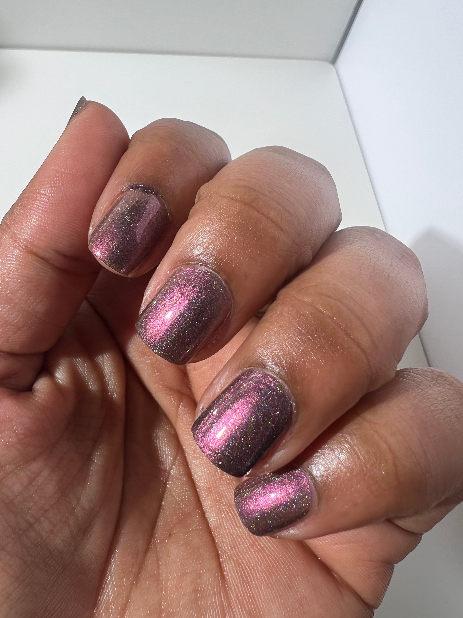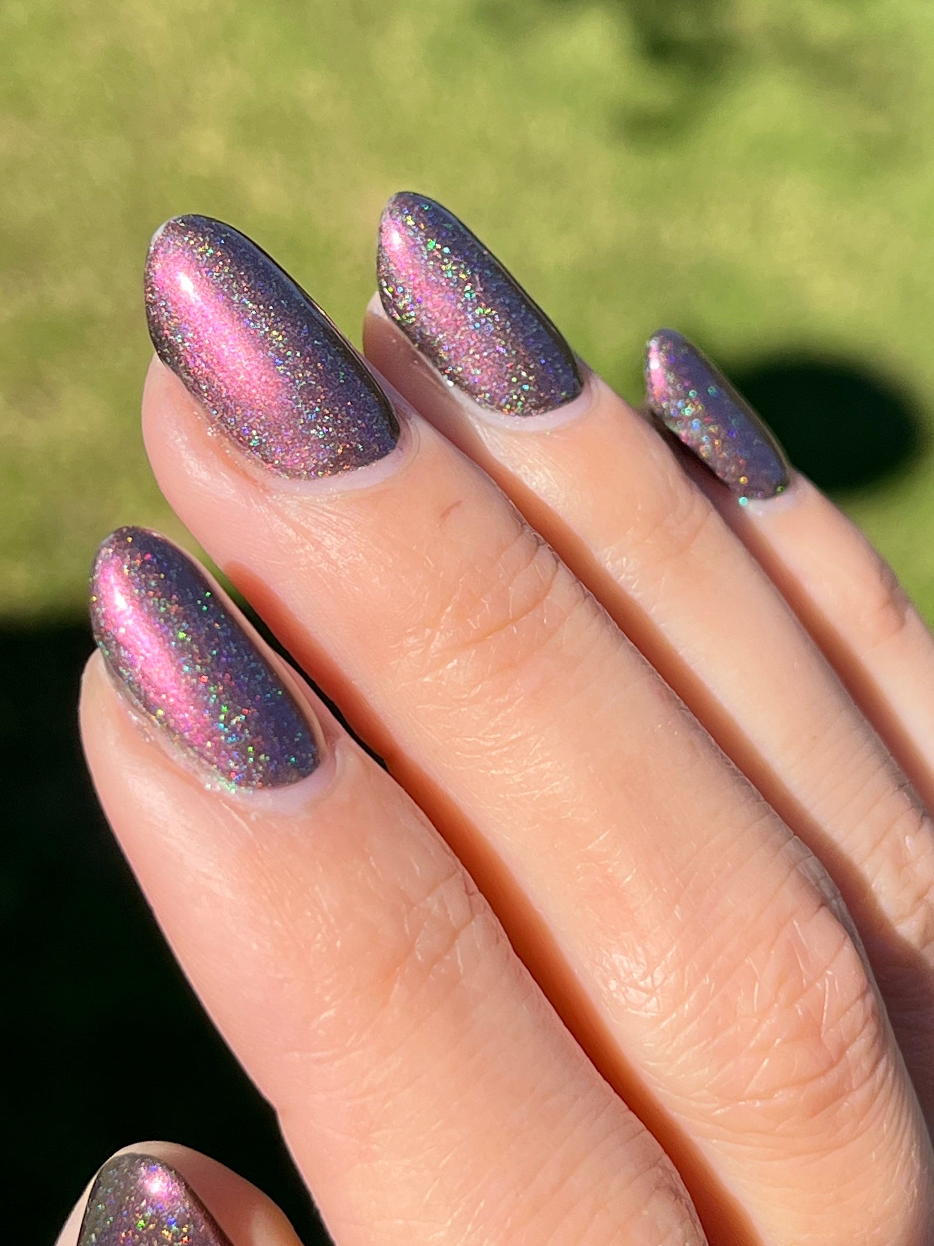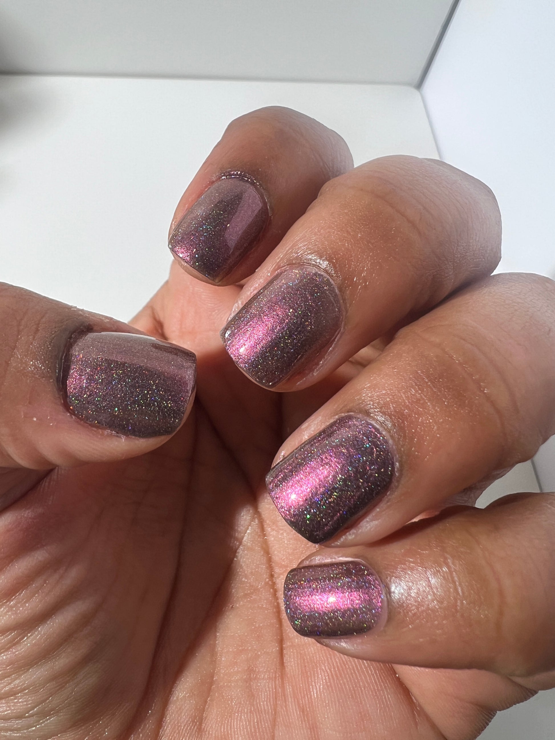 Runic Rouge is a brownish black linear holographic polish with a maroon red pearlescent shimmer.
