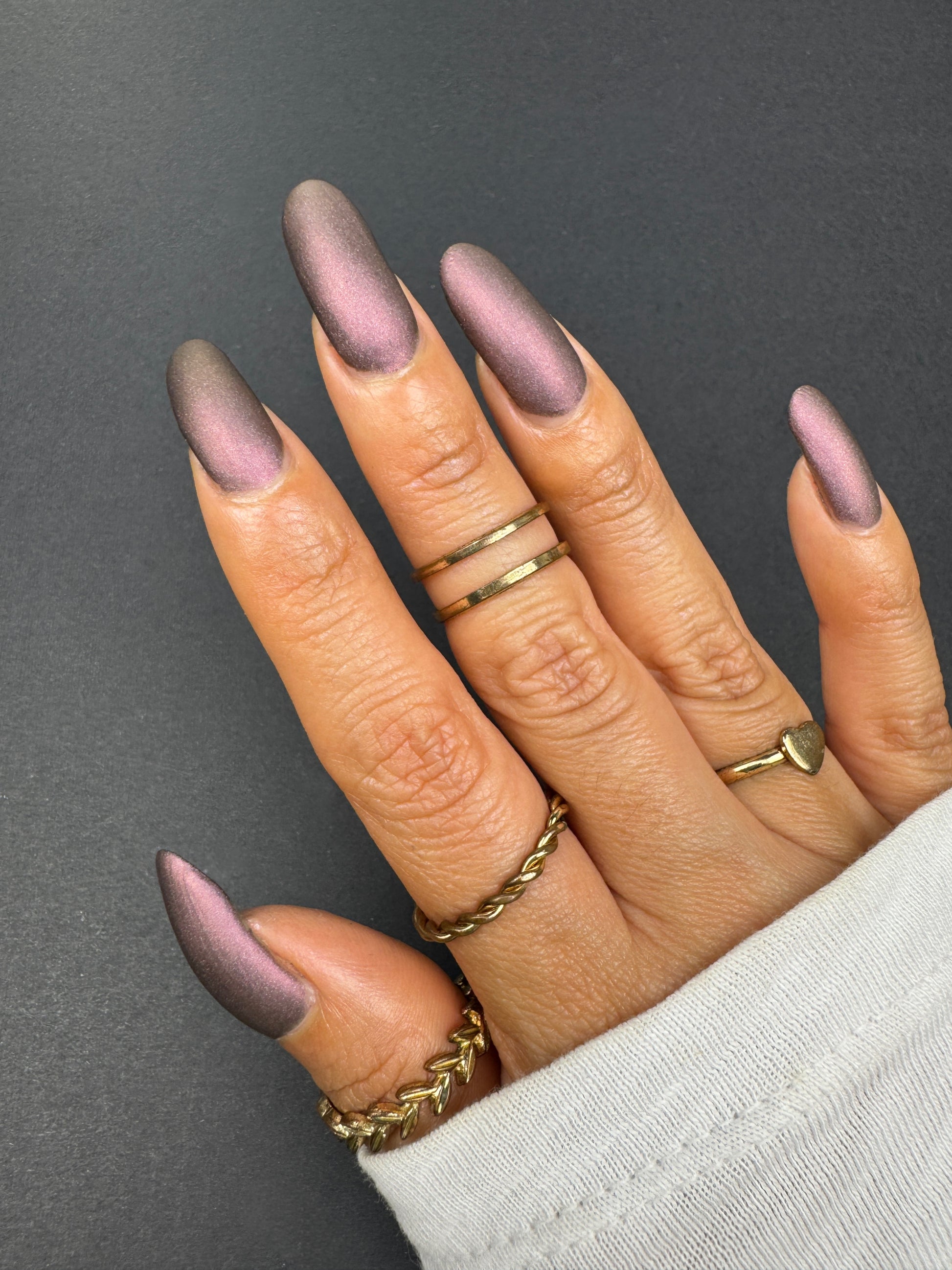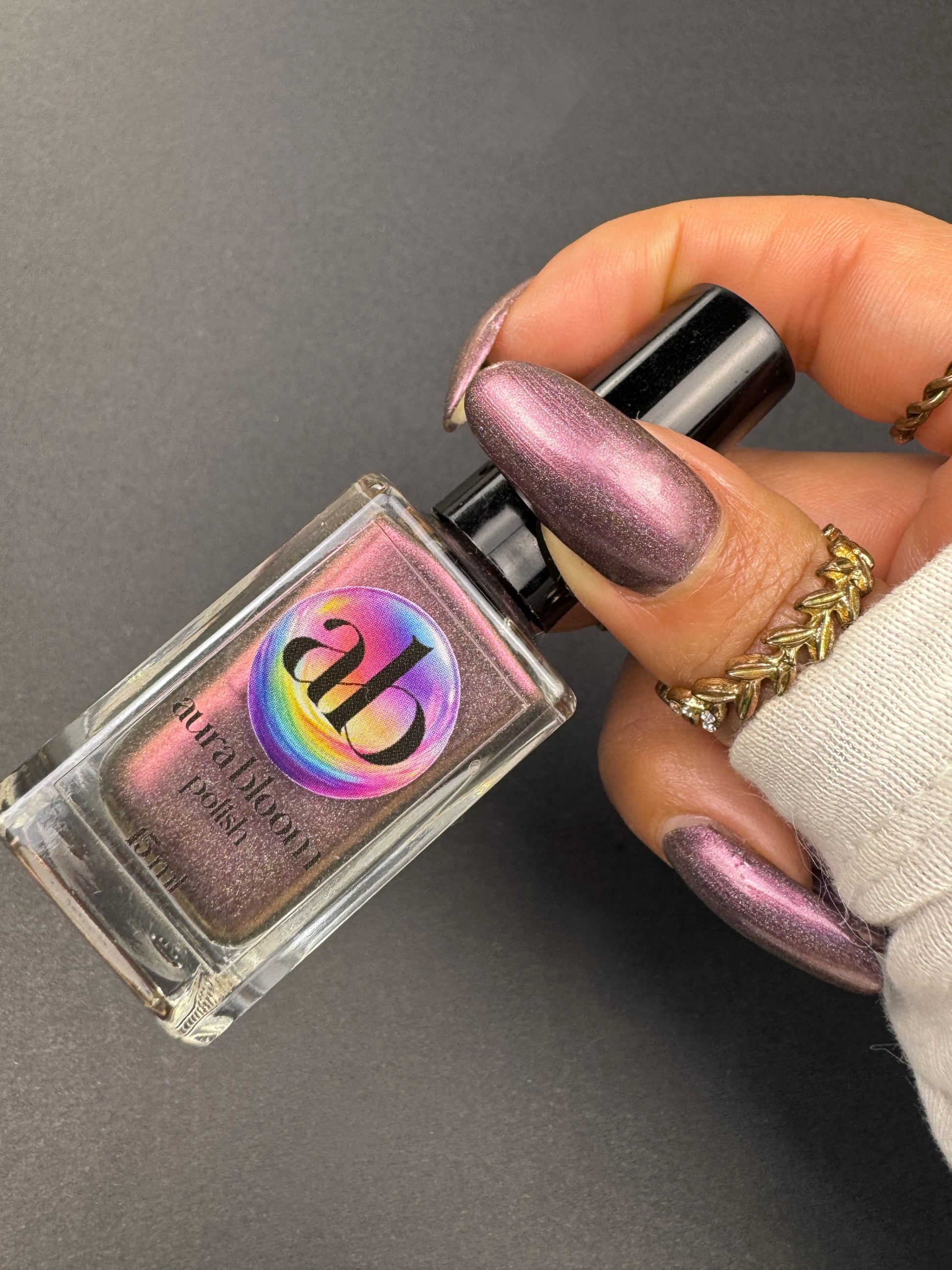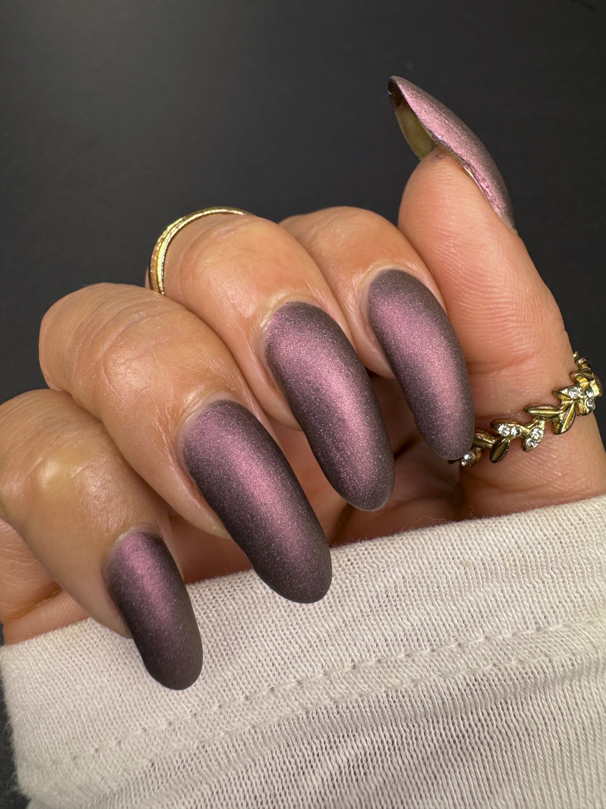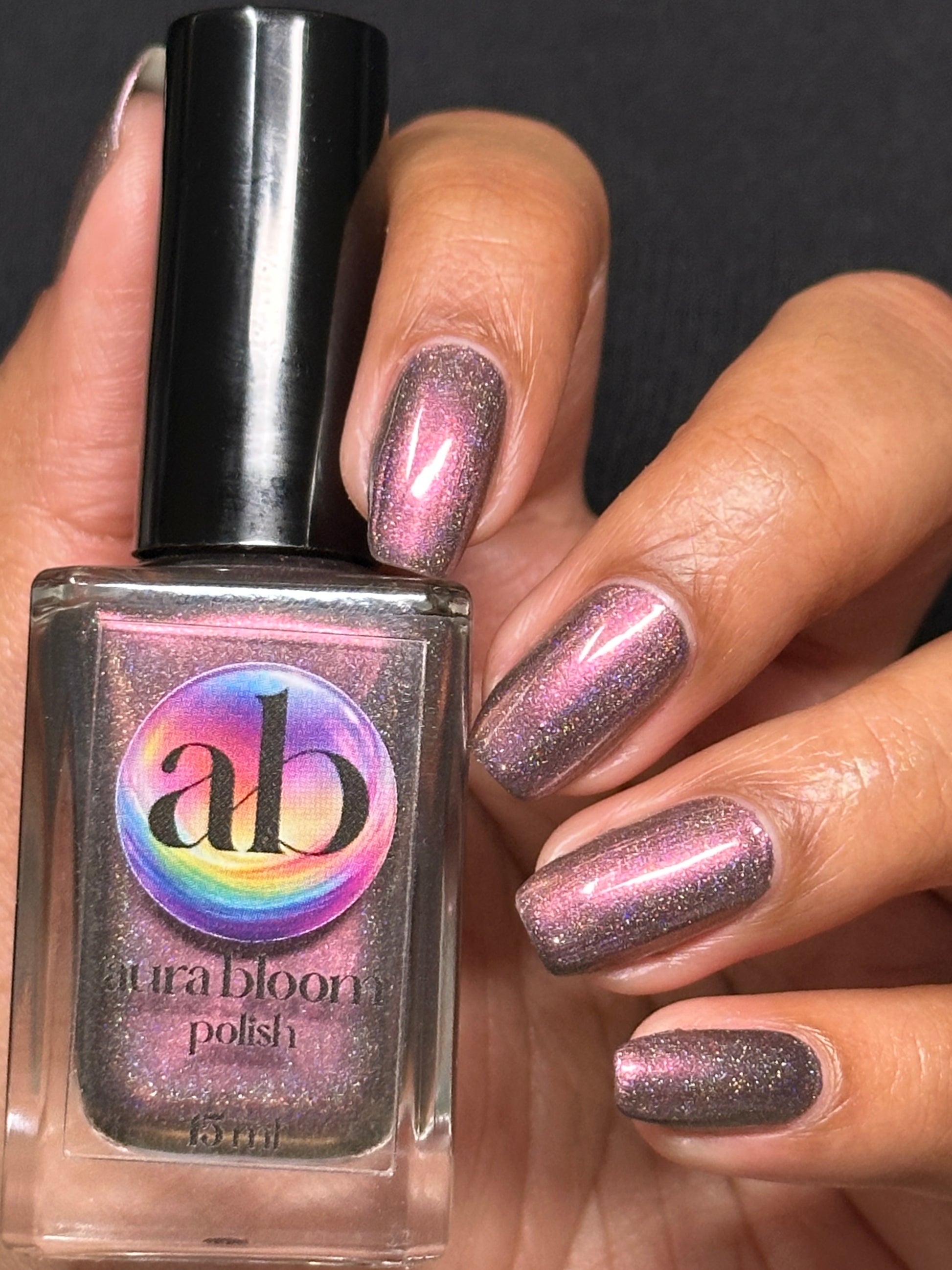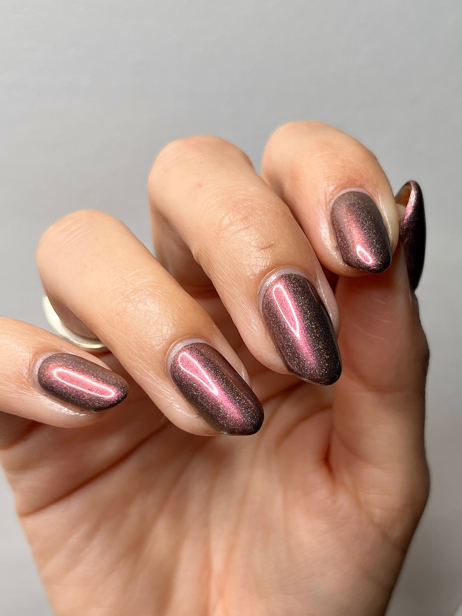 Runic Rouge is a brownish black linear holographic polish with a maroon red pearlescent shimmer.