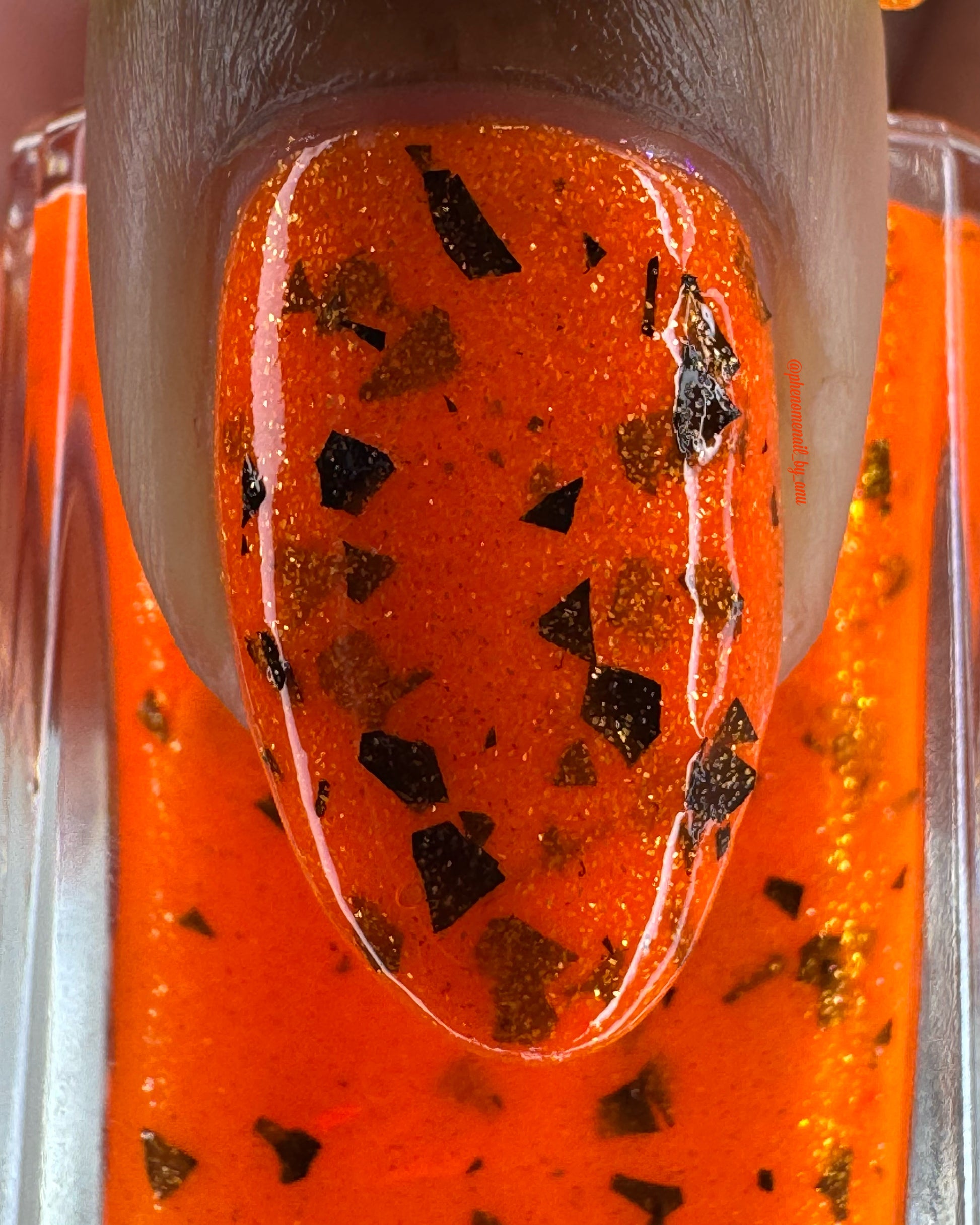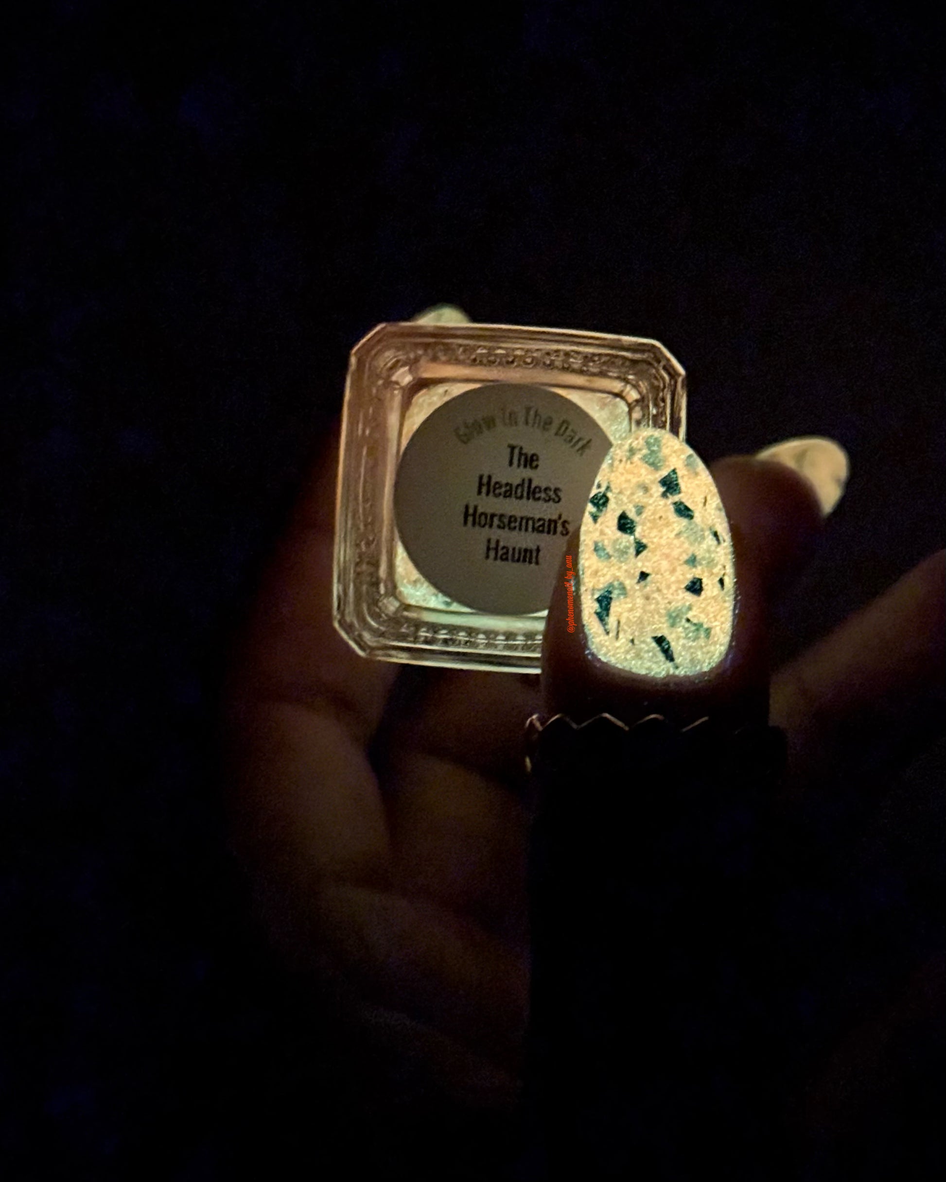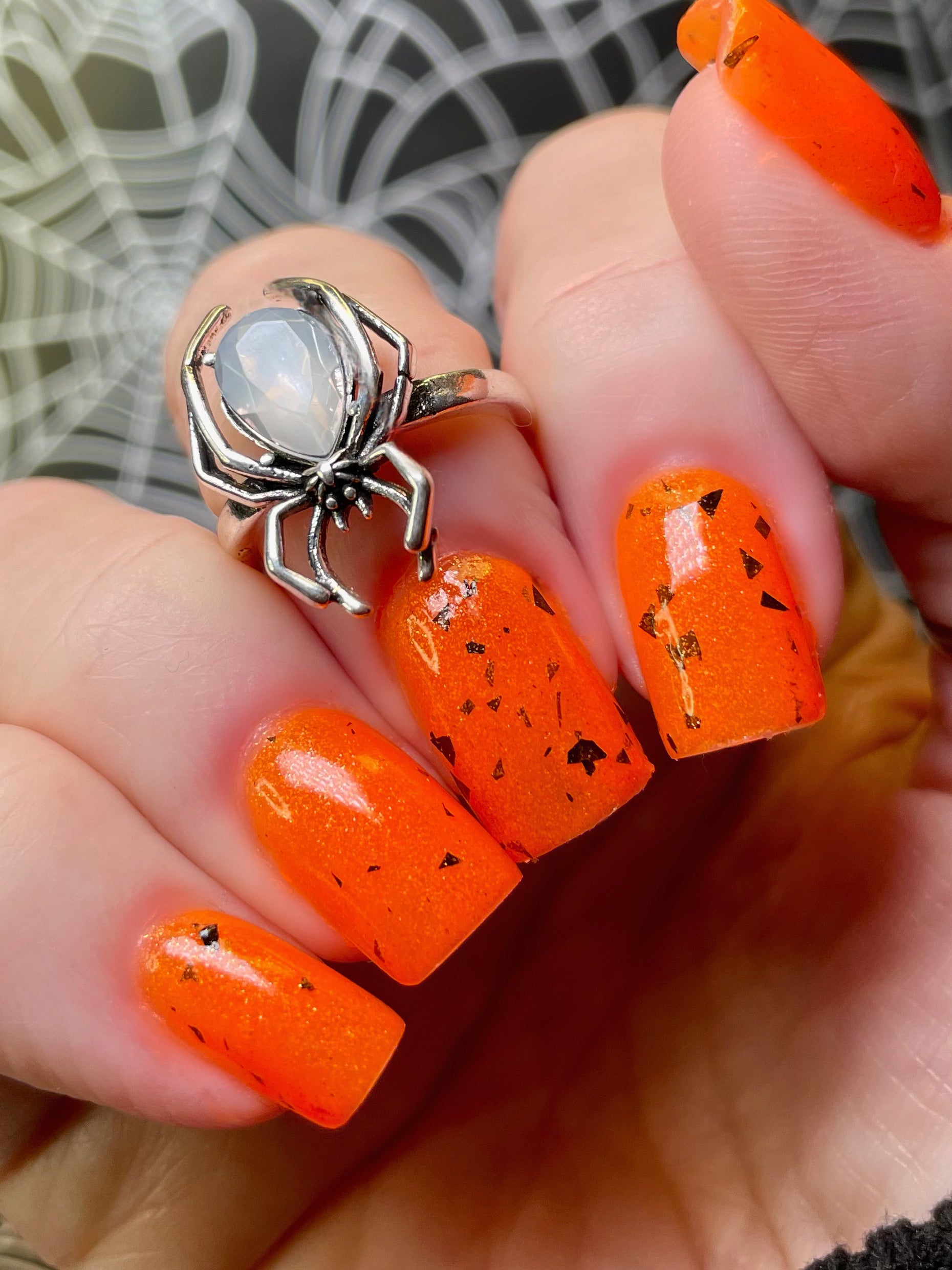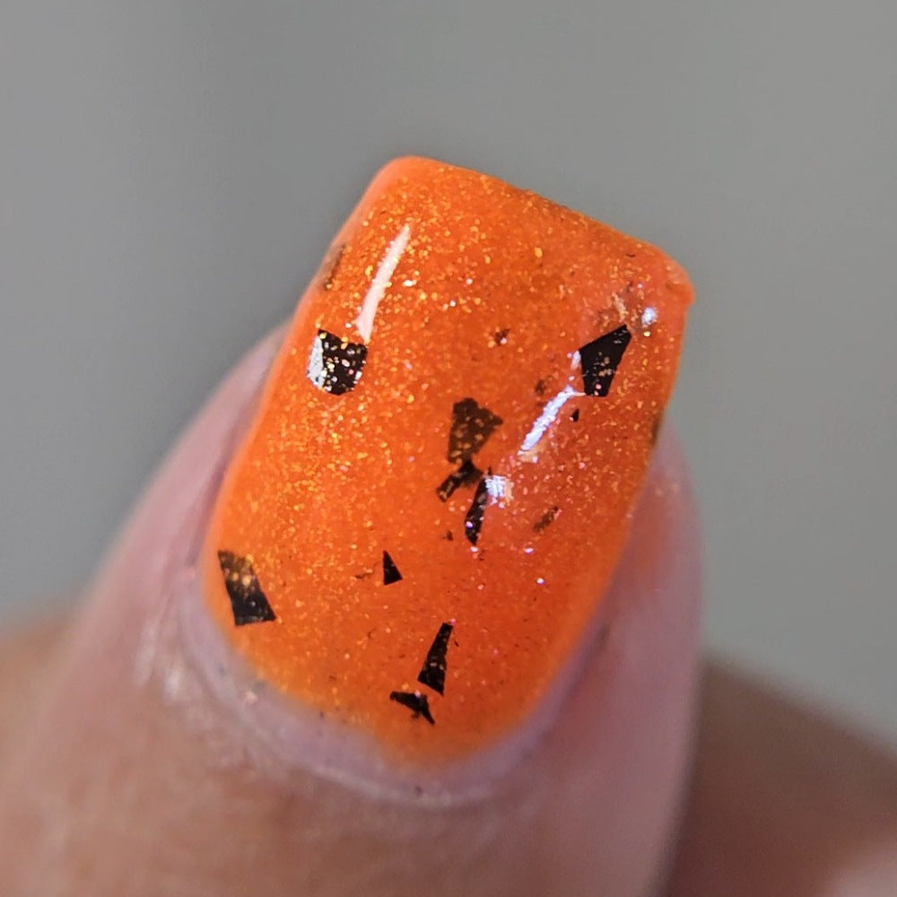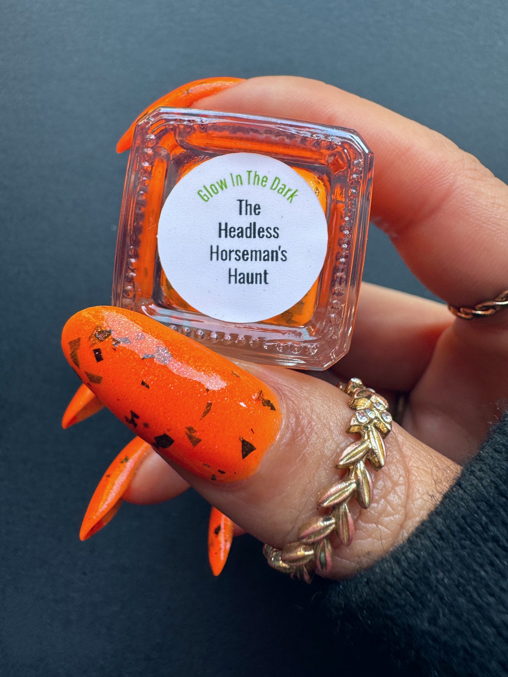 The Headless Horseman's Haunt is a bright orange glow-in-the-dark polish with orange to yellow shifting micro flakes and black glitter shreds. This polish glows orange in the dark.