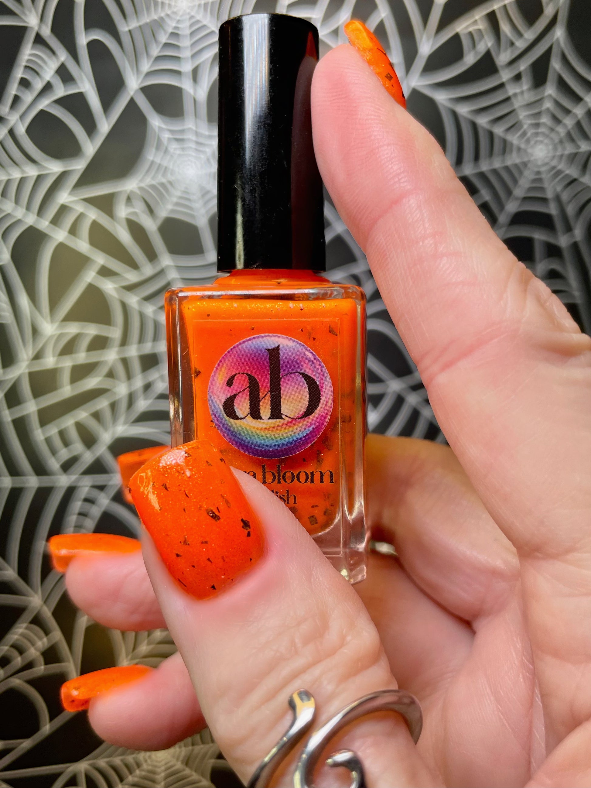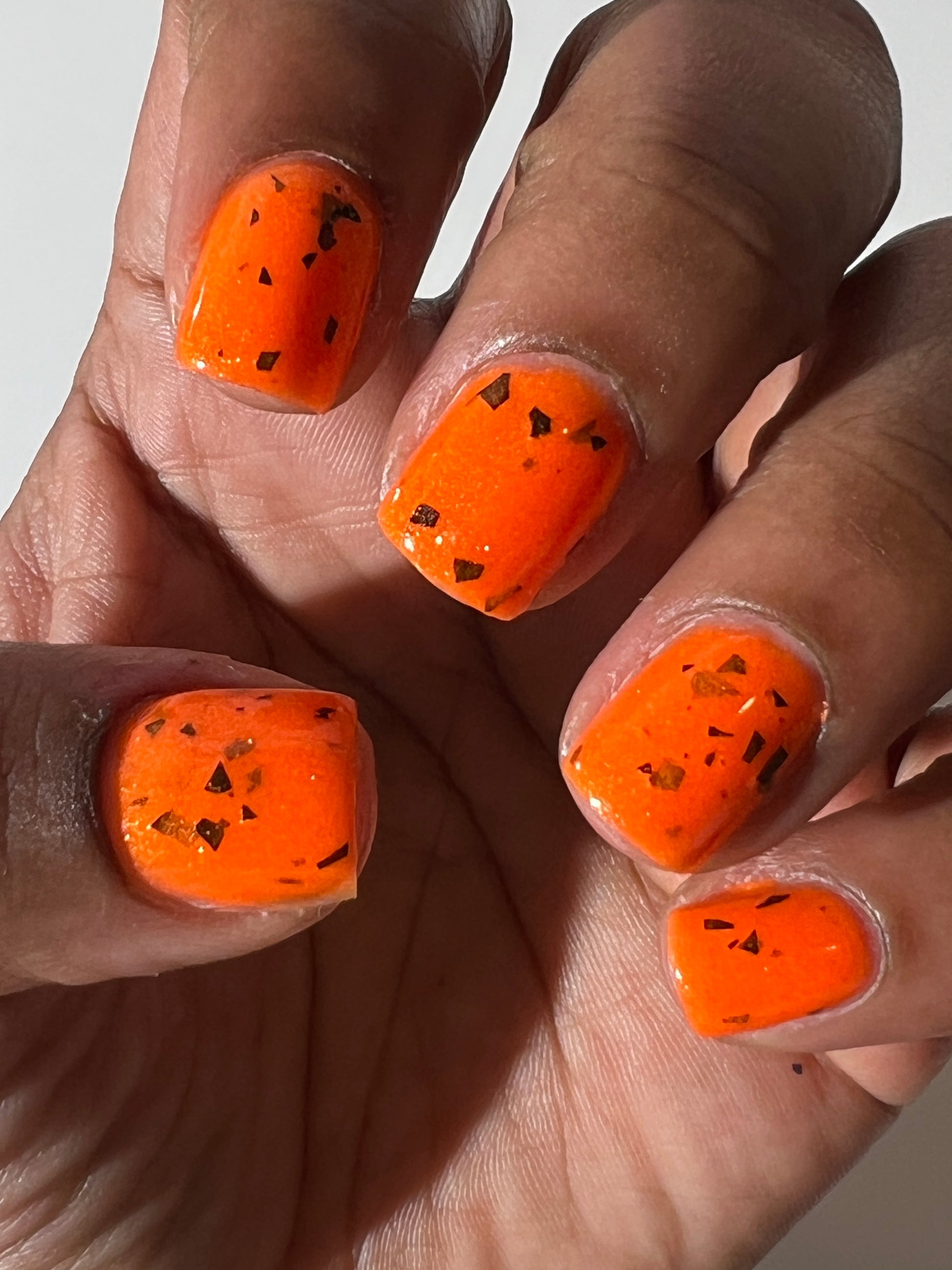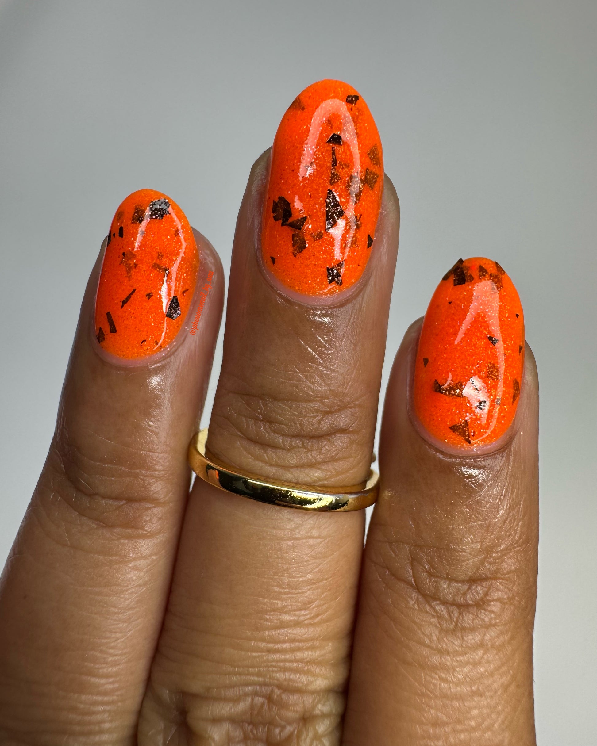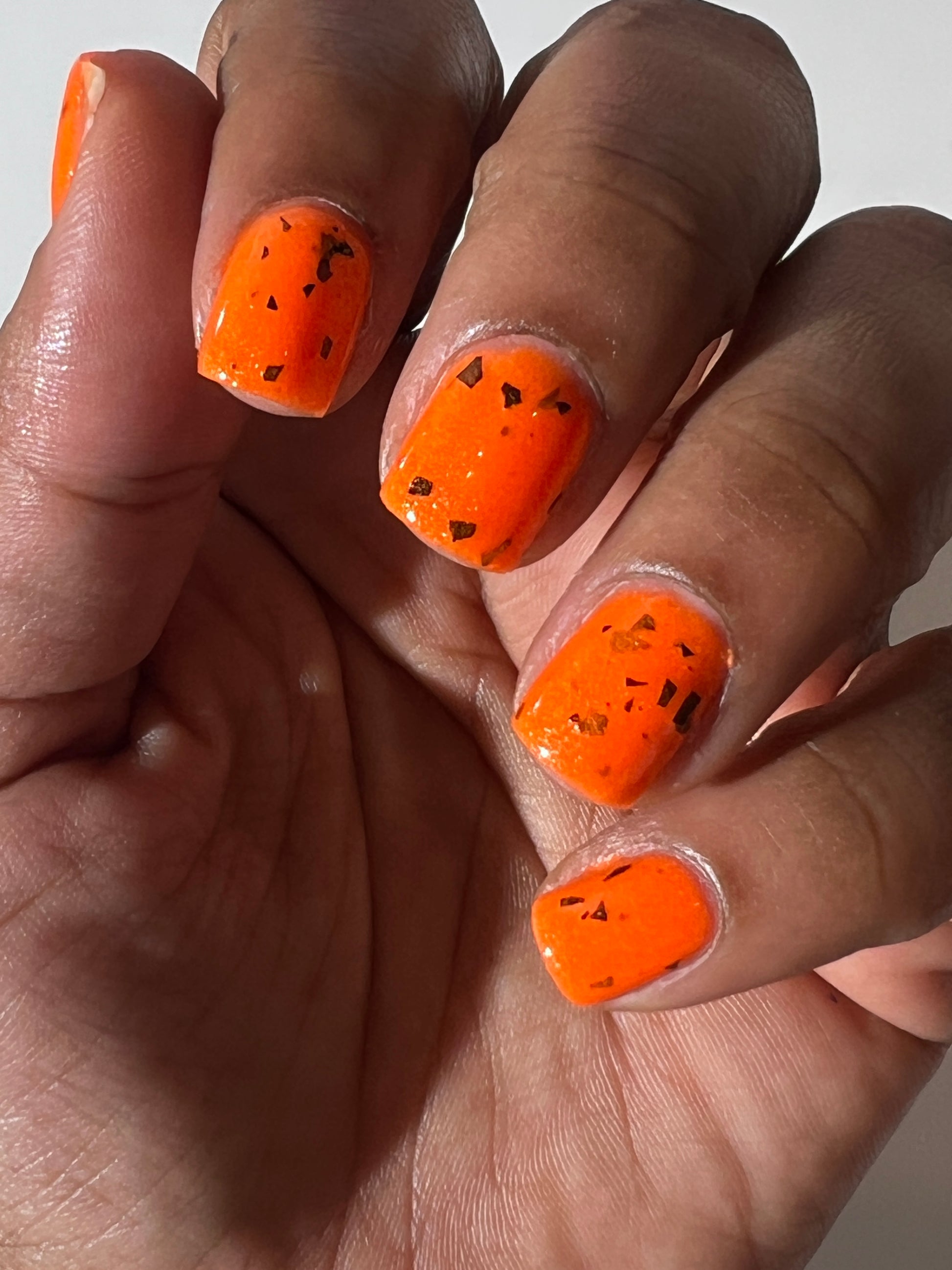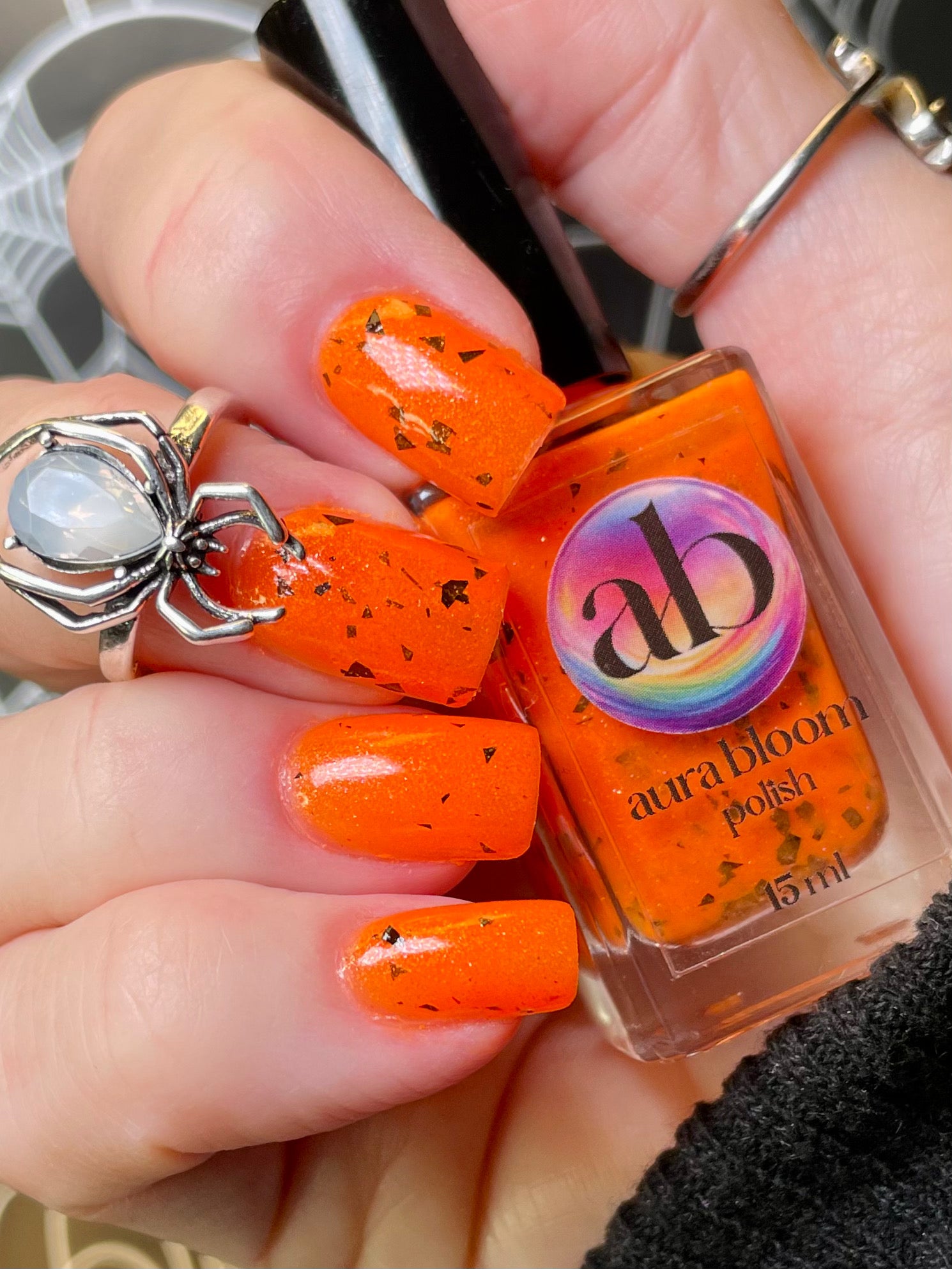 The Headless Horseman's Haunt is a bright orange glow-in-the-dark polish with orange to yellow shifting micro flakes and black glitter shreds. This polish glows orange in the dark.