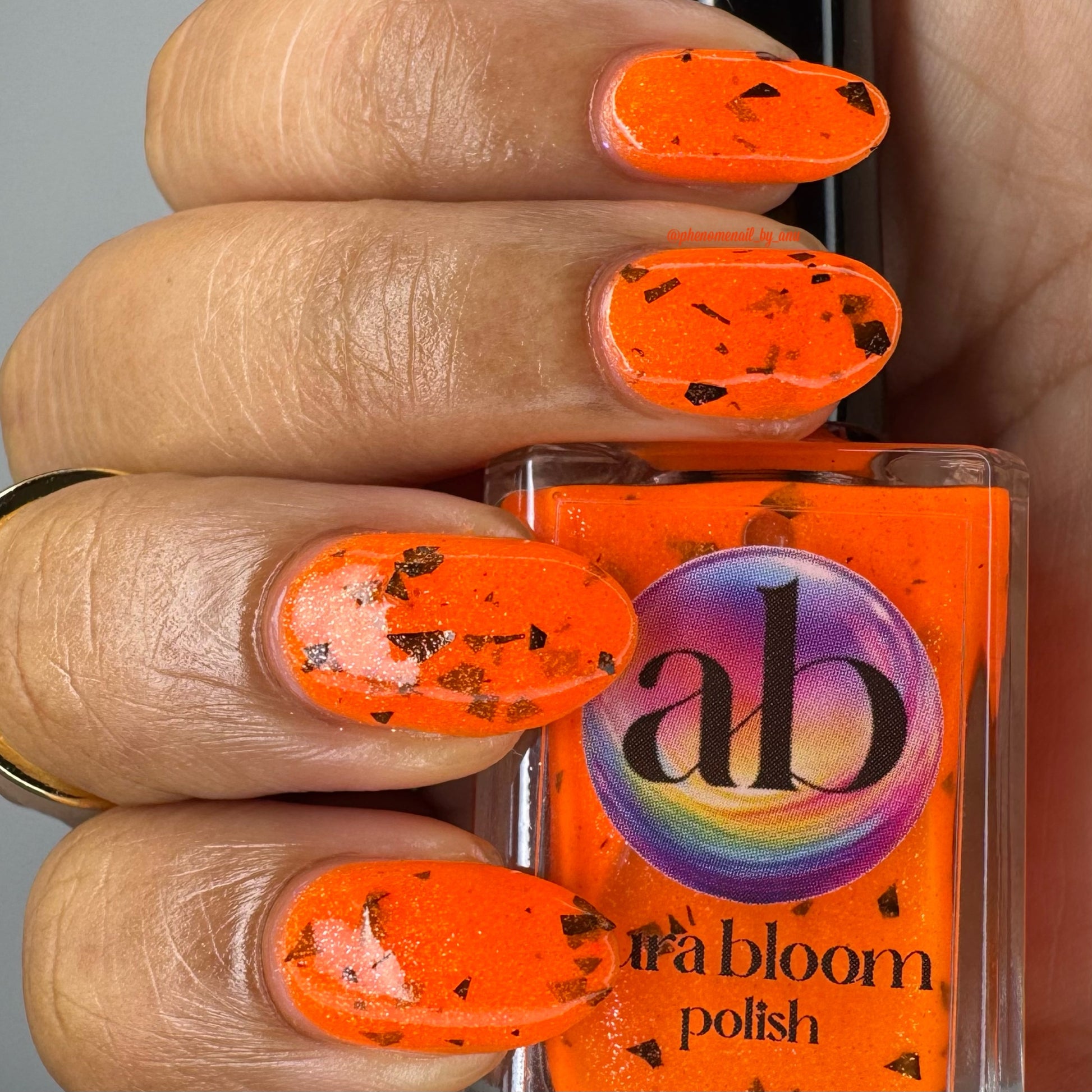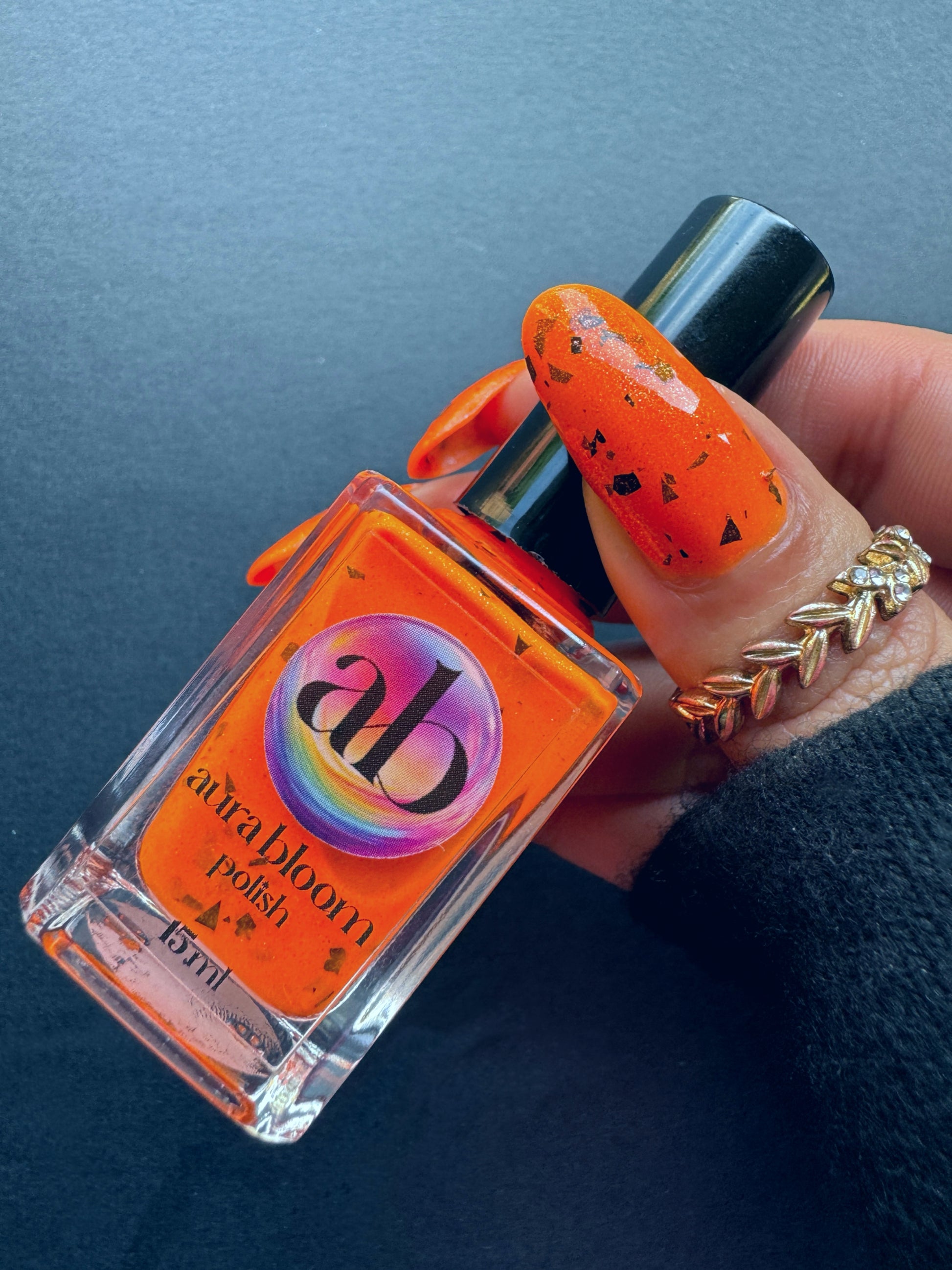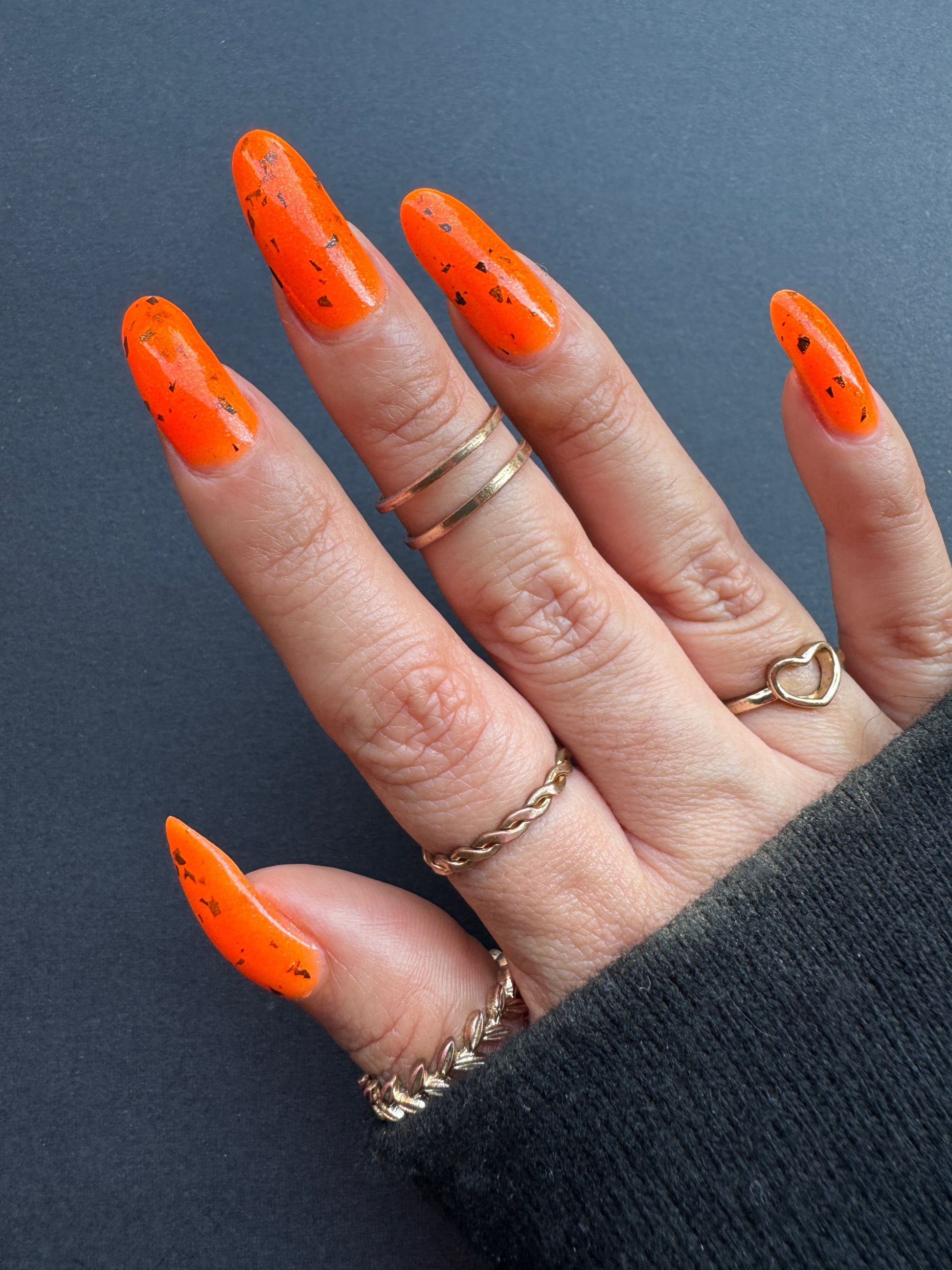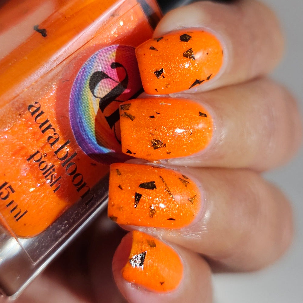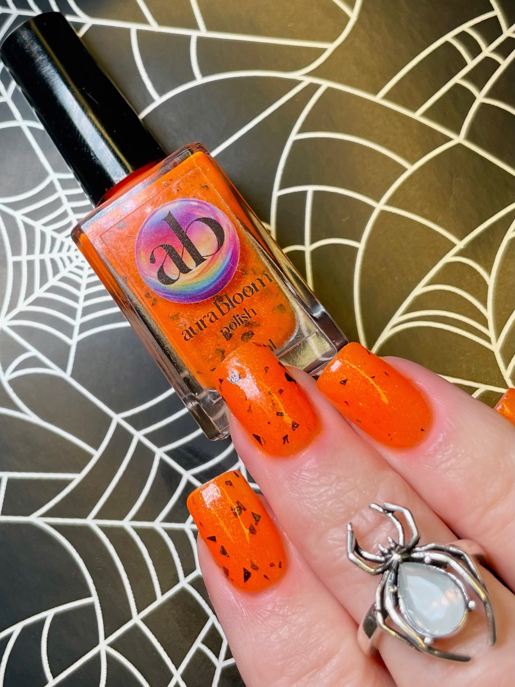 The Headless Horseman's Haunt is a bright orange glow-in-the-dark polish with orange to yellow shifting micro flakes and black glitter shreds. This polish glows orange in the dark.