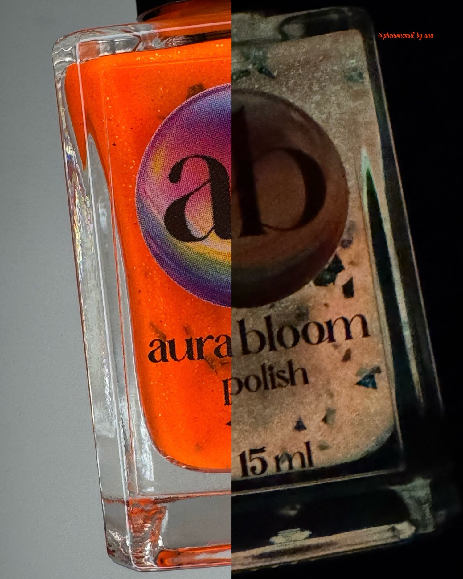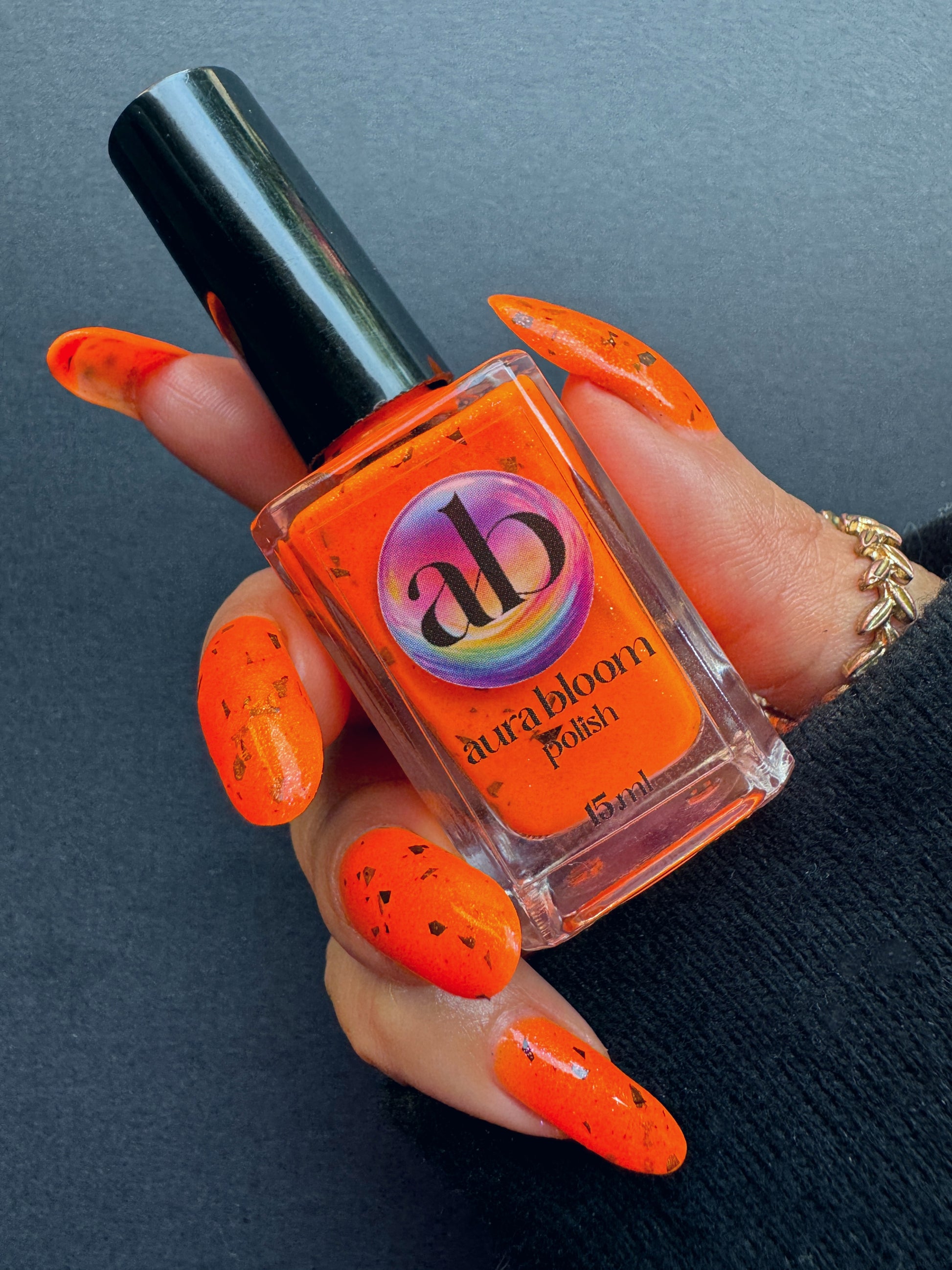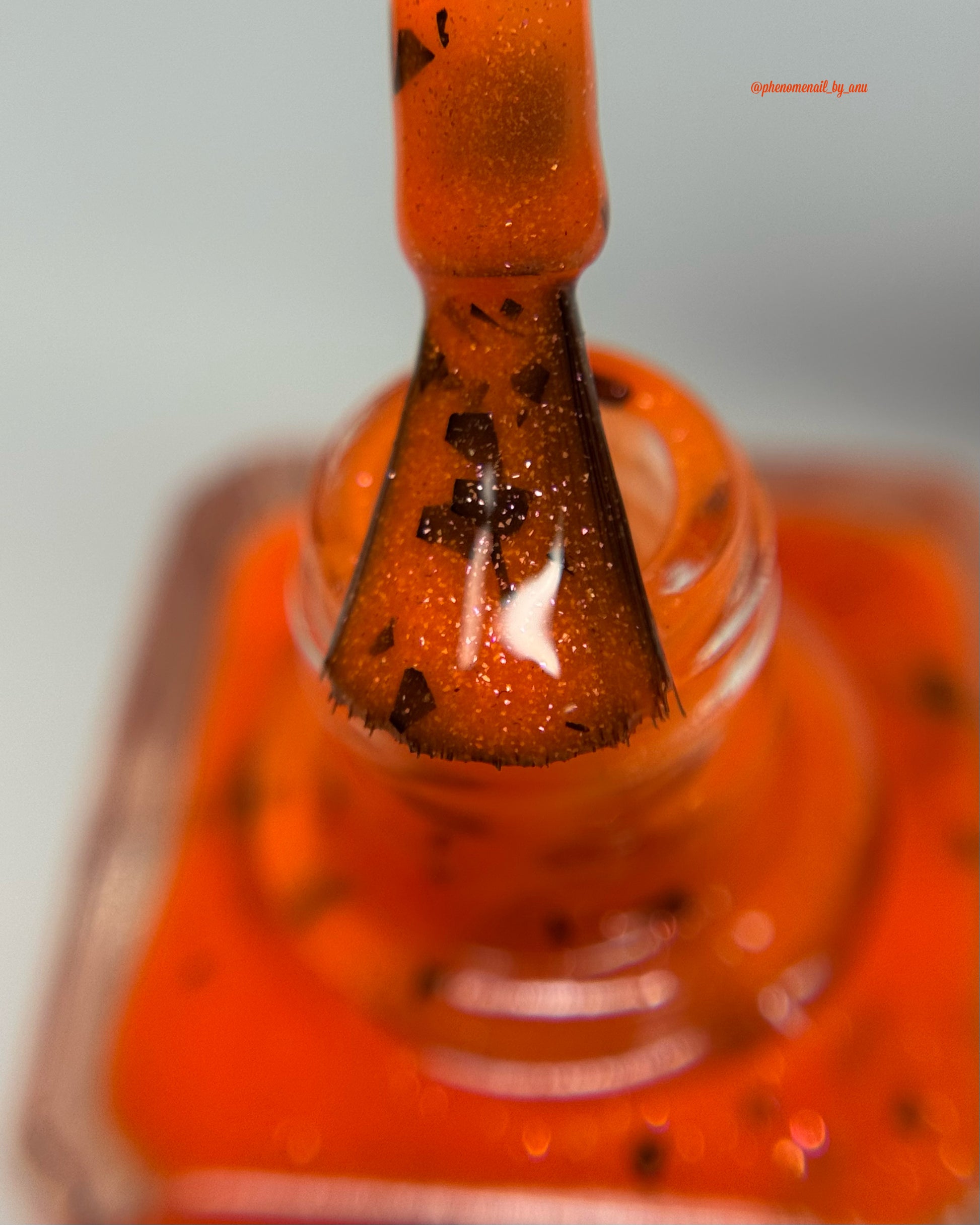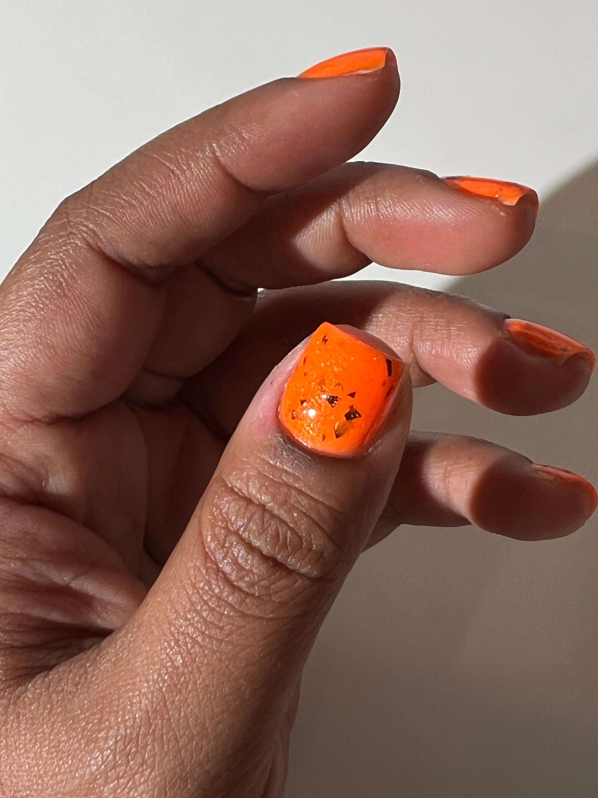 The Headless Horseman's Haunt is a bright orange glow-in-the-dark polish with orange to yellow shifting micro flakes and black glitter shreds. This polish glows orange in the dark.