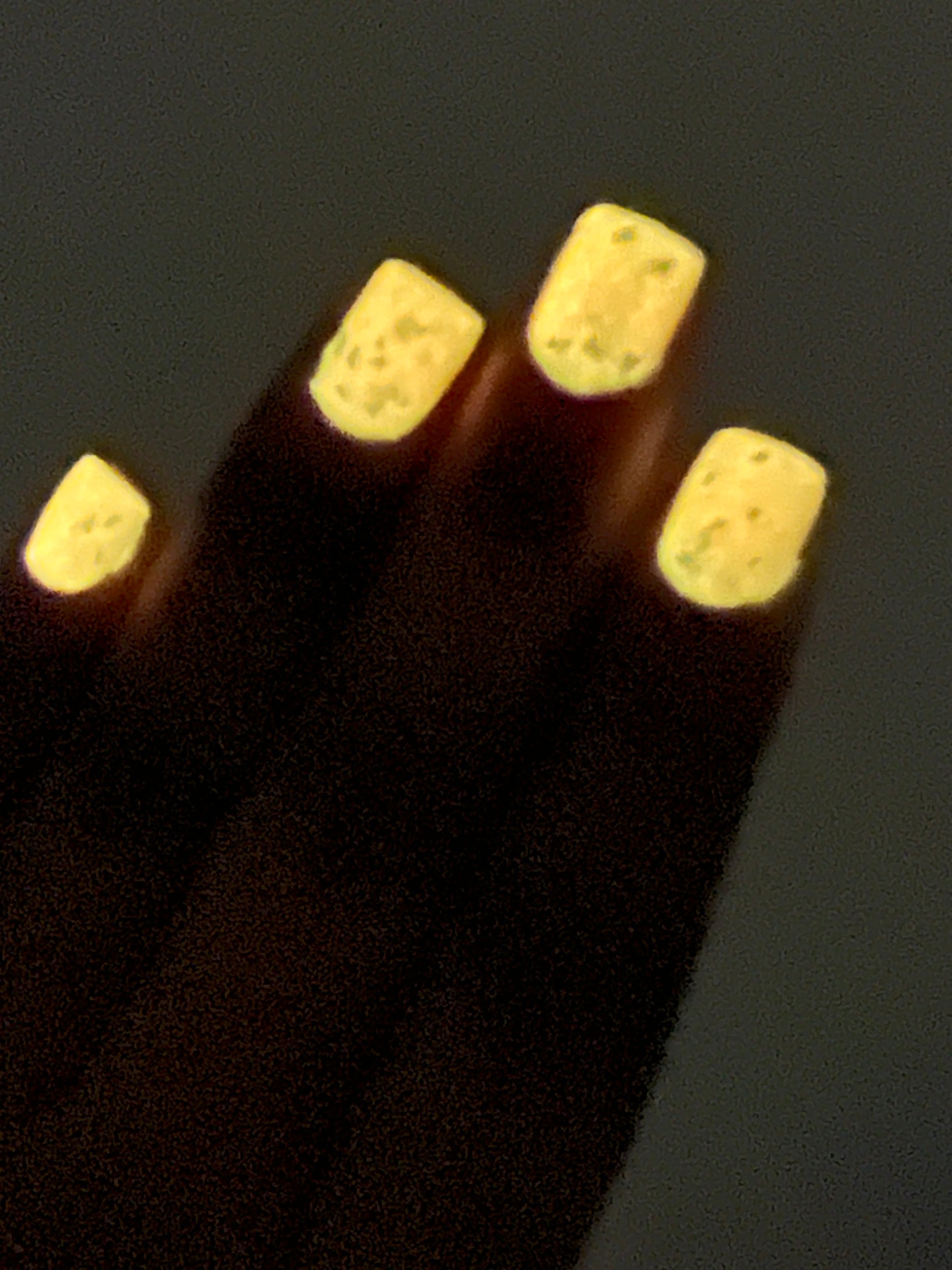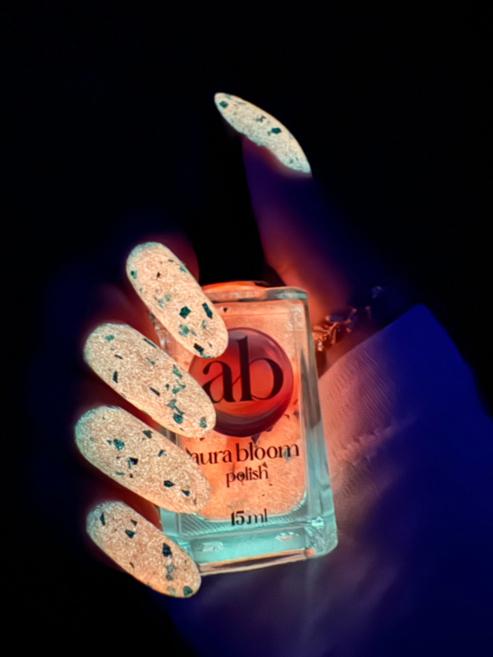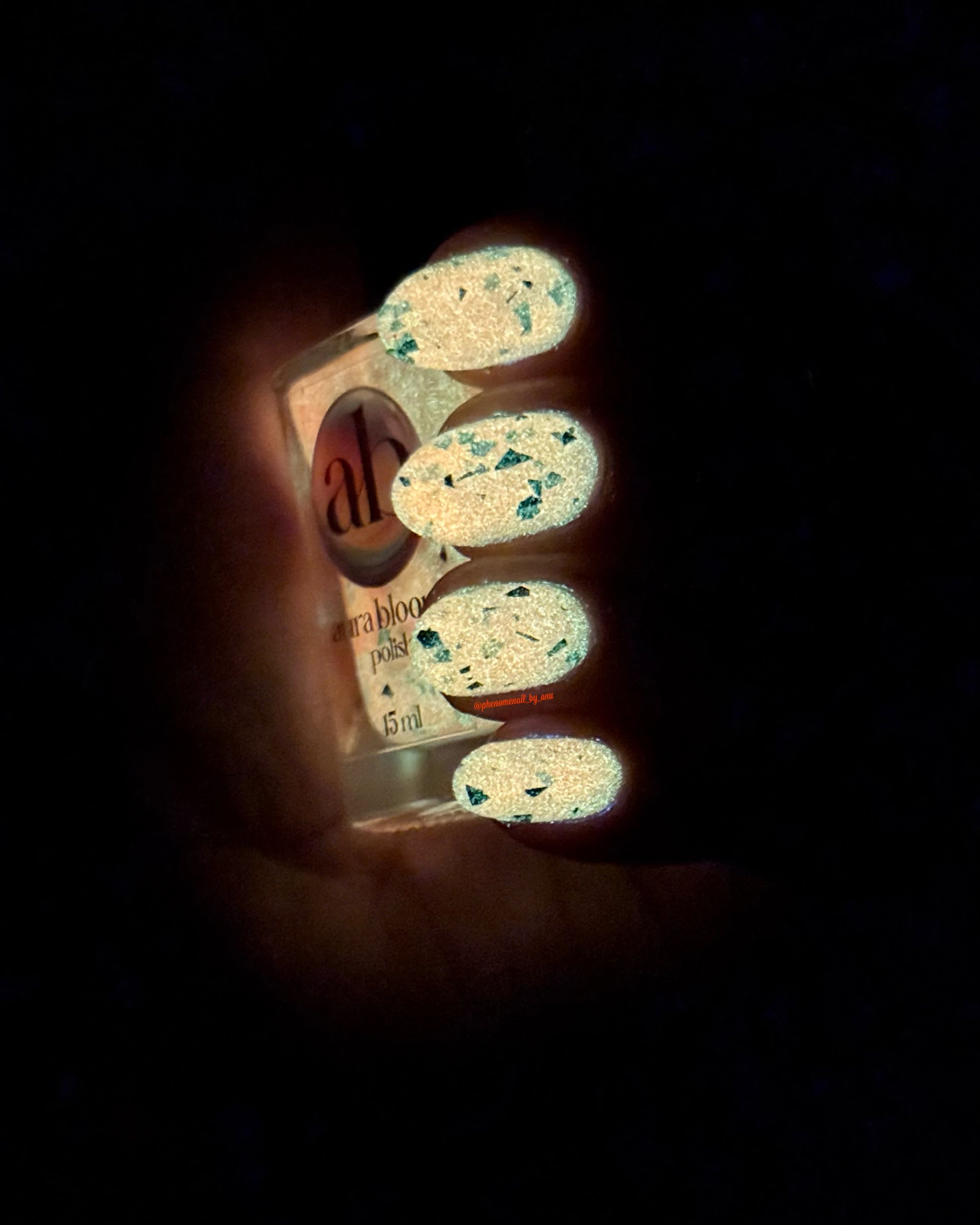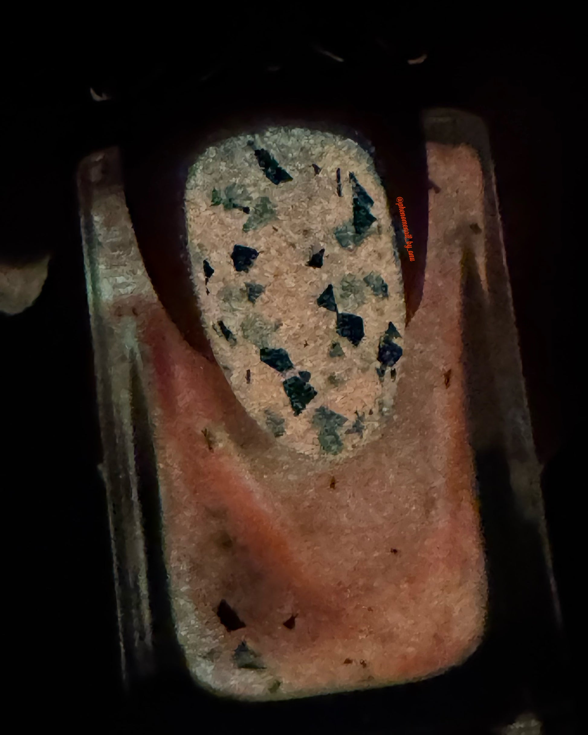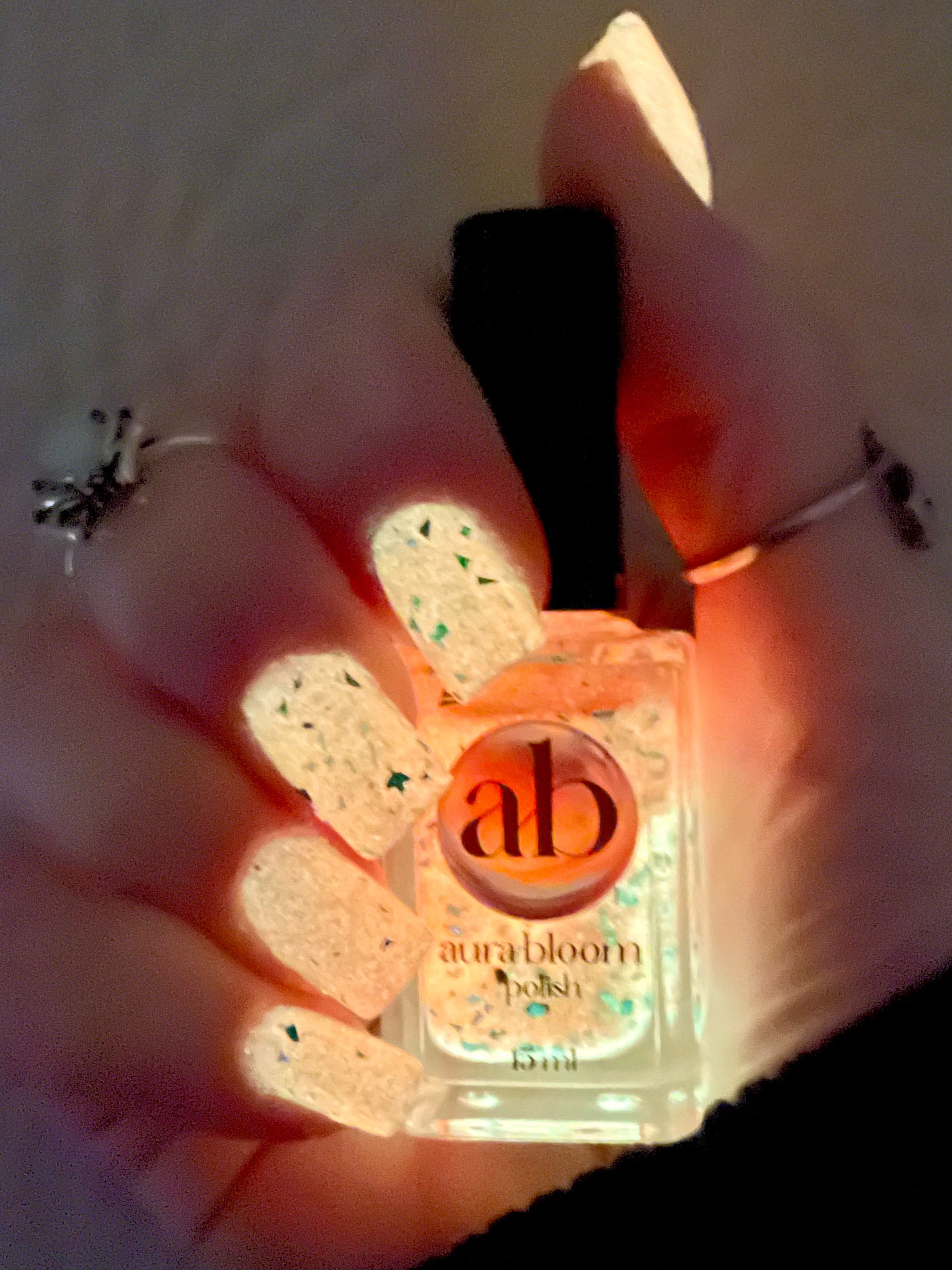 The Headless Horseman's Haunt is a bright orange glow-in-the-dark polish with orange to yellow shifting micro flakes and black glitter shreds. This polish glows orange in the dark.