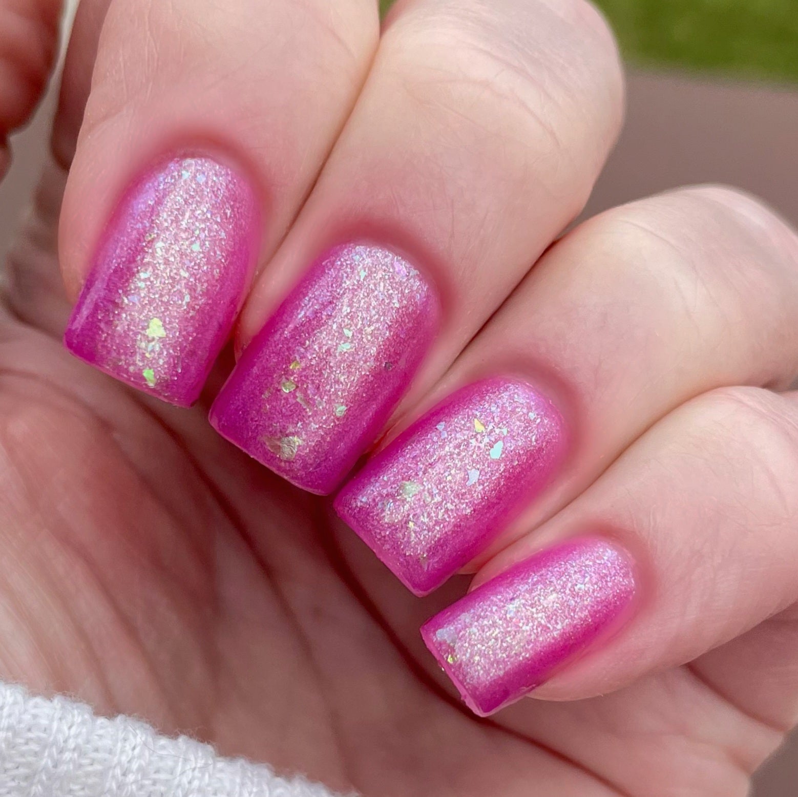 Too Glam To Give A Damn is a pink-purple crelly that has a green-yellow aurora shimmer with teal-green iridescent flakes.