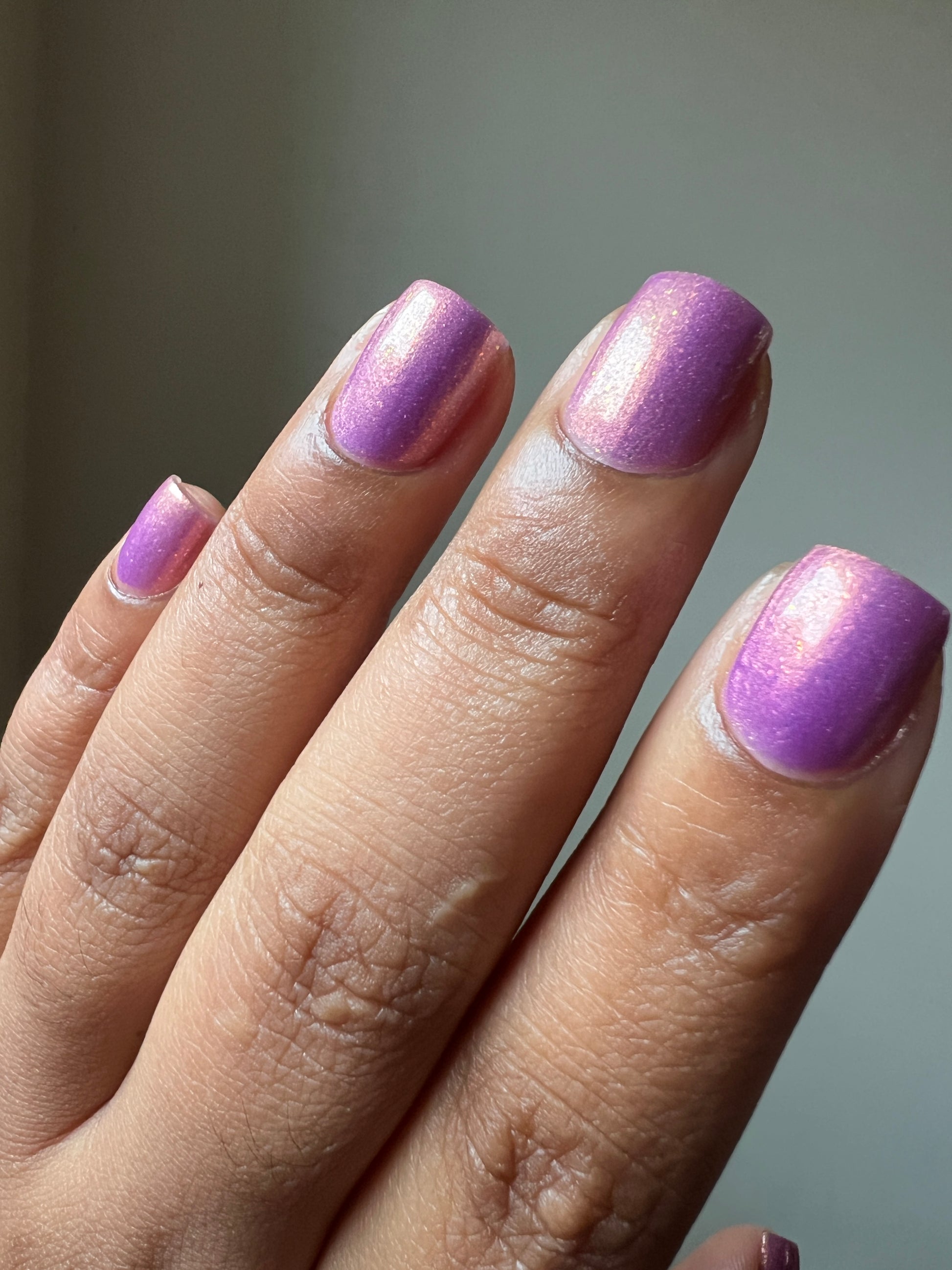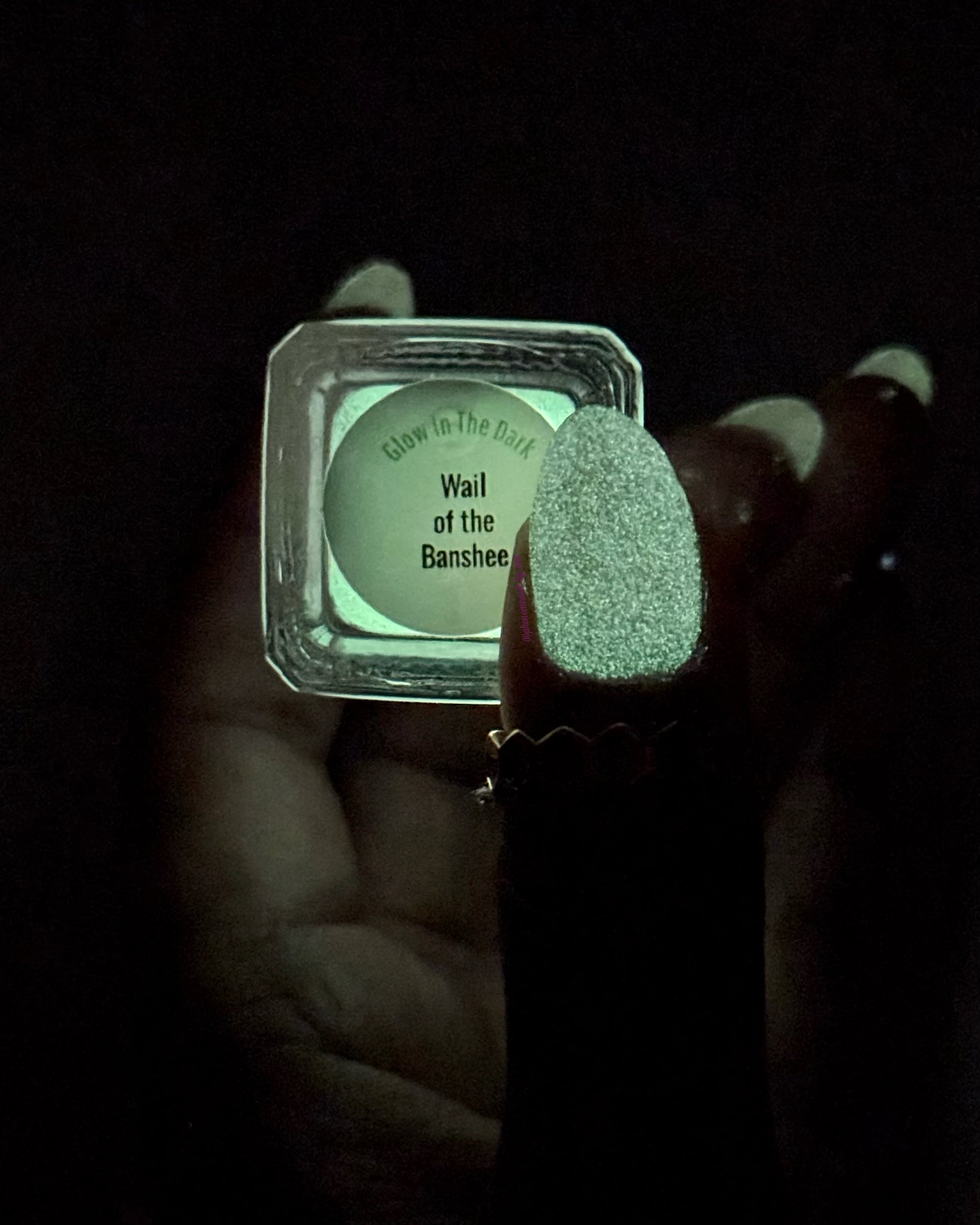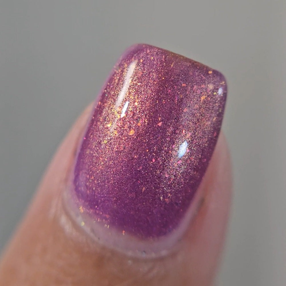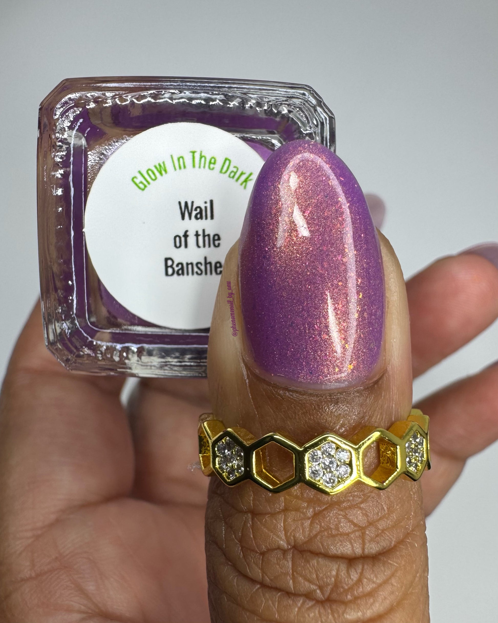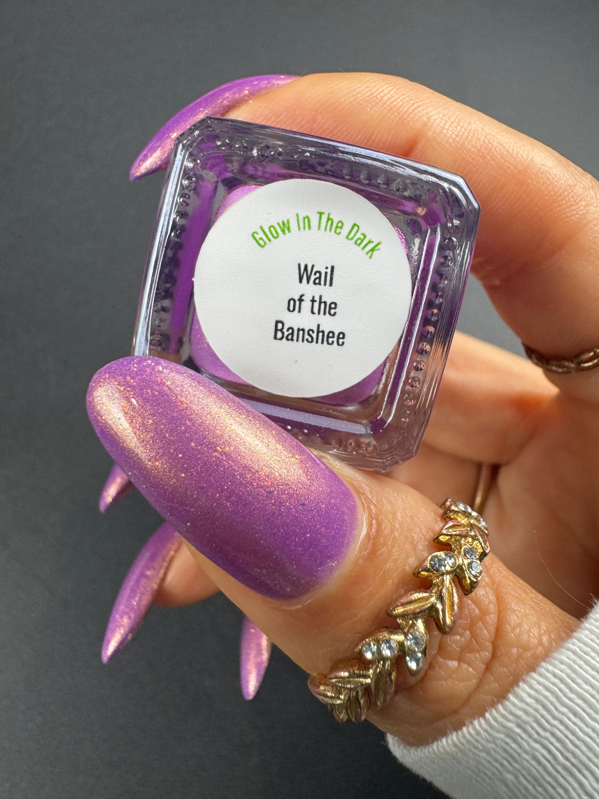 Wail of the Banshee is a light-medium purple glow-in-the-dark polish with orange-gold-green shifting micro flakes and orange shimmer. This polish glows a whitish yellow in the dark.
