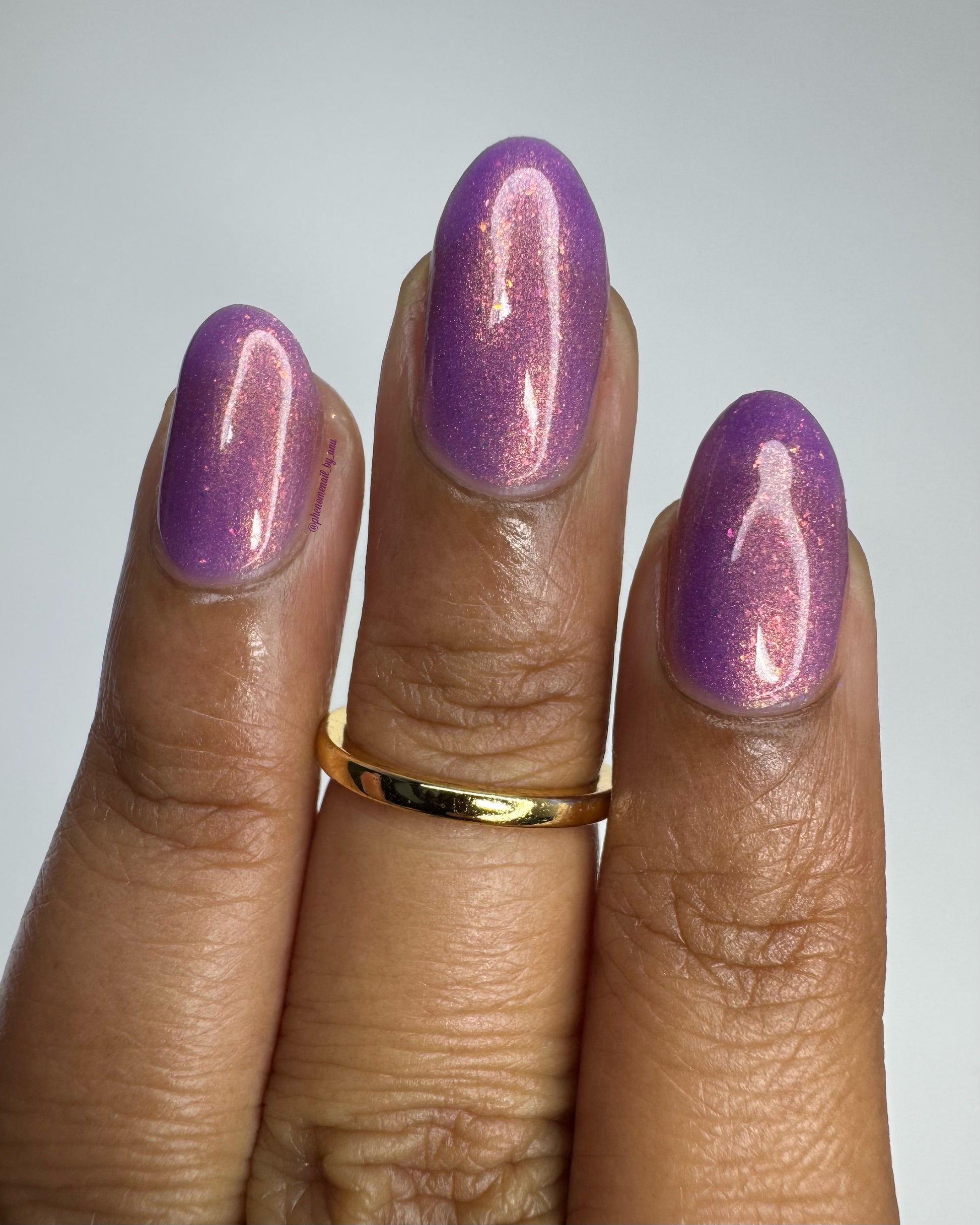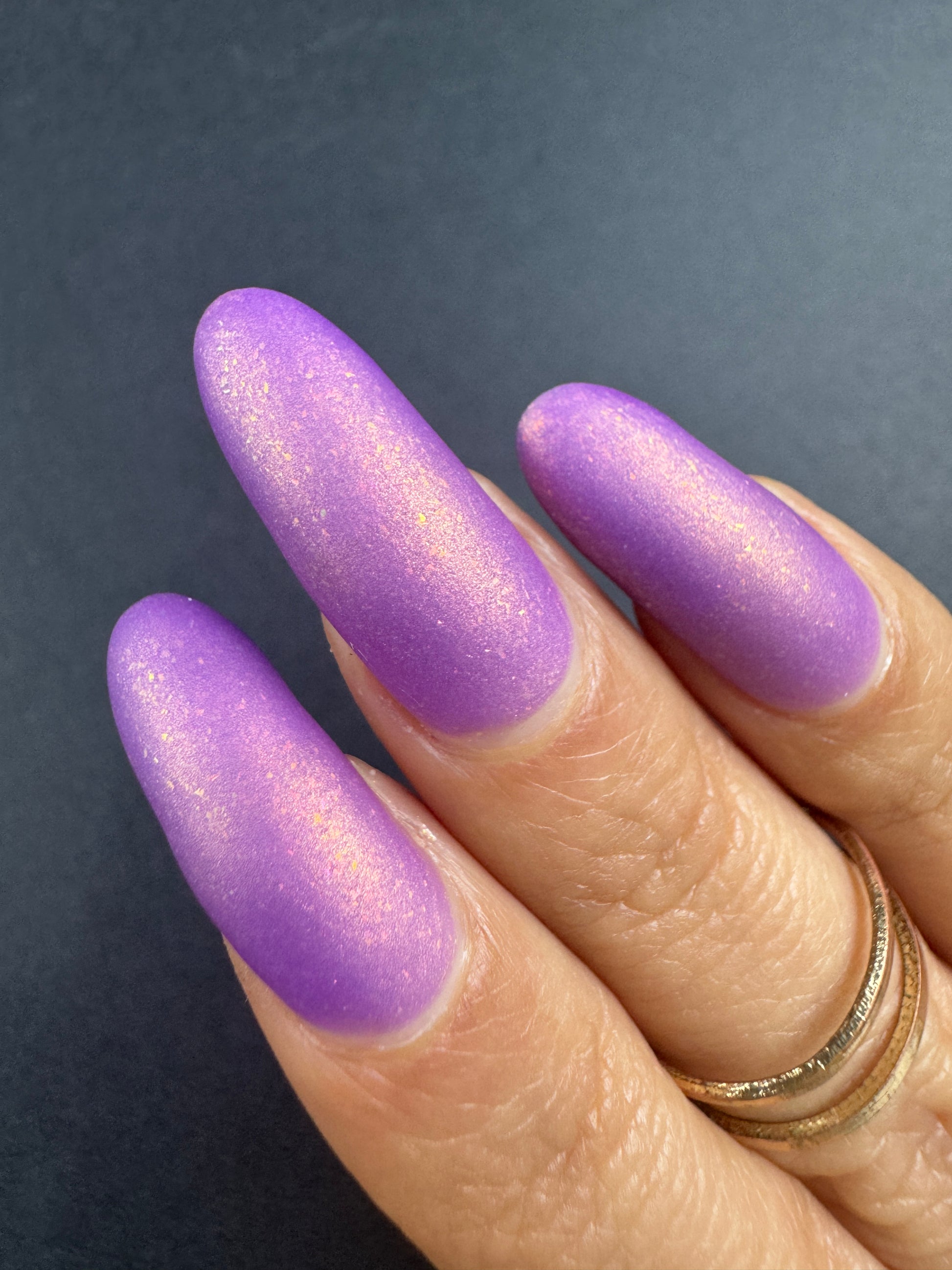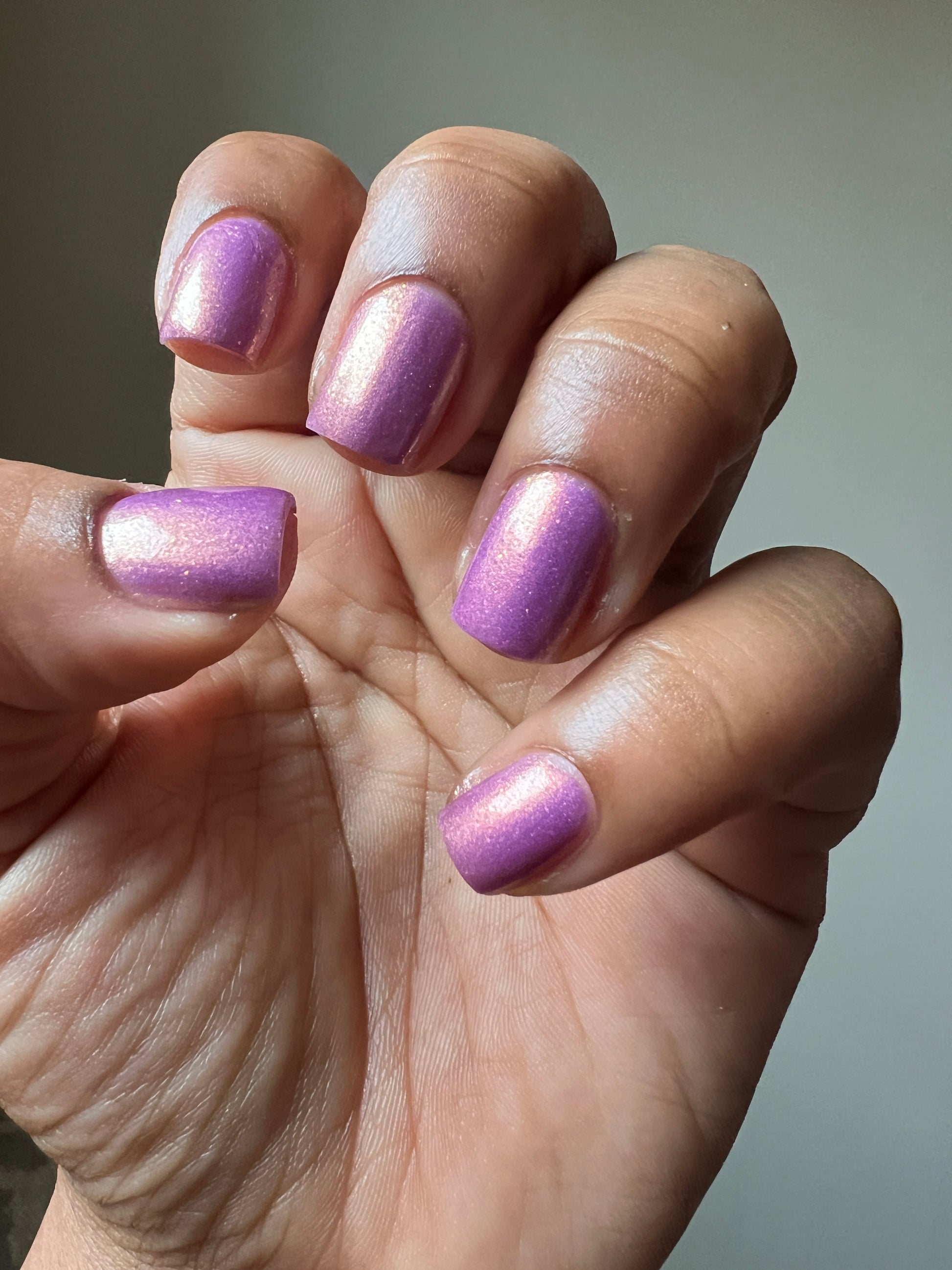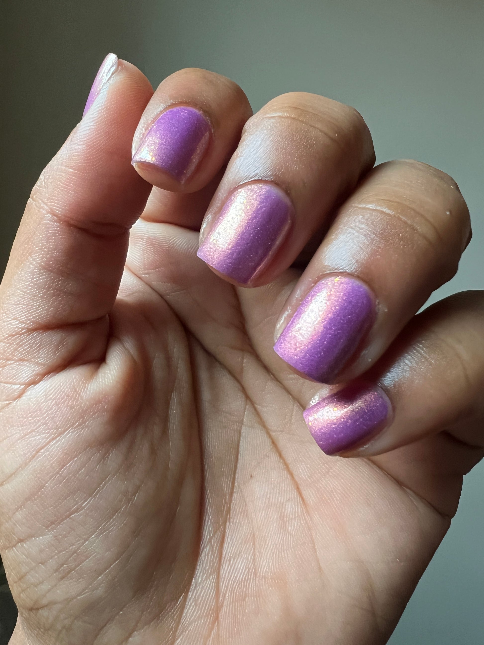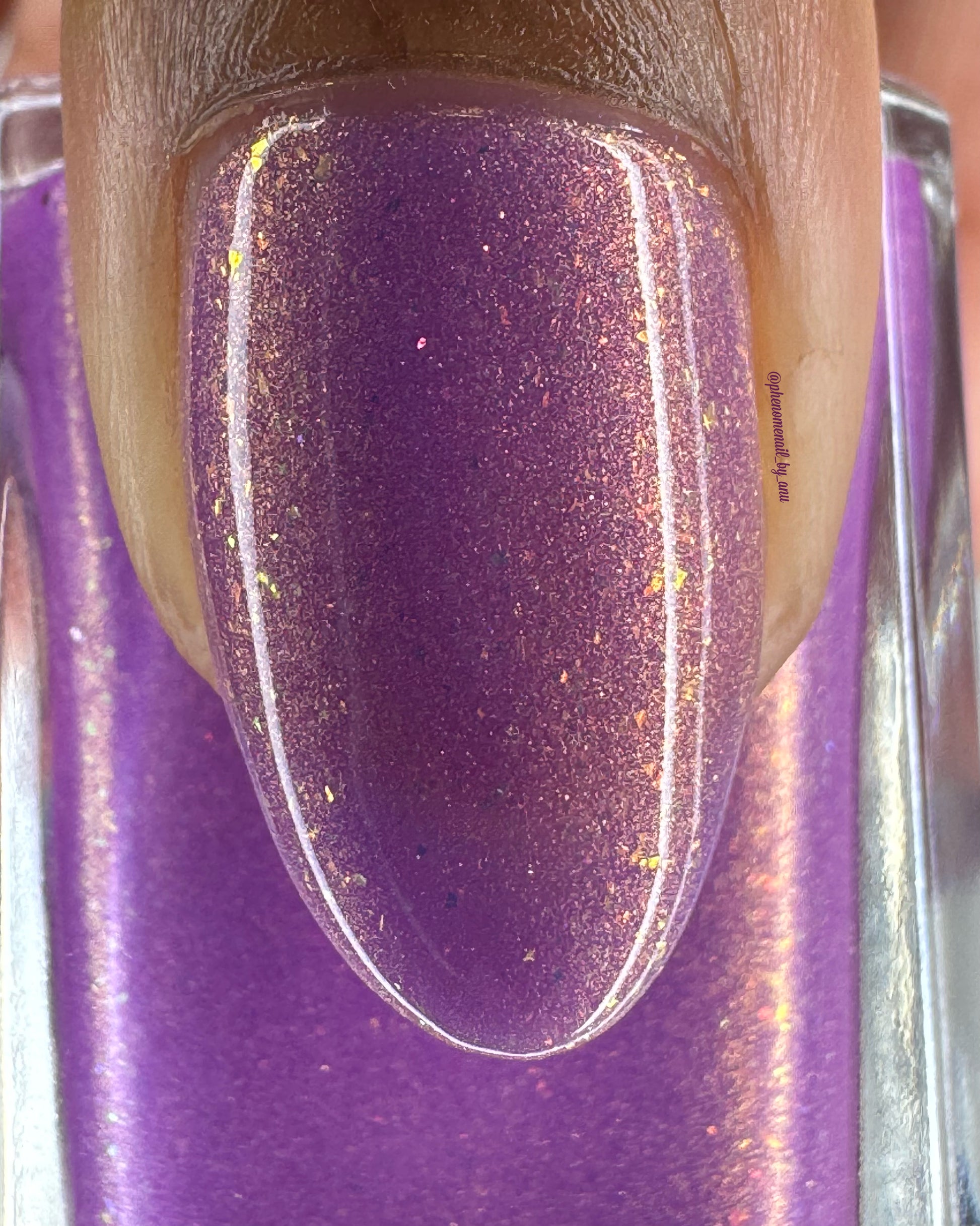 Wail of the Banshee is a light-medium purple glow-in-the-dark polish with orange-gold-green shifting micro flakes and orange shimmer. This polish glows a whitish yellow in the dark.