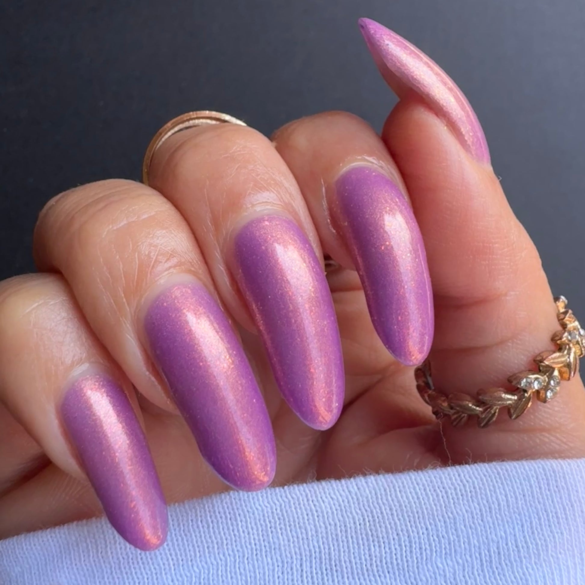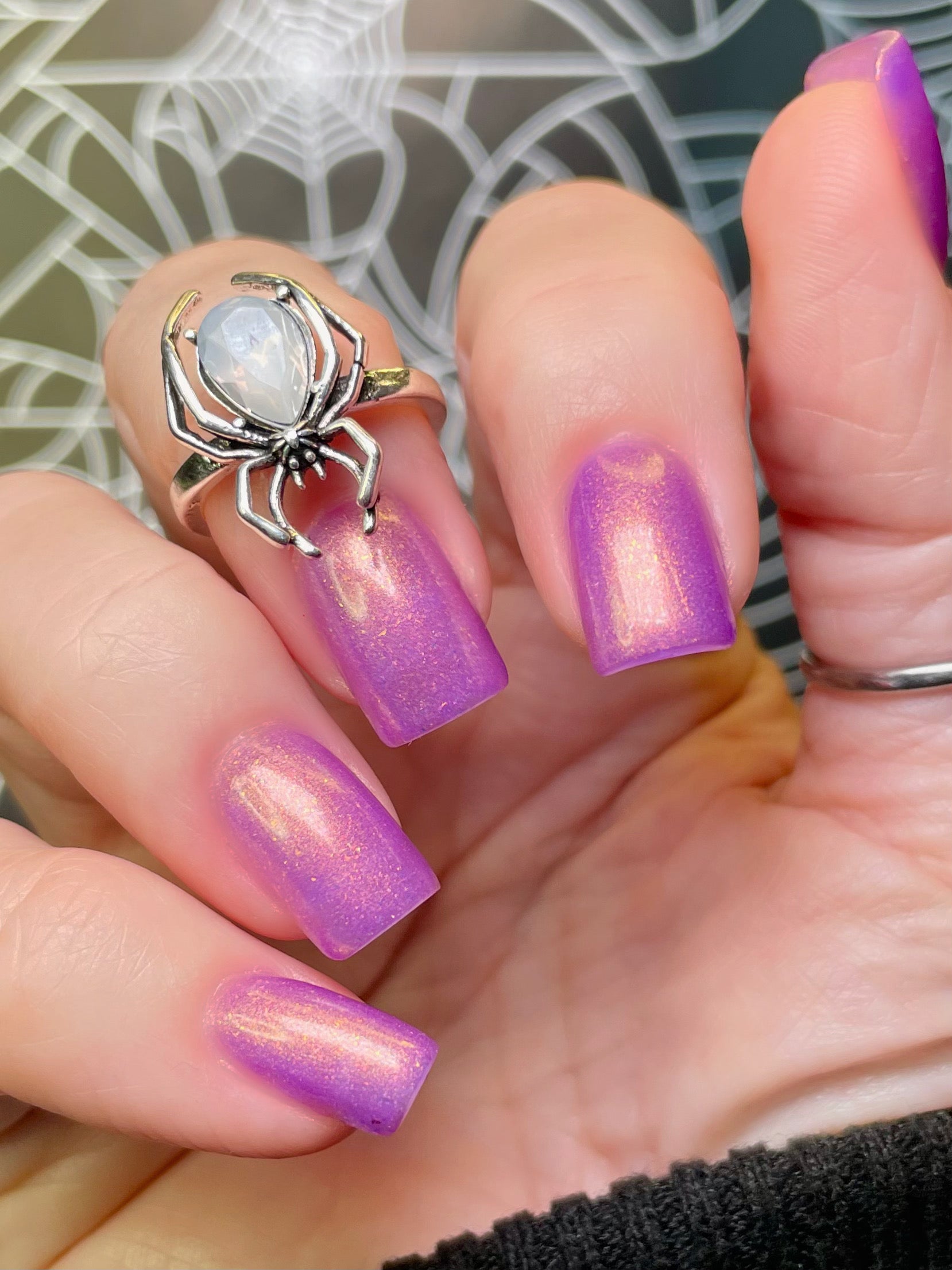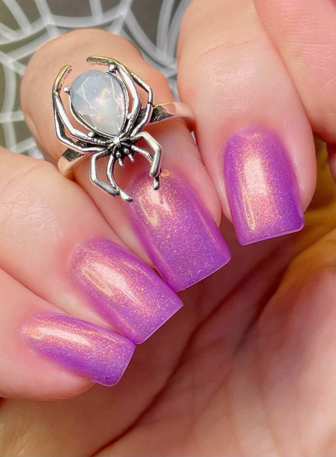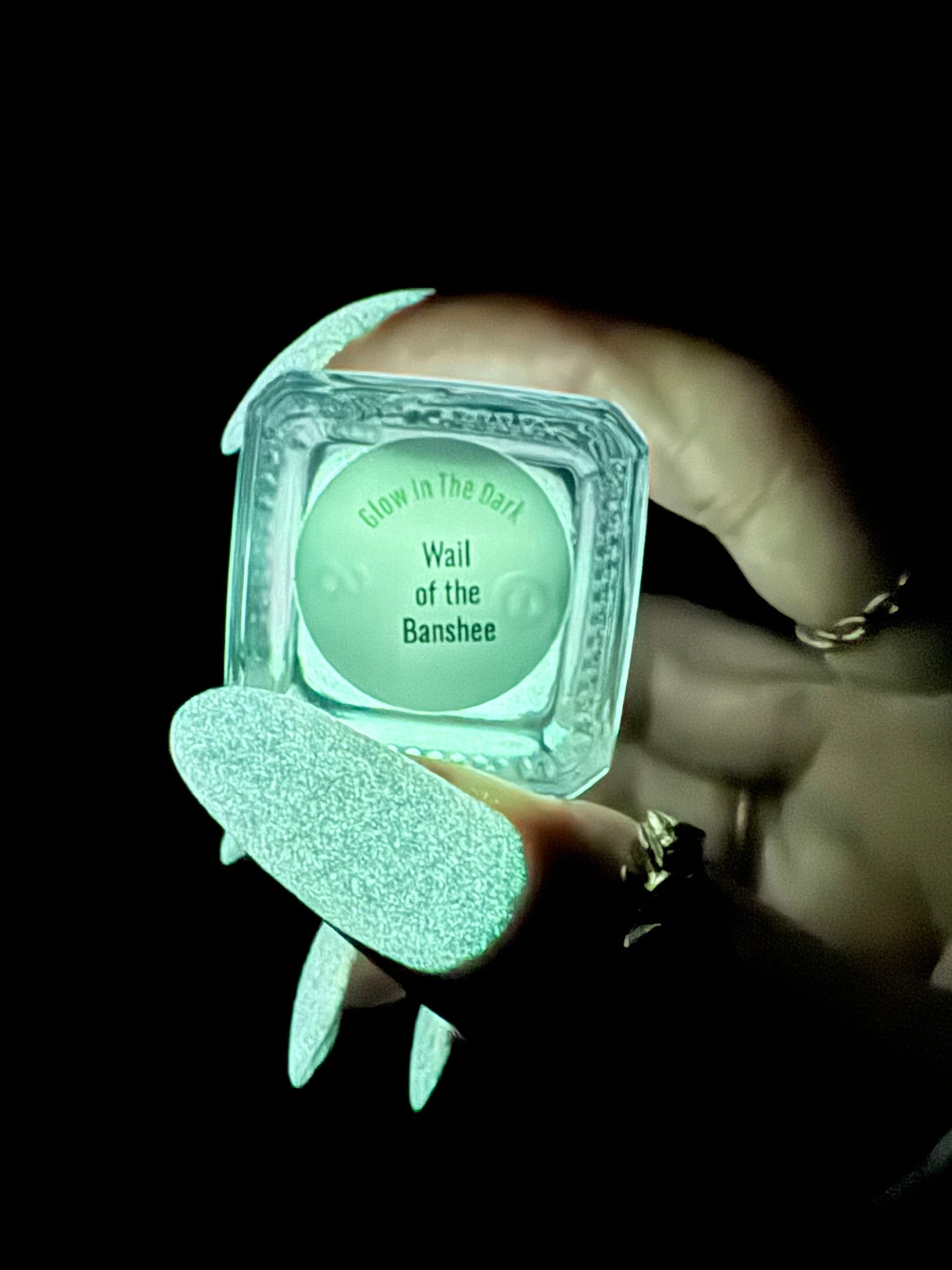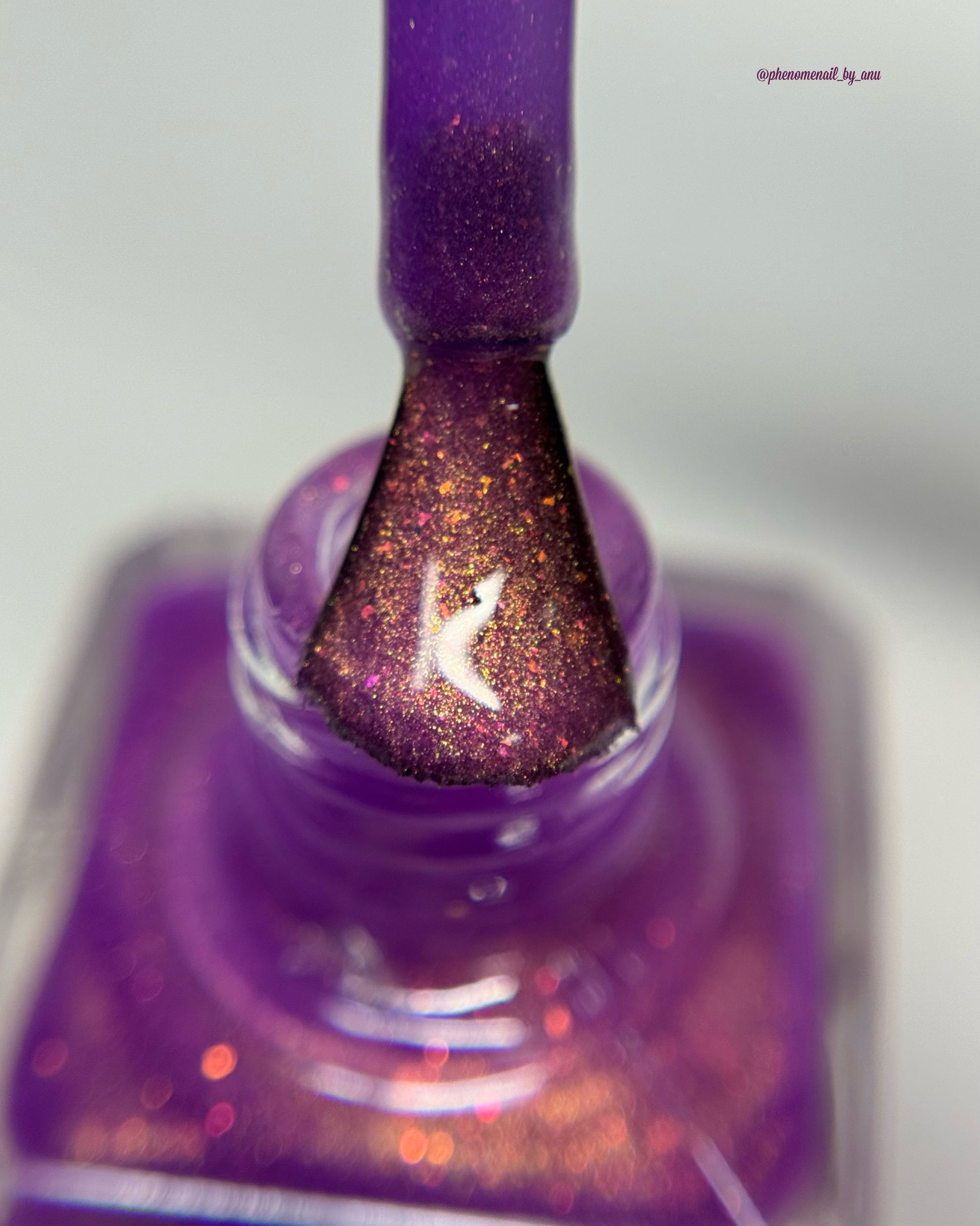 Wail of the Banshee is a light-medium purple glow-in-the-dark polish with orange-gold-green shifting micro flakes and orange shimmer. This polish glows a whitish yellow in the dark.