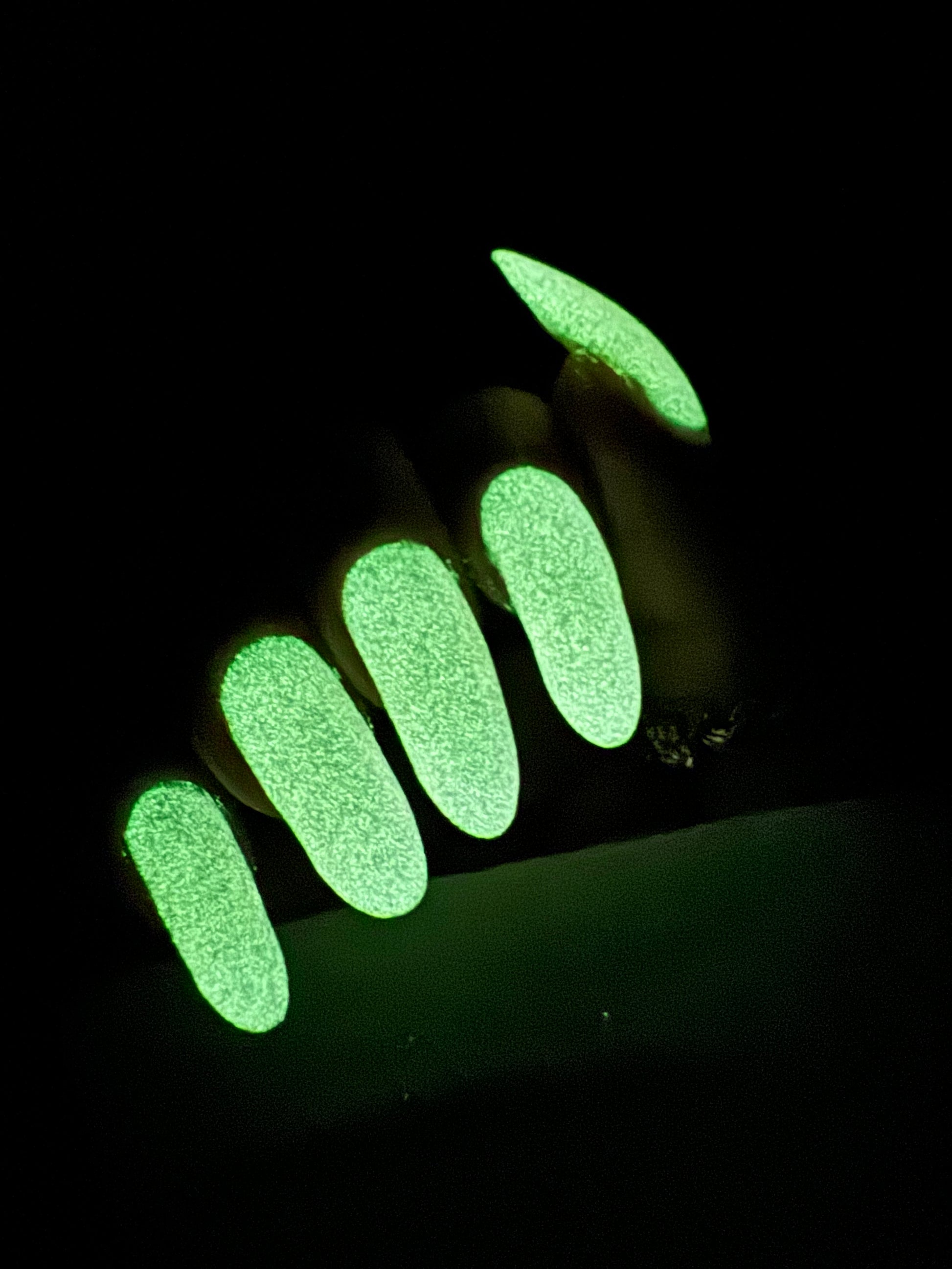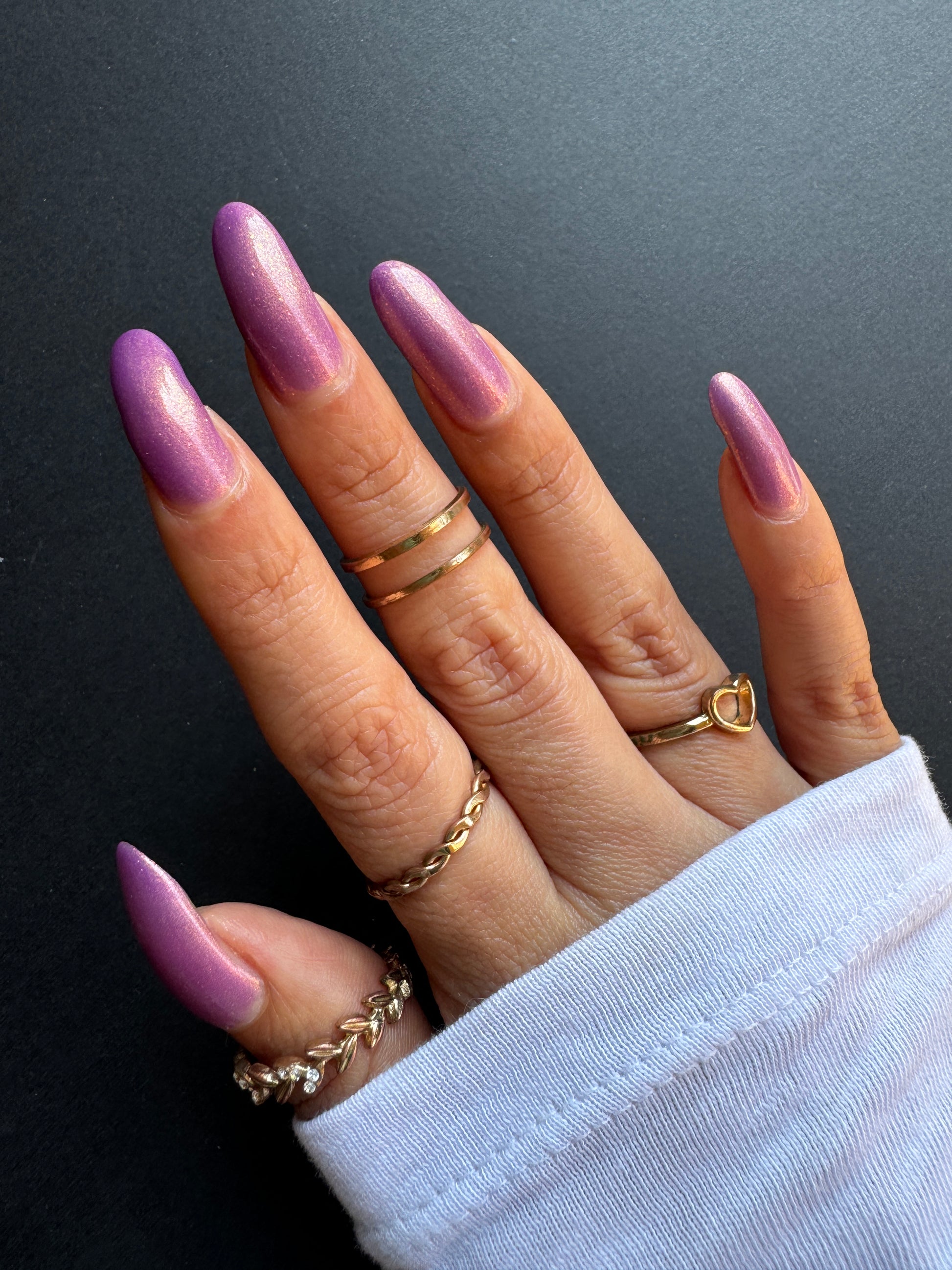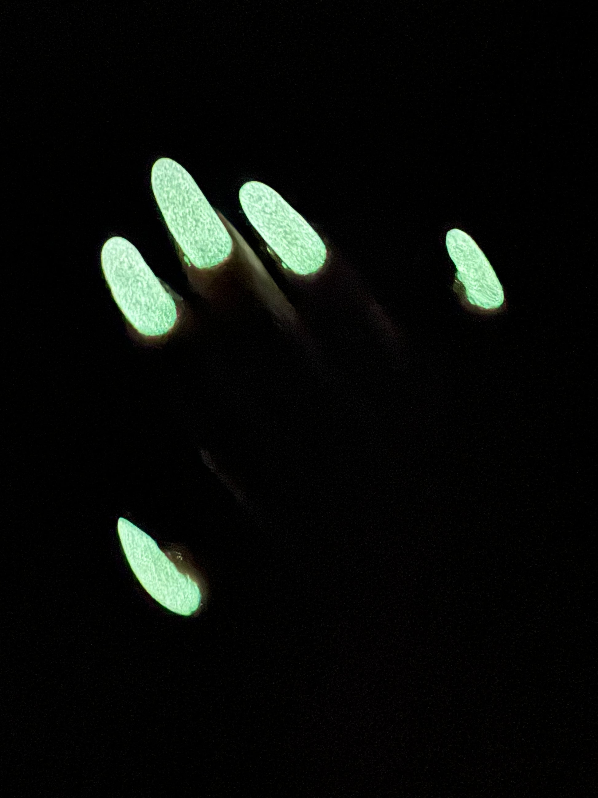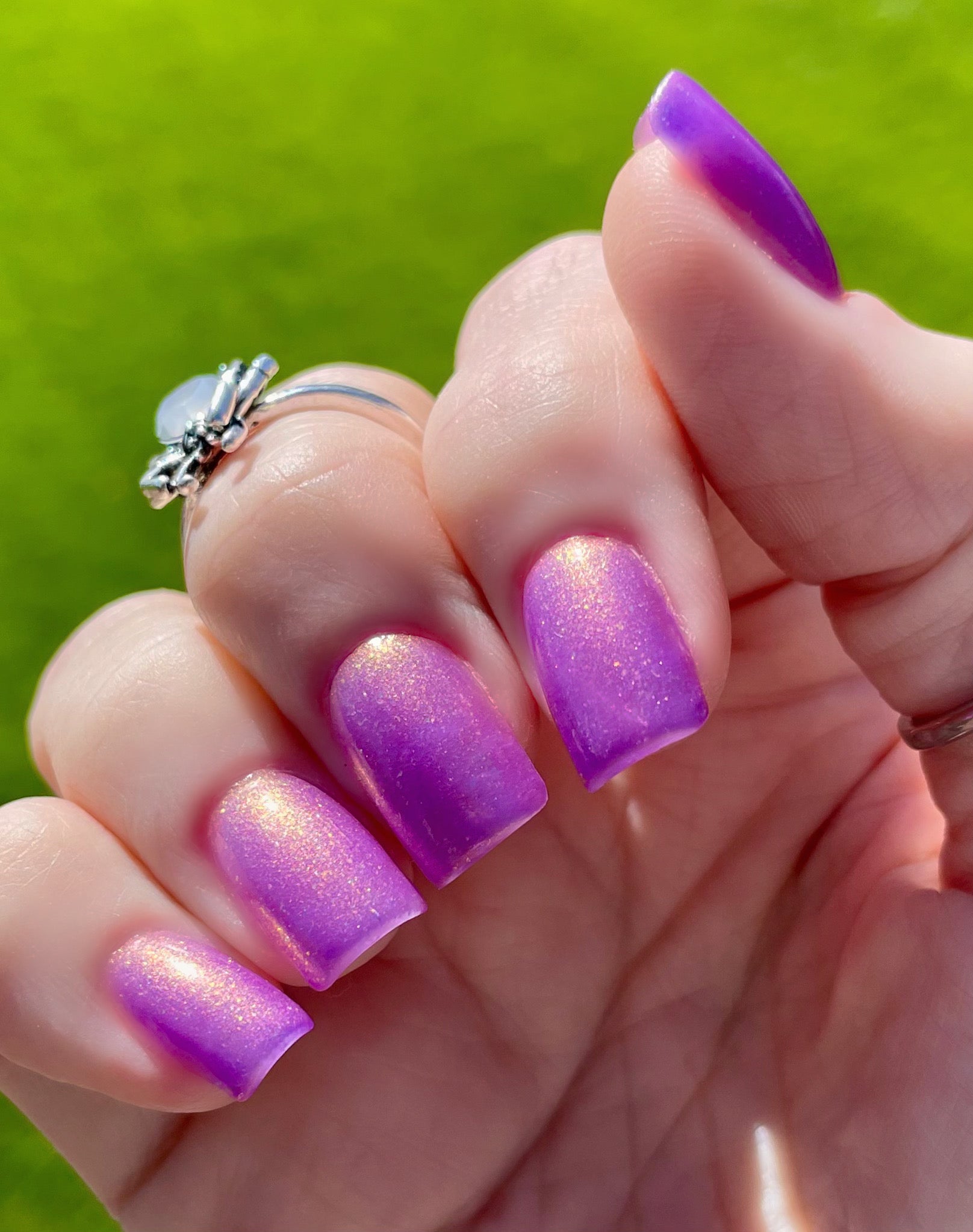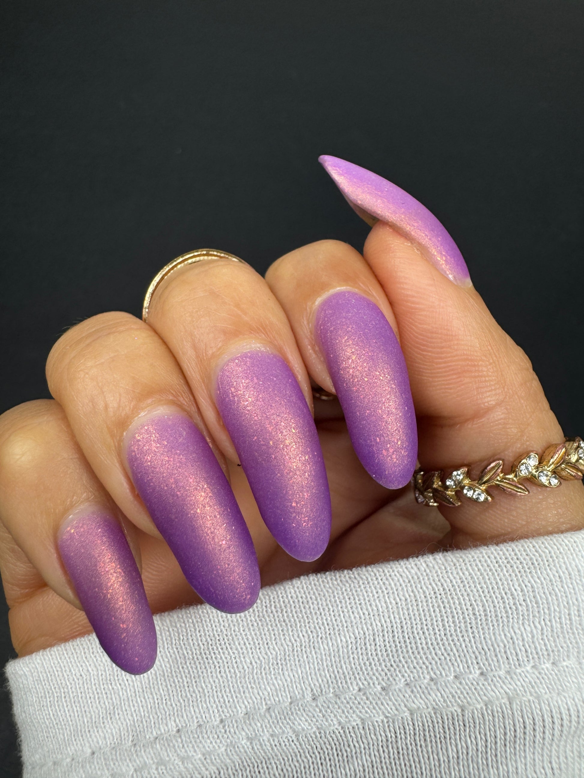 Wail of the Banshee is a light-medium purple glow-in-the-dark polish with orange-gold-green shifting micro flakes and orange shimmer. This polish glows a whitish yellow in the dark.