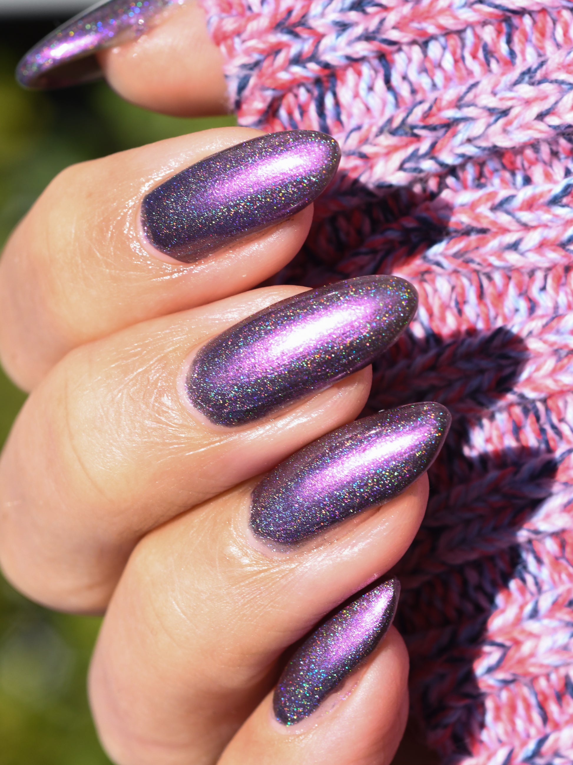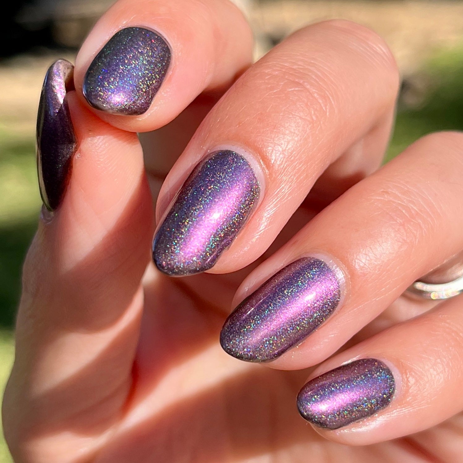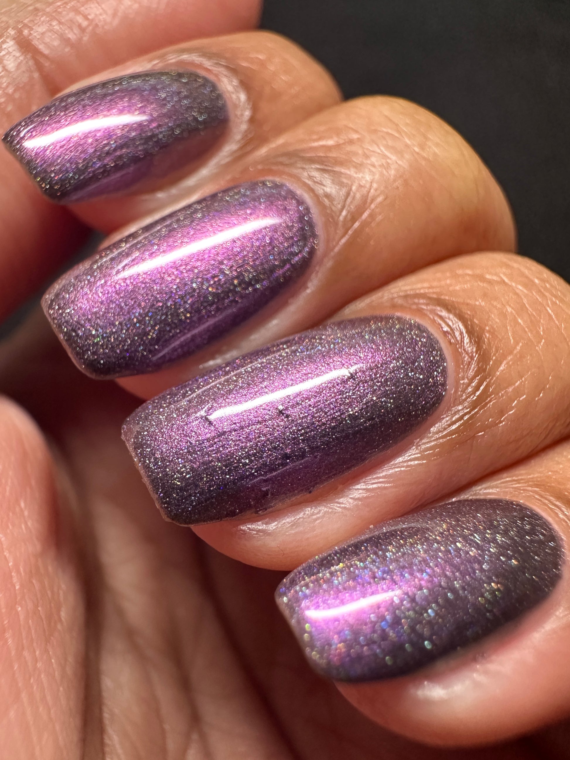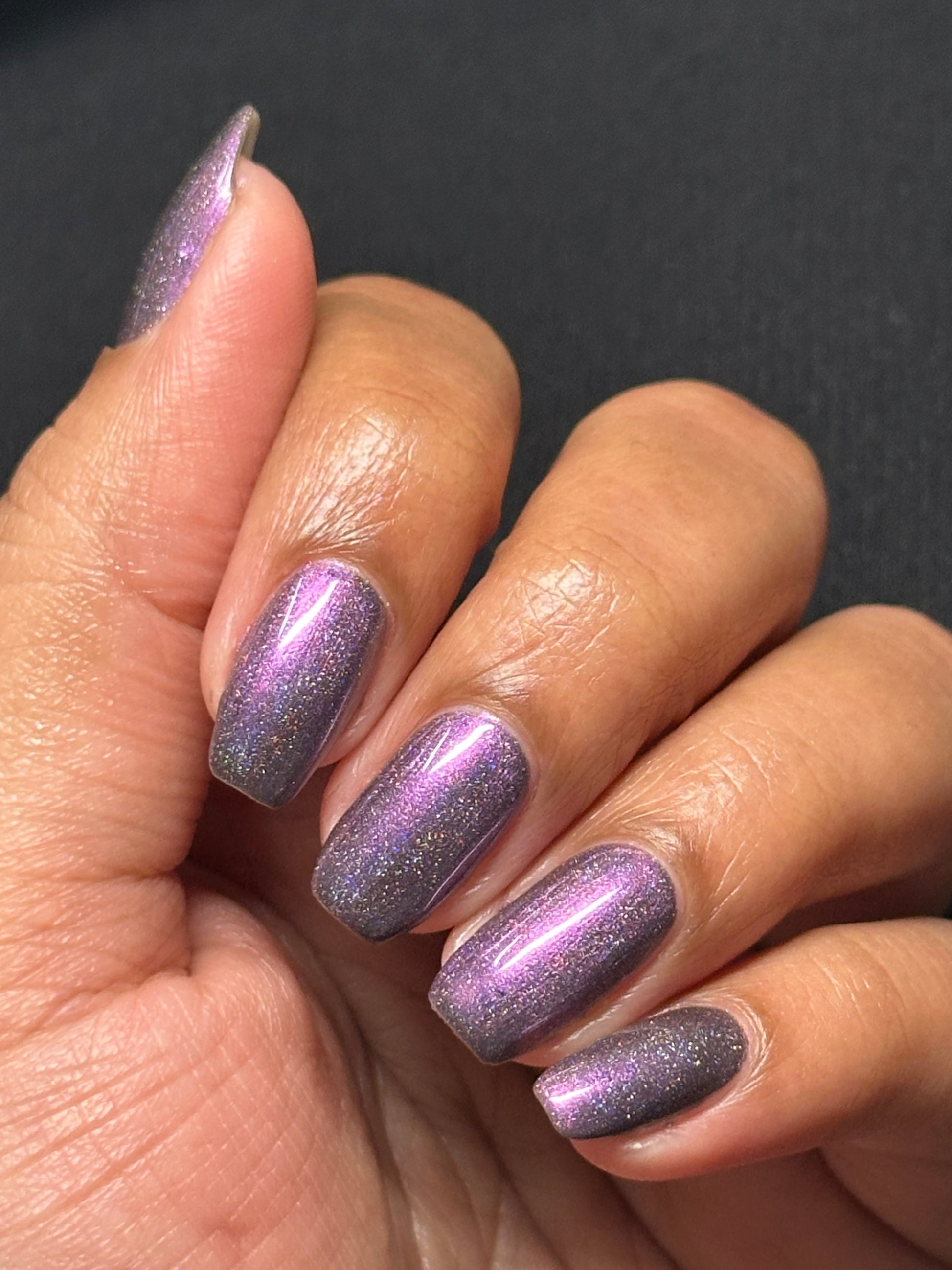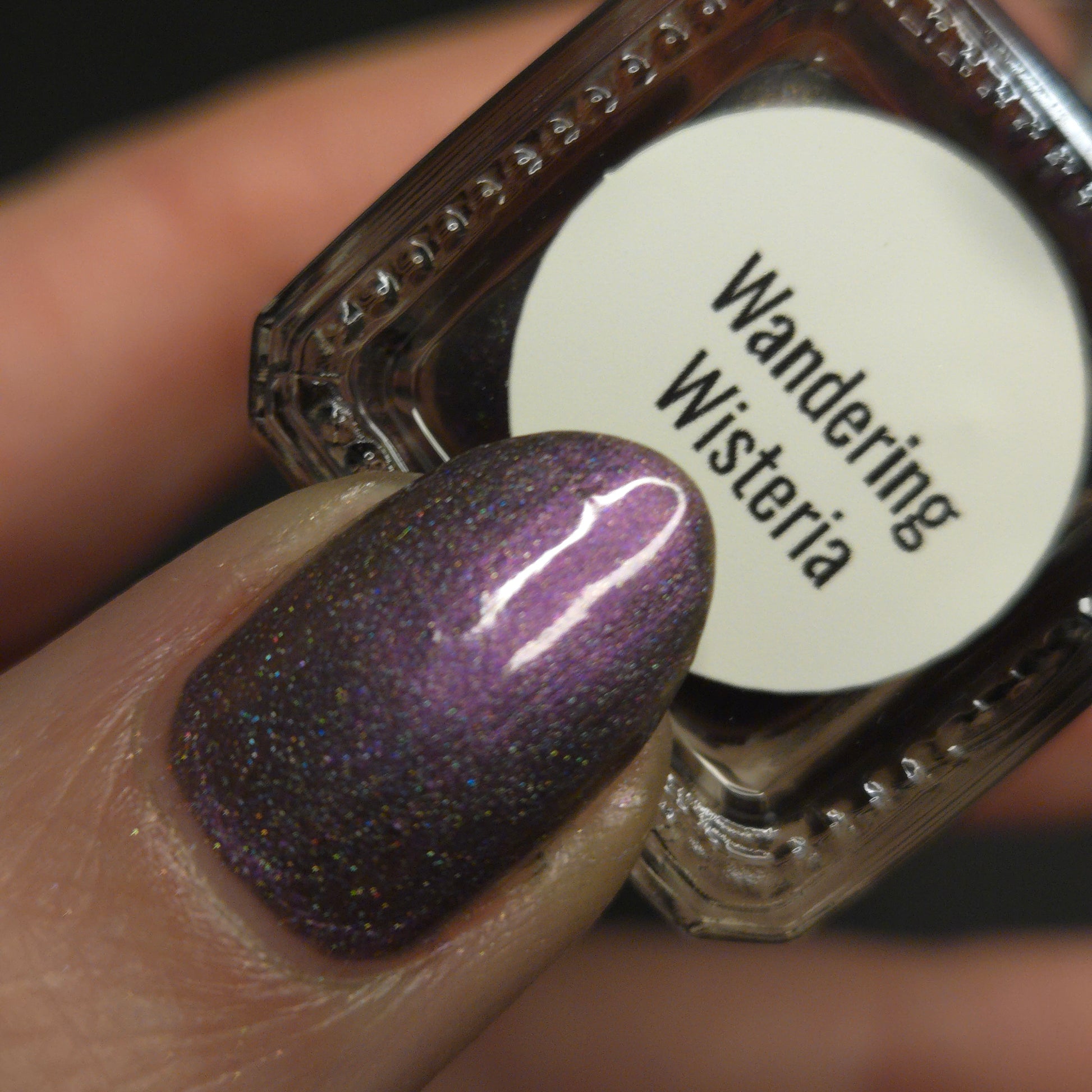 Wandering Wisteria is a black linear holographic polish with a light purple pearlescent shimmer.