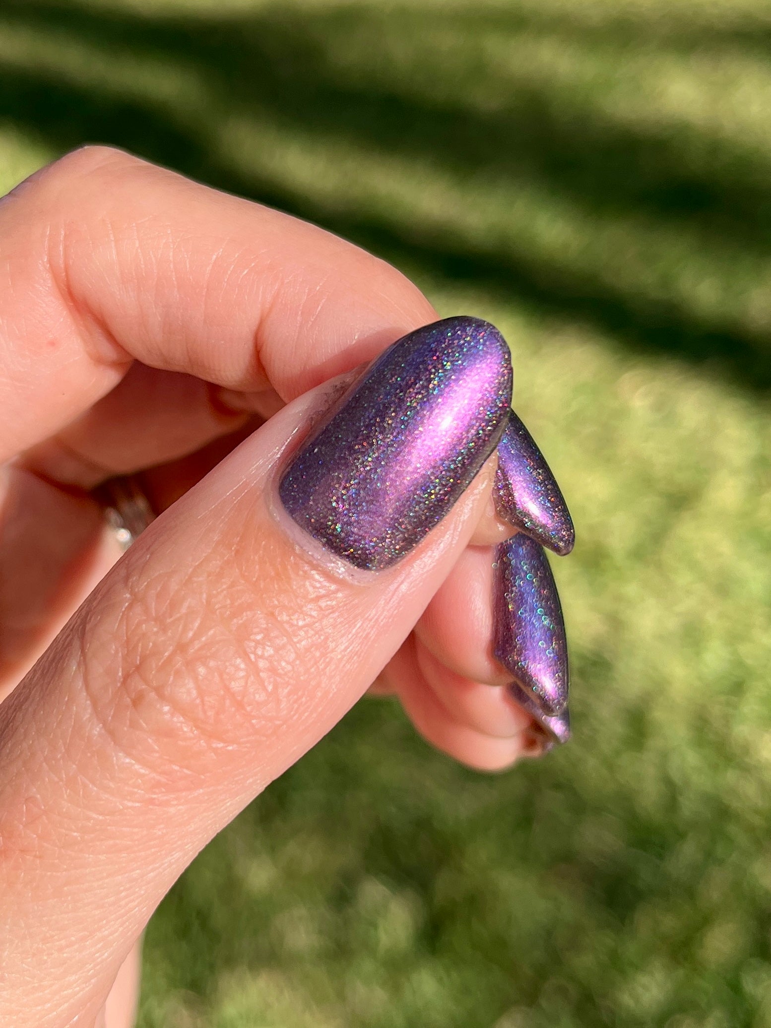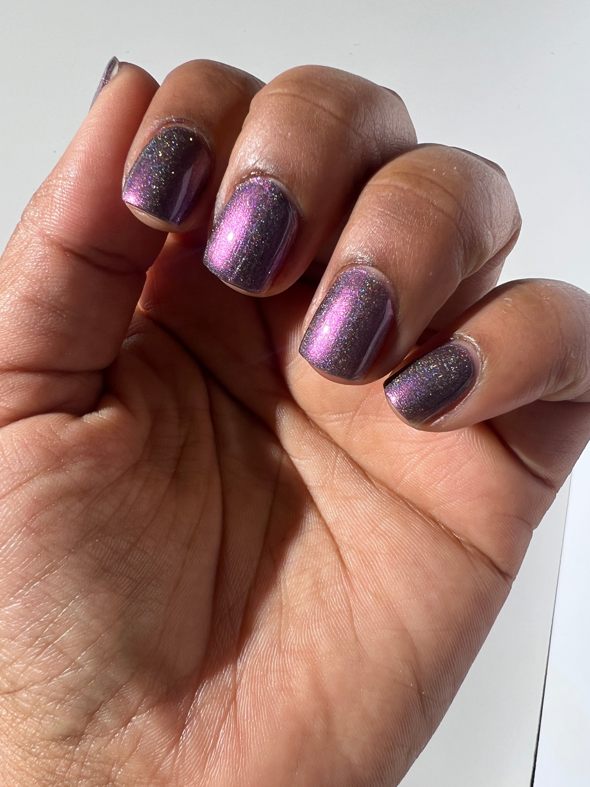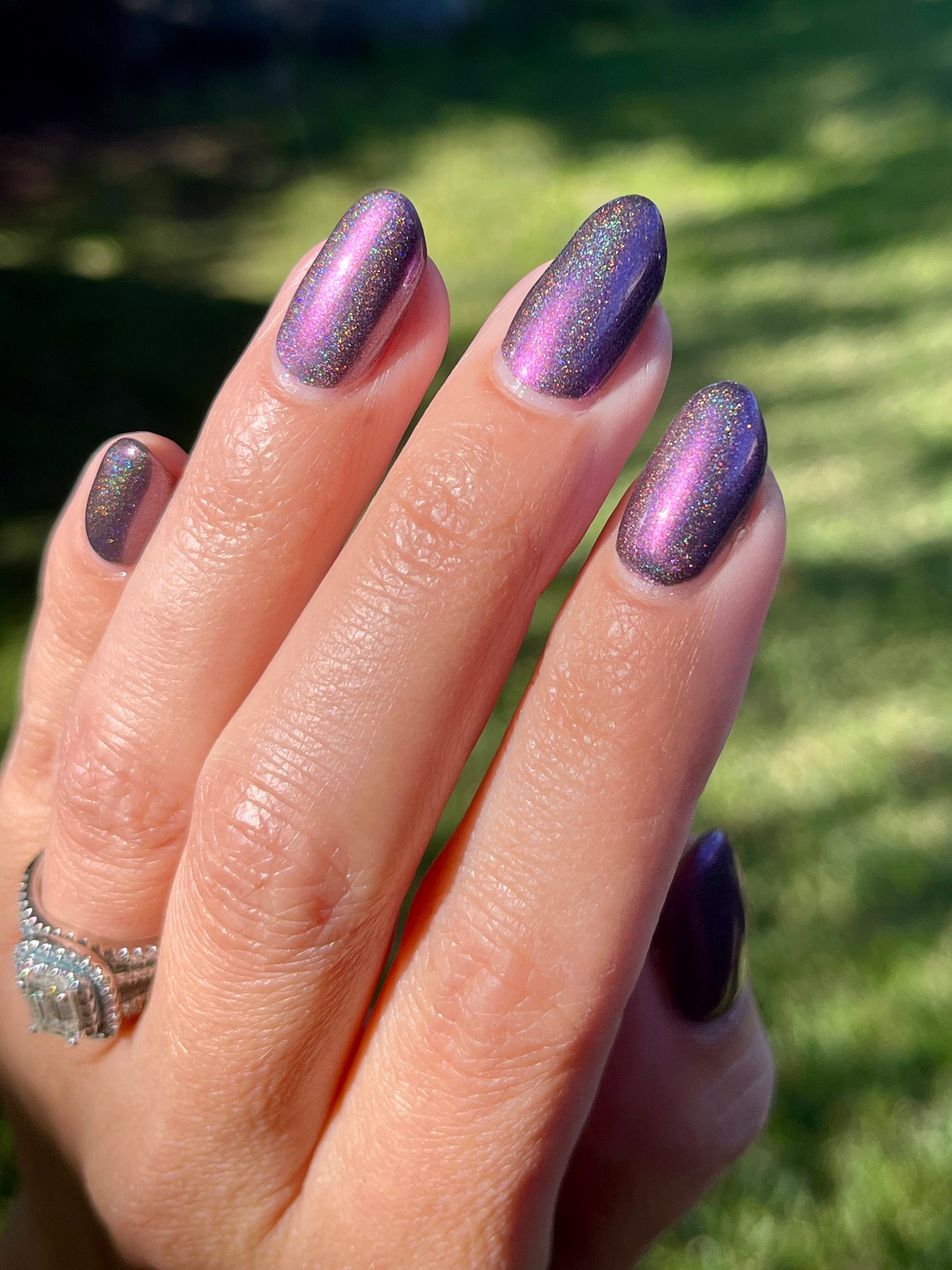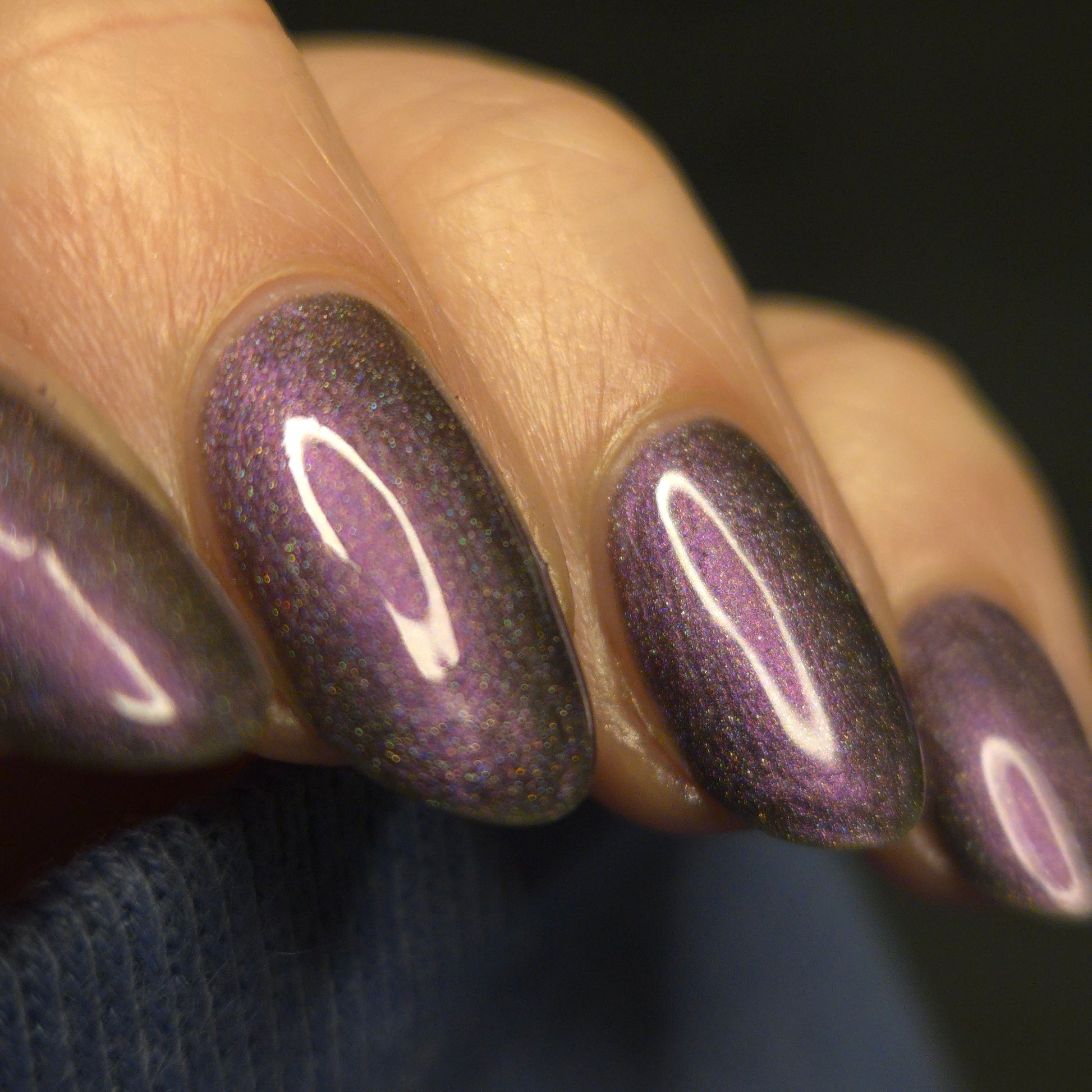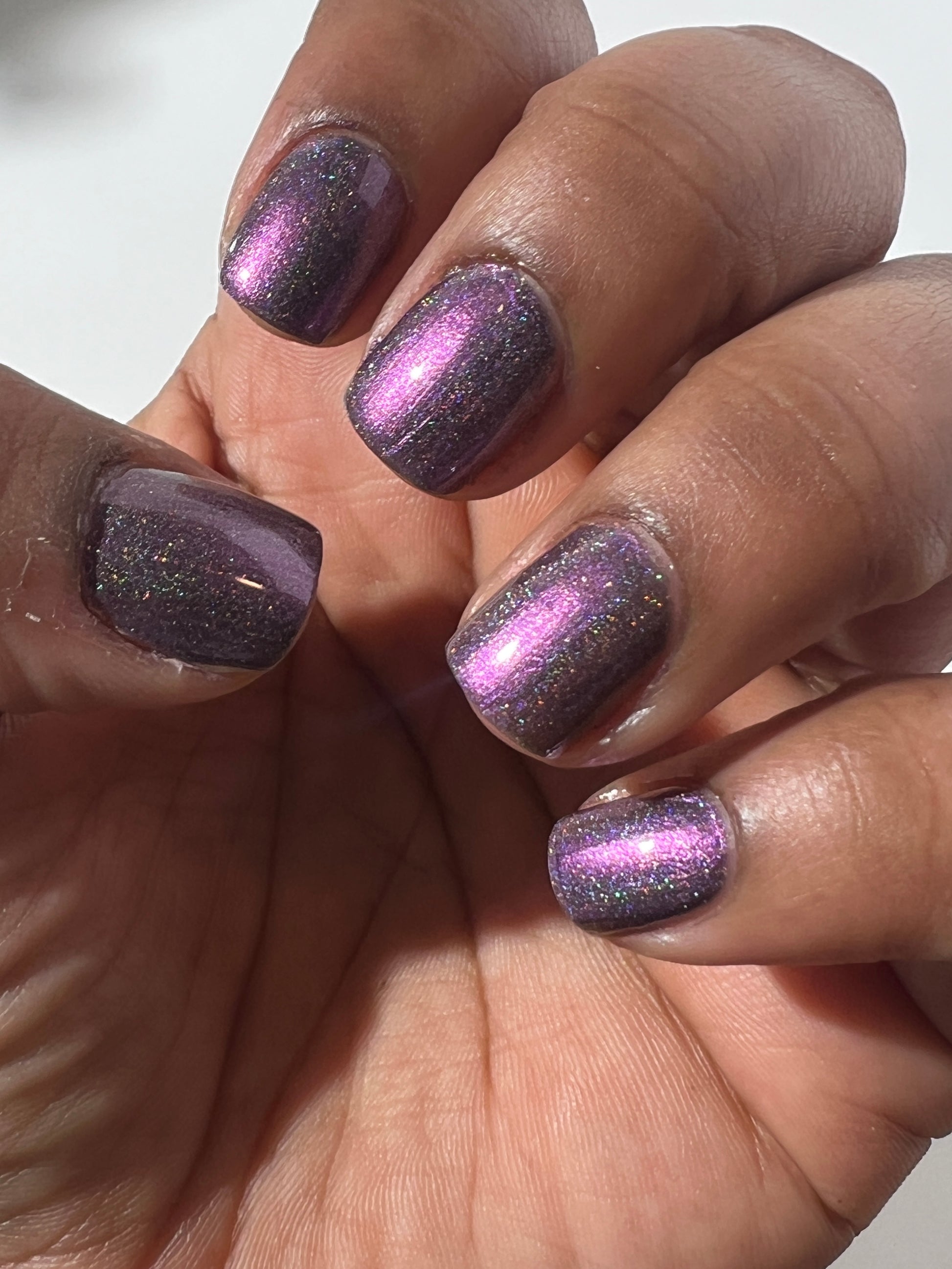 Wandering Wisteria is a black linear holographic polish with a light purple pearlescent shimmer.