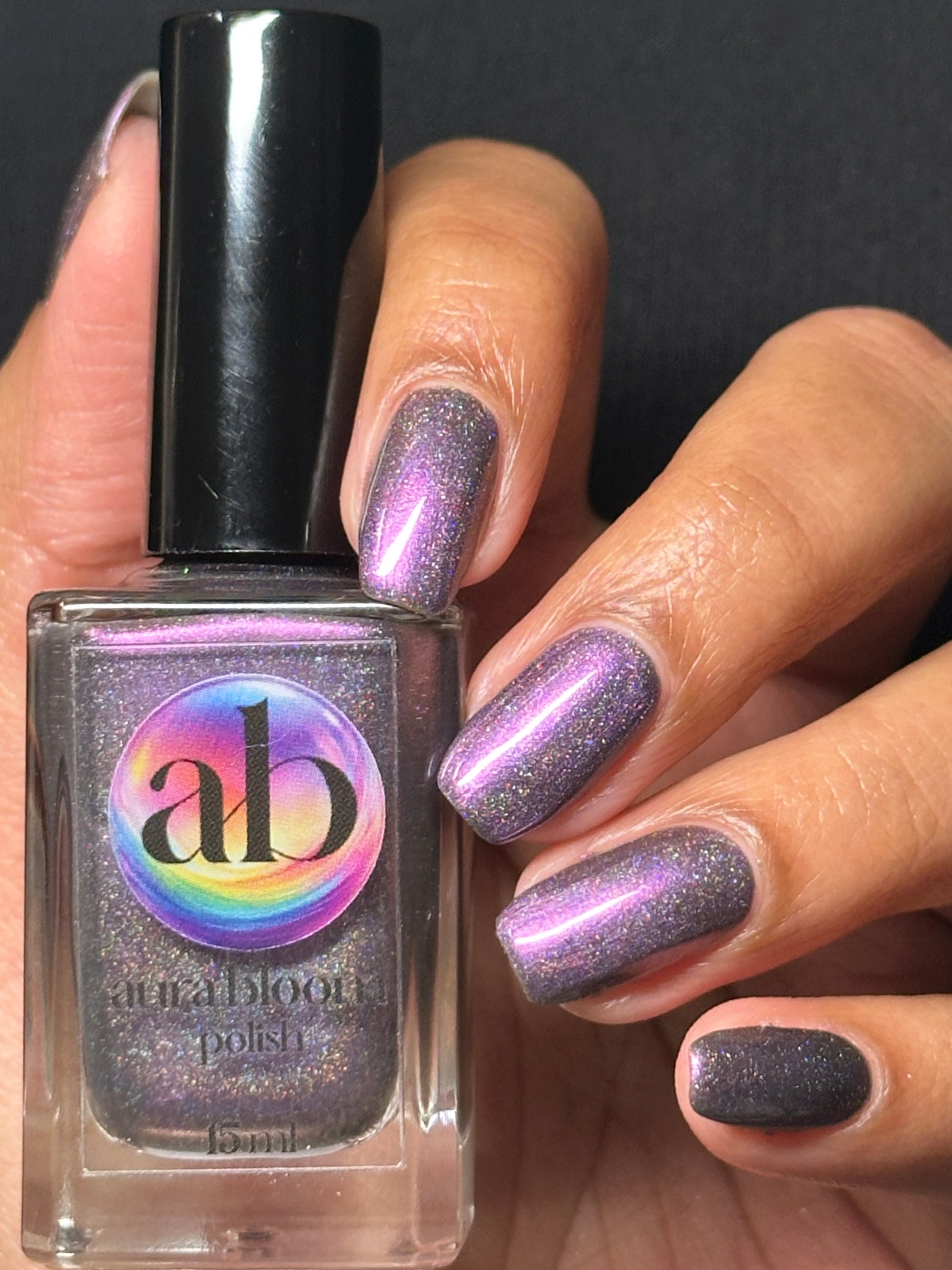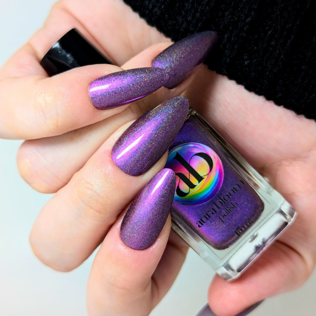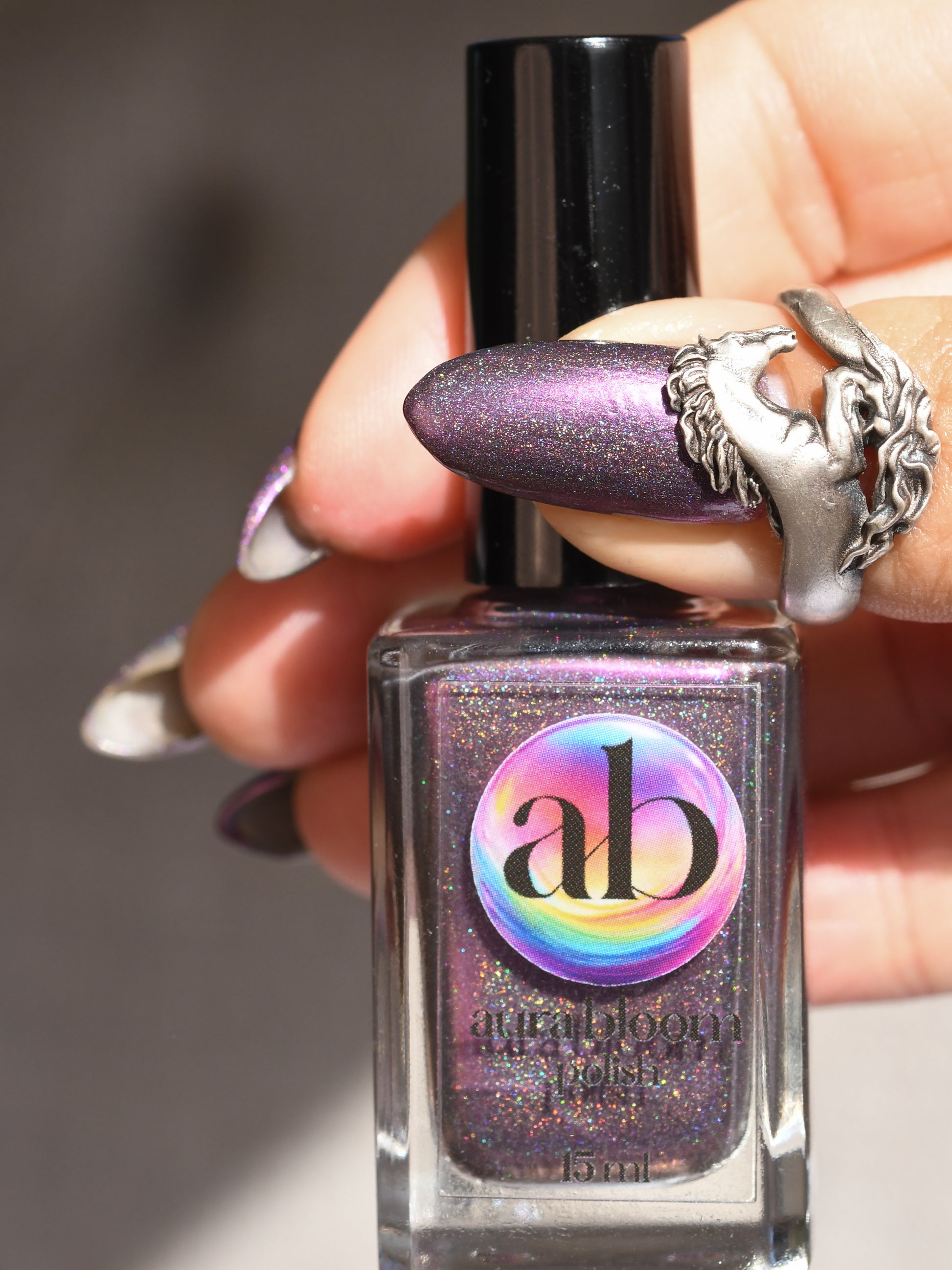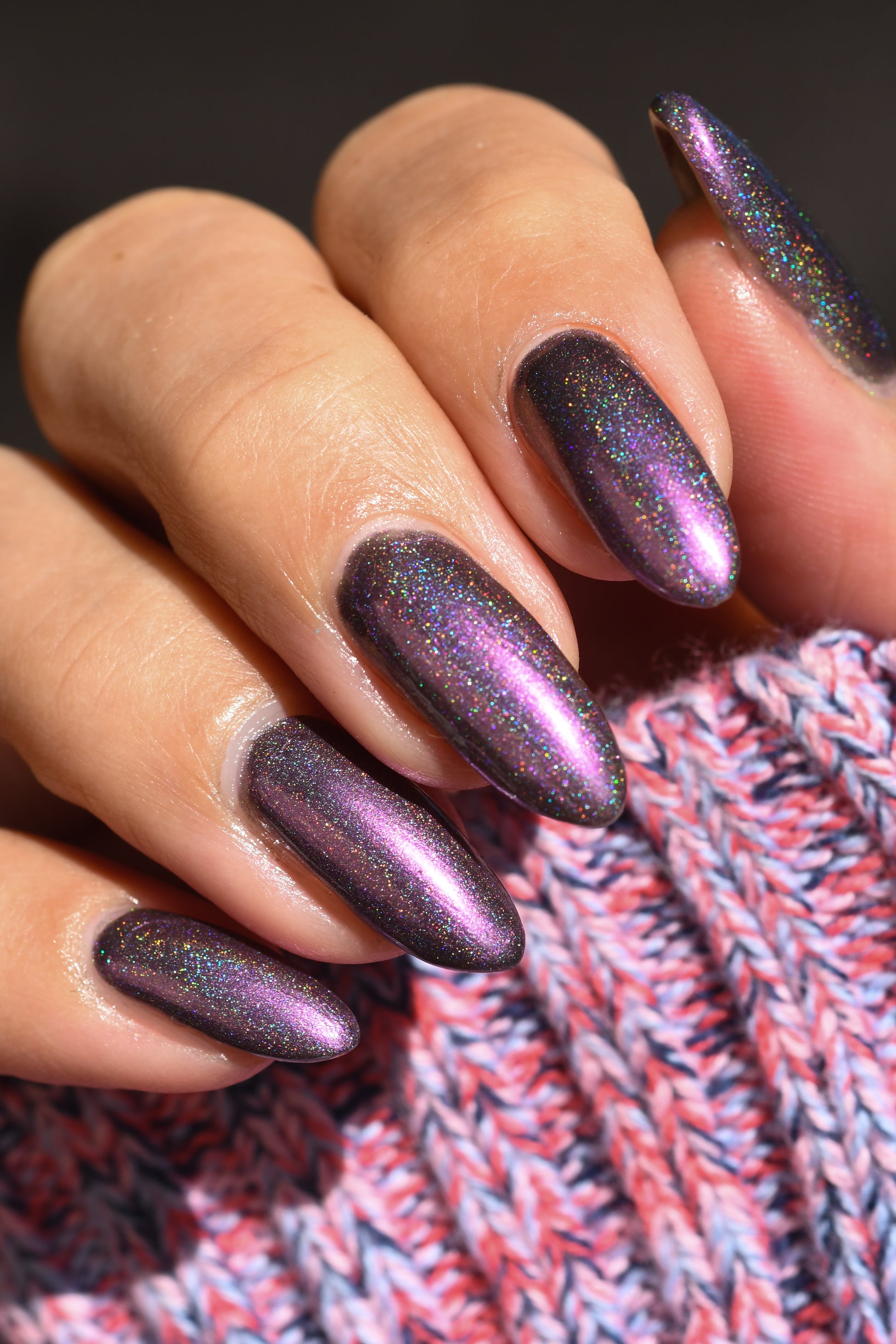 Wandering Wisteria is a black linear holographic polish with a light purple pearlescent shimmer.