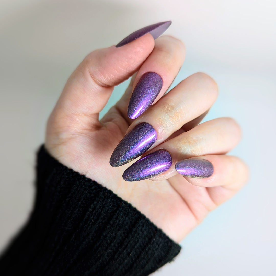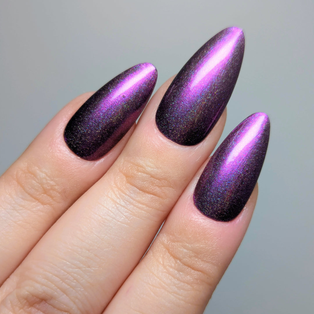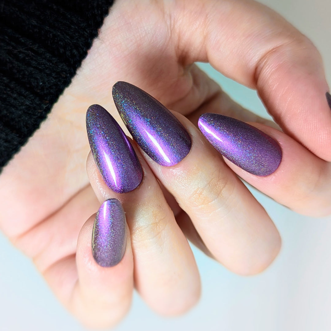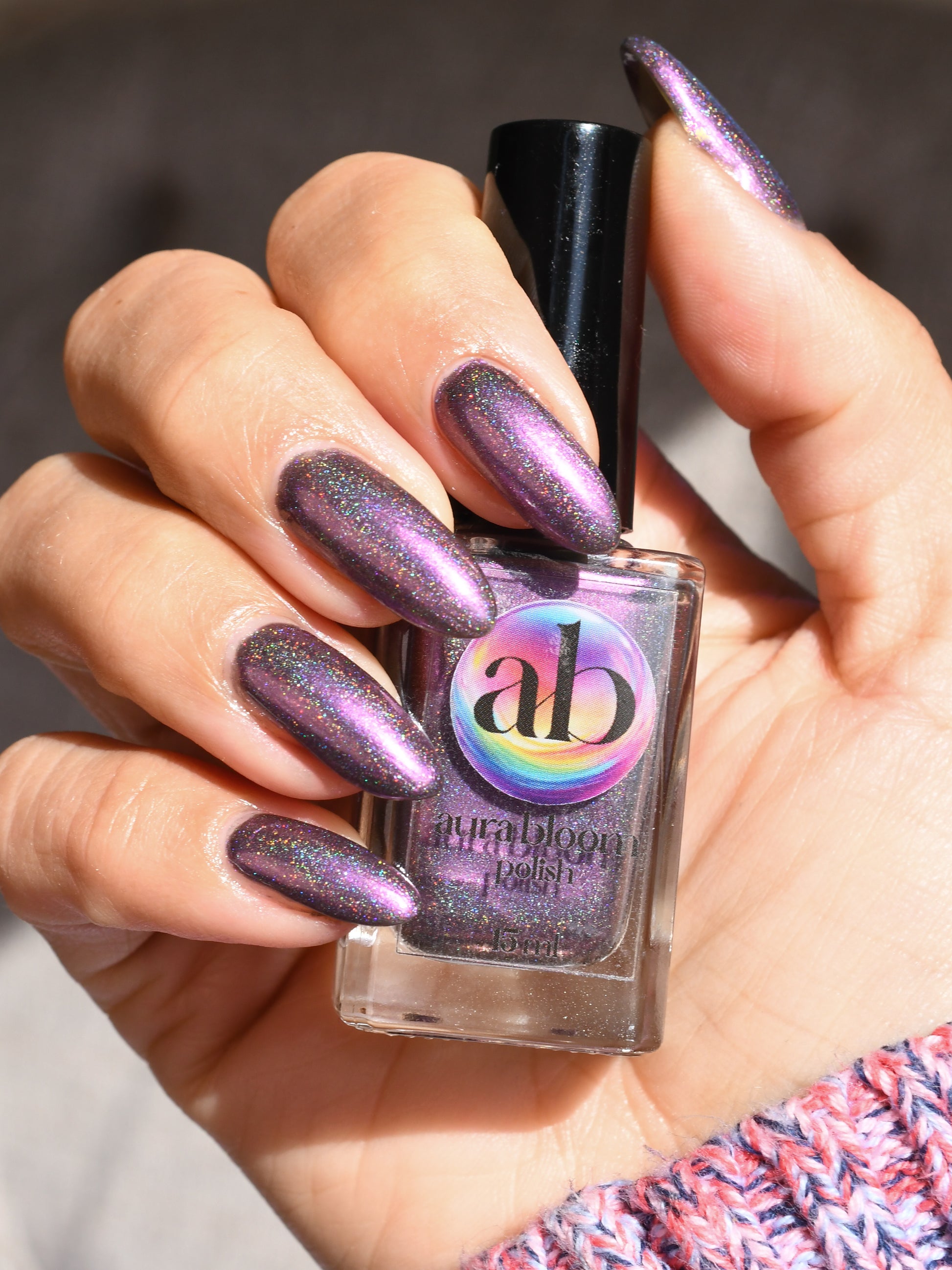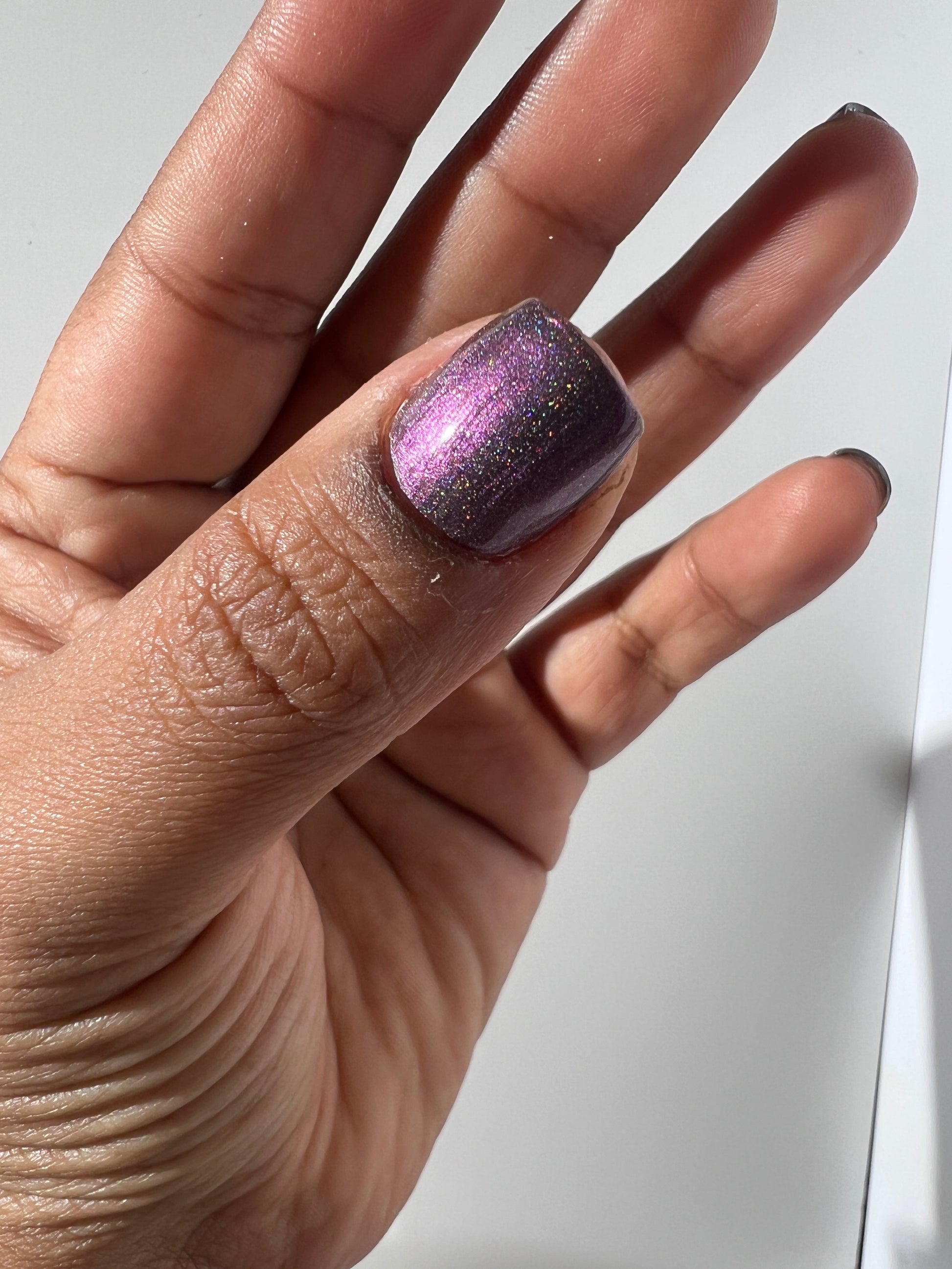 Wandering Wisteria is a black linear holographic polish with a light purple pearlescent shimmer.