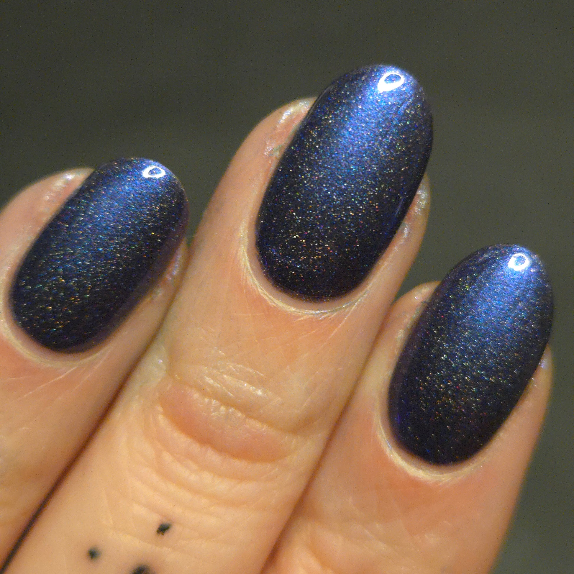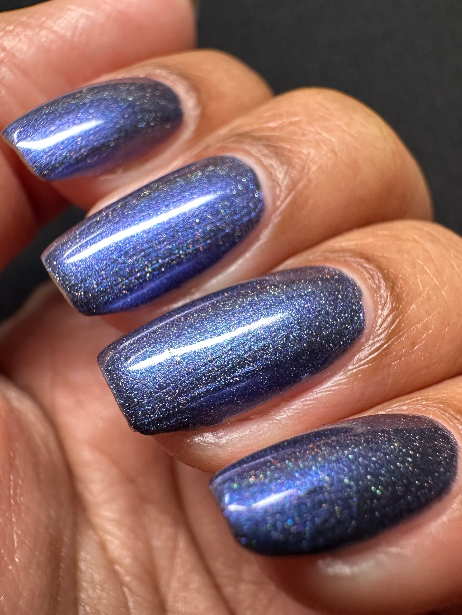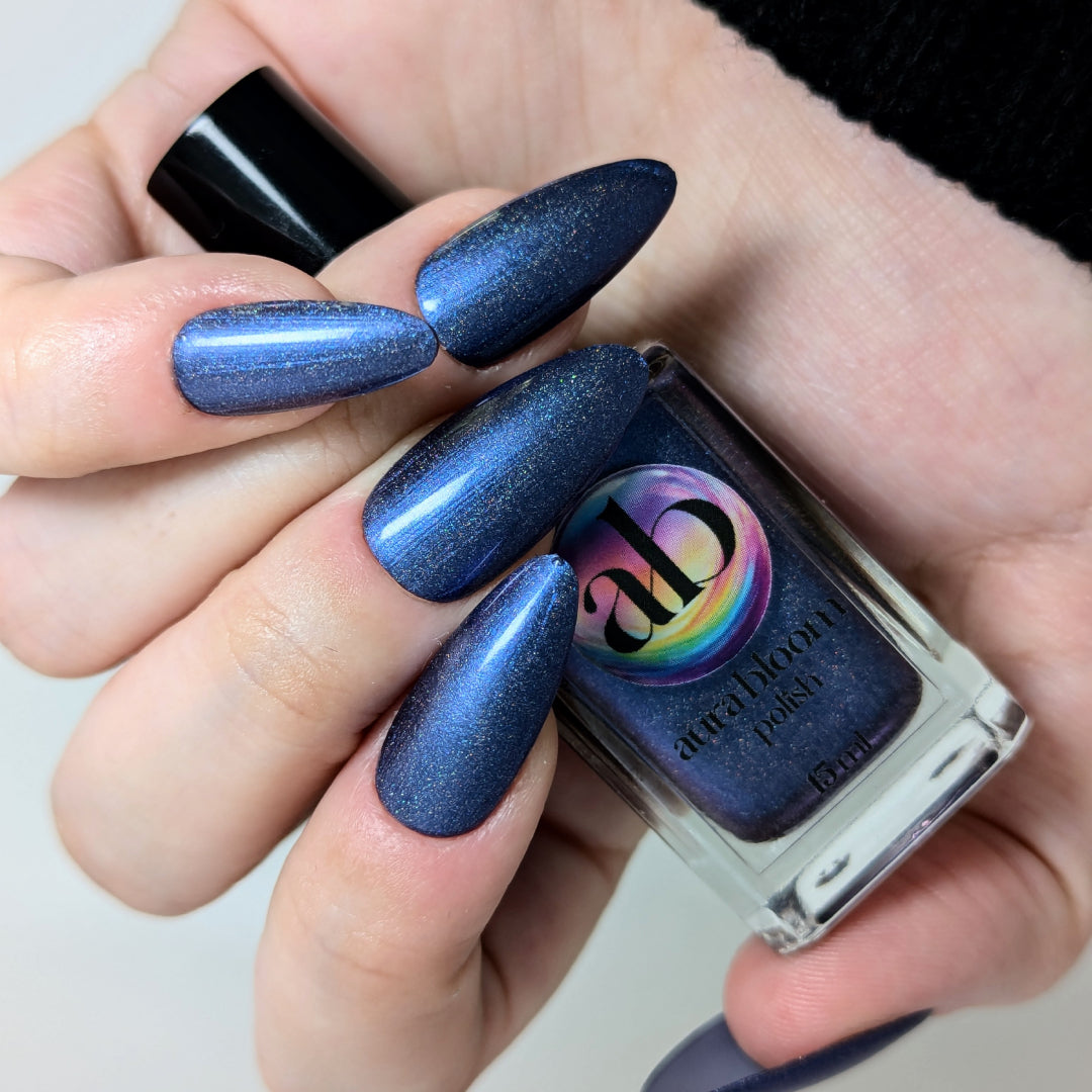 🌌Nightfall Nimbus is a black linear holographic polish with a medium-dark blue pearlescent shimmer. Looking up at the captivating midnight sky, as the storm clouds roll in and eclipse the moon, these clouds will shower down upon the forest canopy soon.