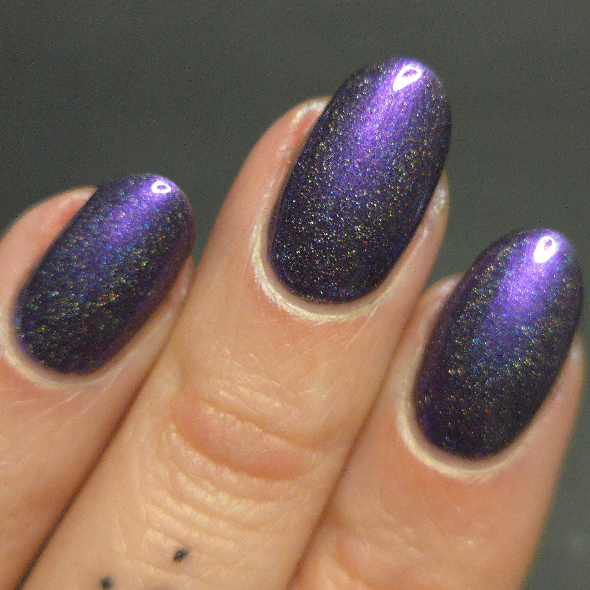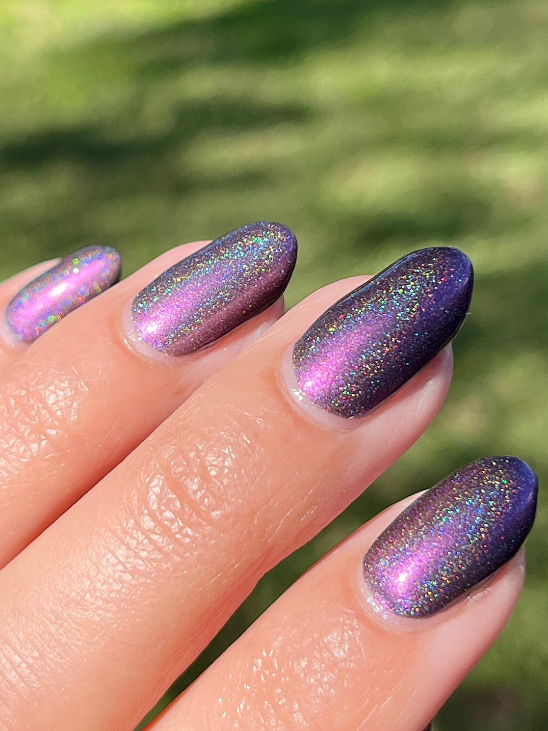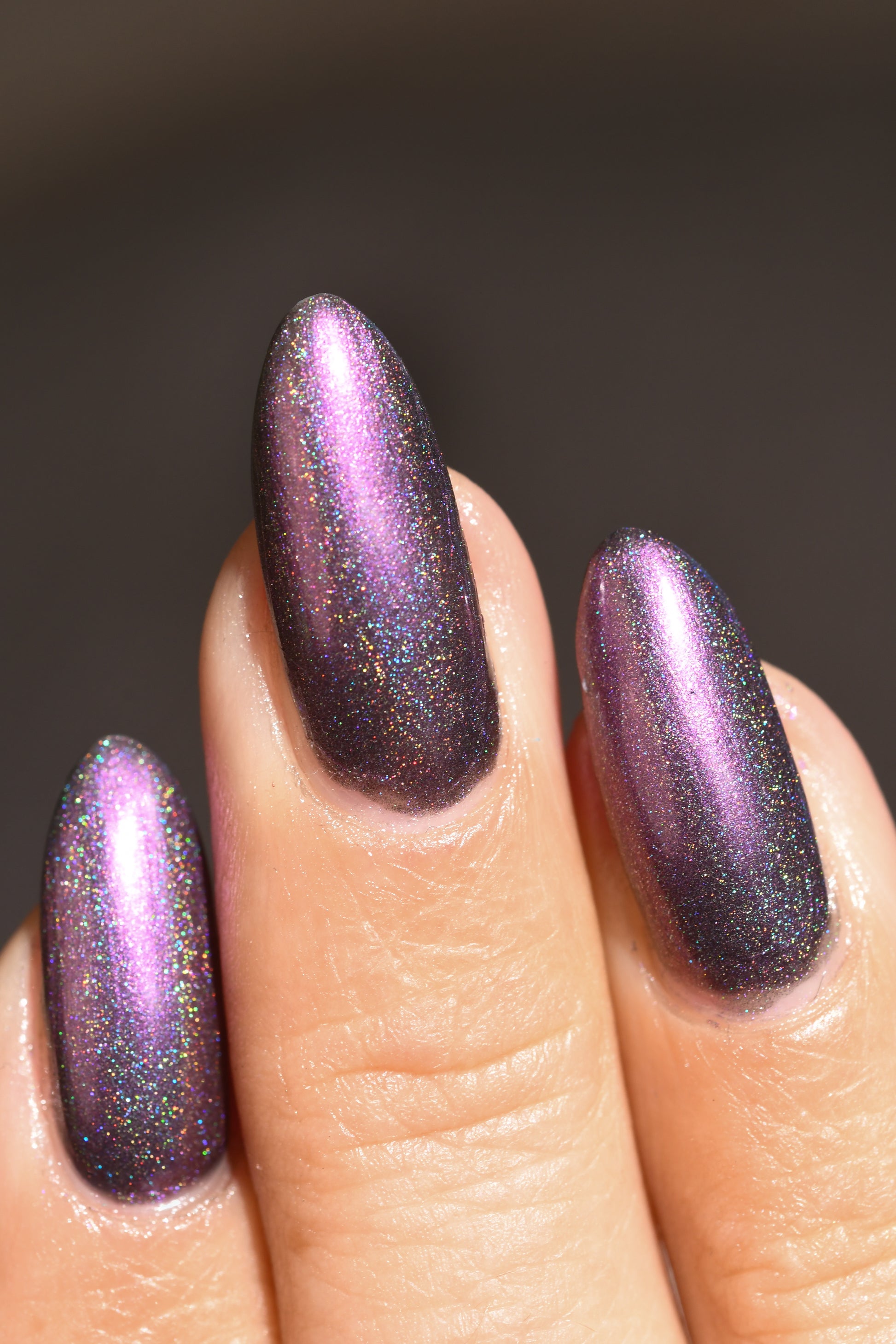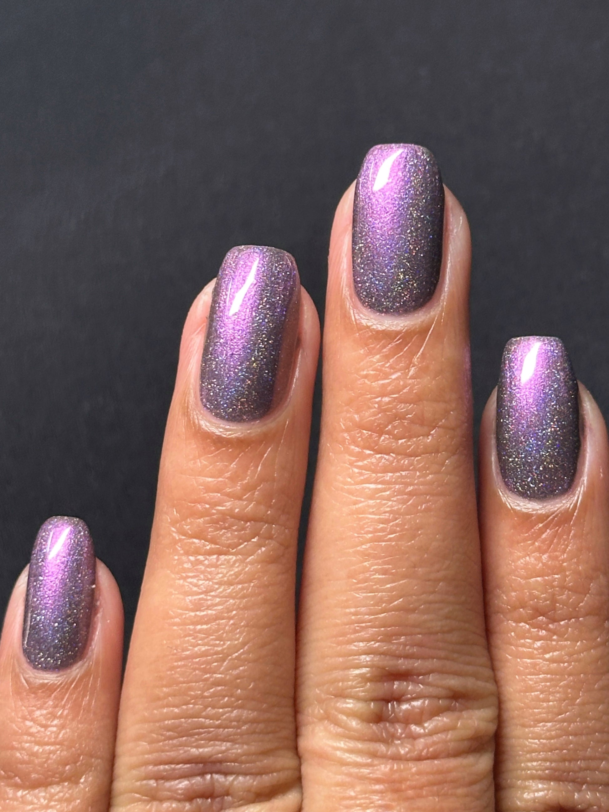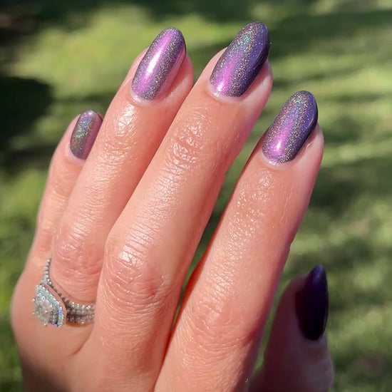🔮Arcane Amethyst - a black linear holographic polish with a rich purple pearlescent shimmer. When the moon hits the glow of the unearthed raw amethyst, you can feel the energy humming as it calms and protects the forest.