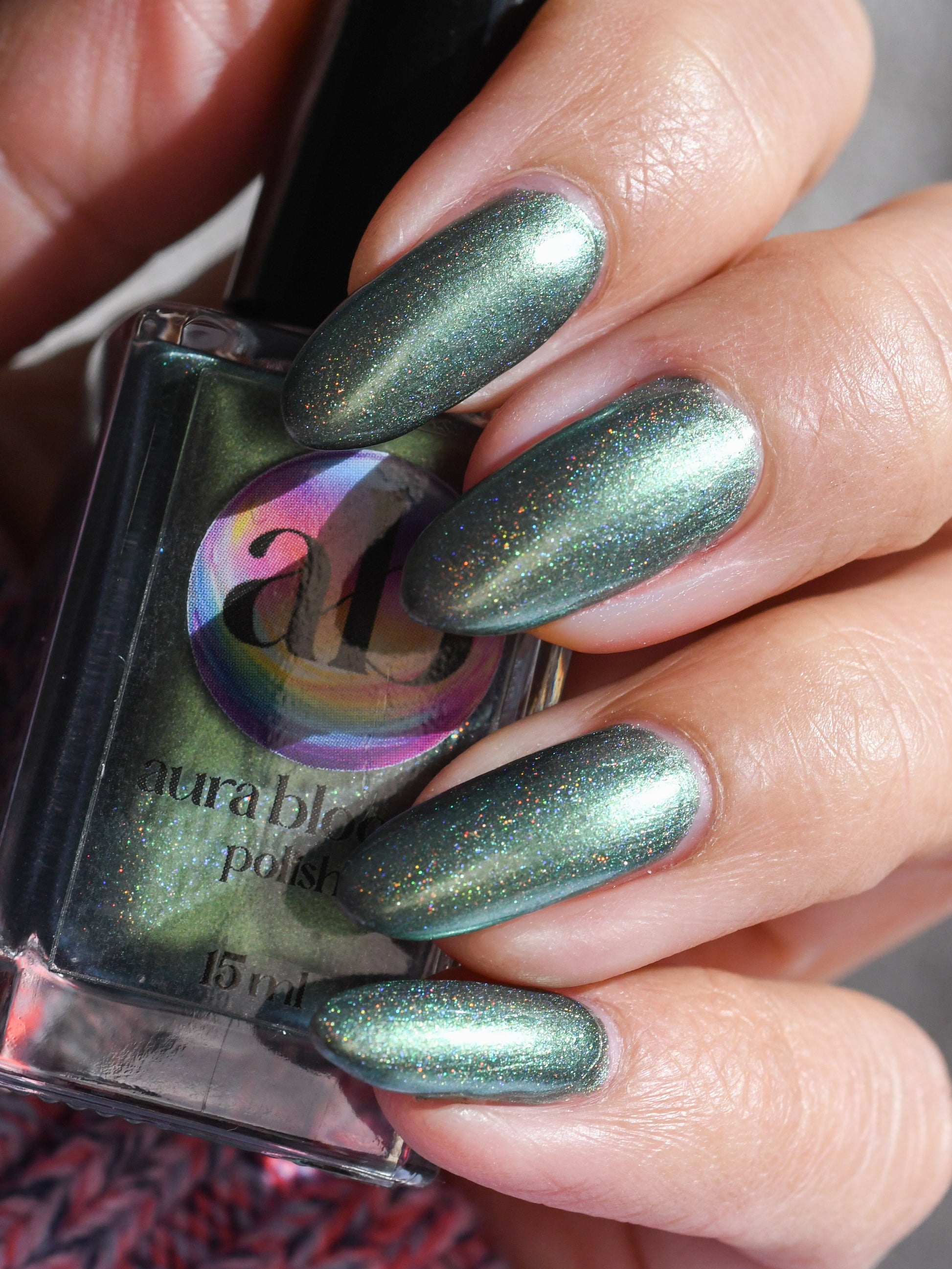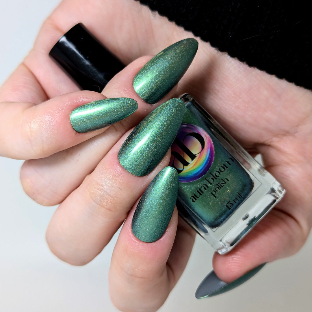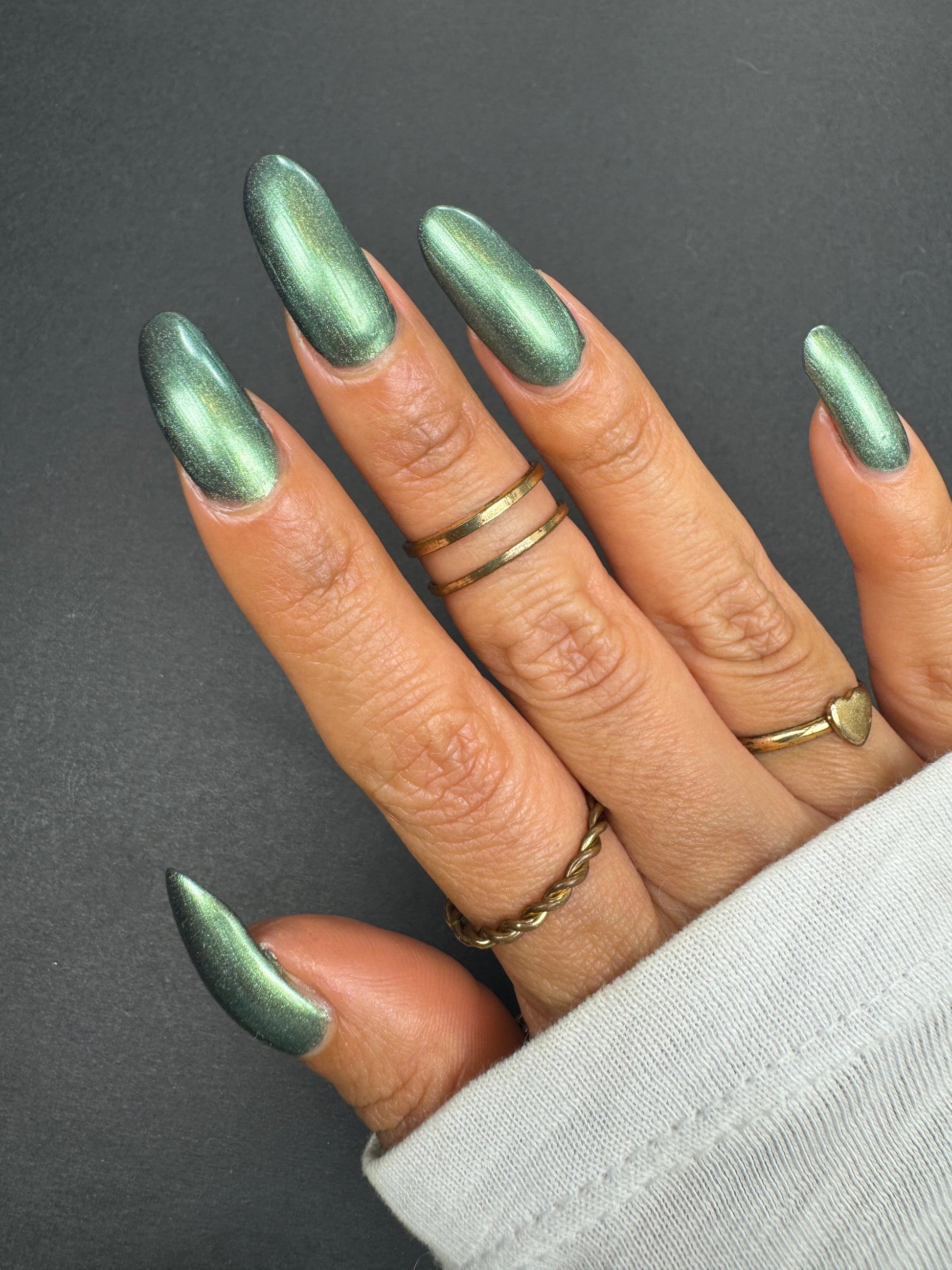 🌿Verdant Veil is a black linear holographic polish with a medium sage green pearlescent shimmer. Like a lush green foliage veil covering up the secrets the wilderness is hiding, the twilight shadows welcome you to come in and but be careful, they can be misguiding.