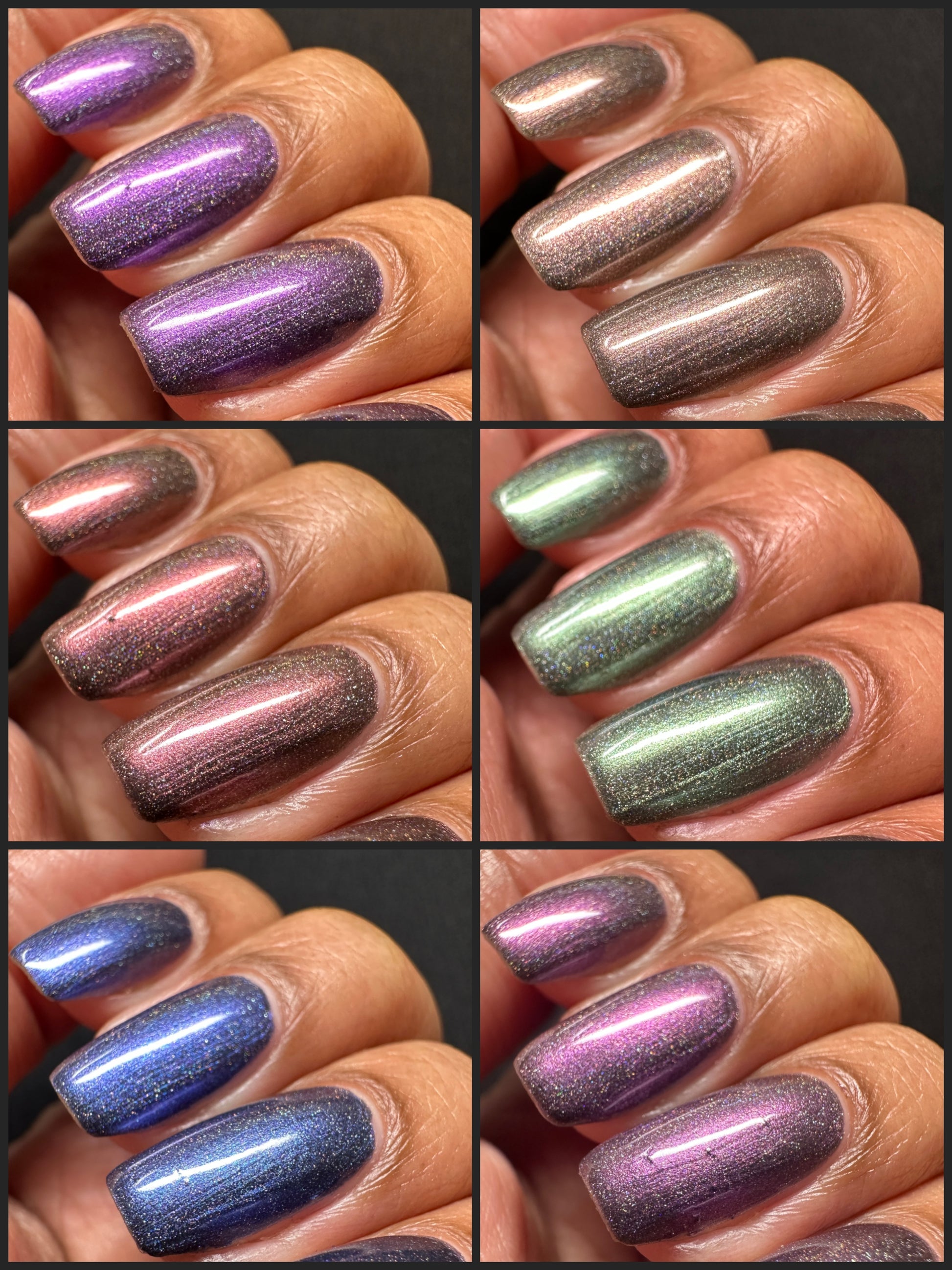 Whispers of the Wilderness is a collection of 6 polishes that are both a linear holographic and a pearlescent polish which creates an illusionary midnight star-filled sky with a pop of pearly mystical color. They are inspired by the magical and mysterious wilderness and the secrets that it keeps at night.