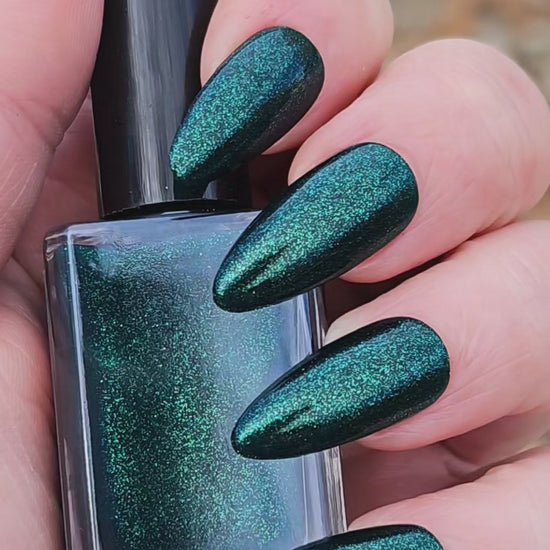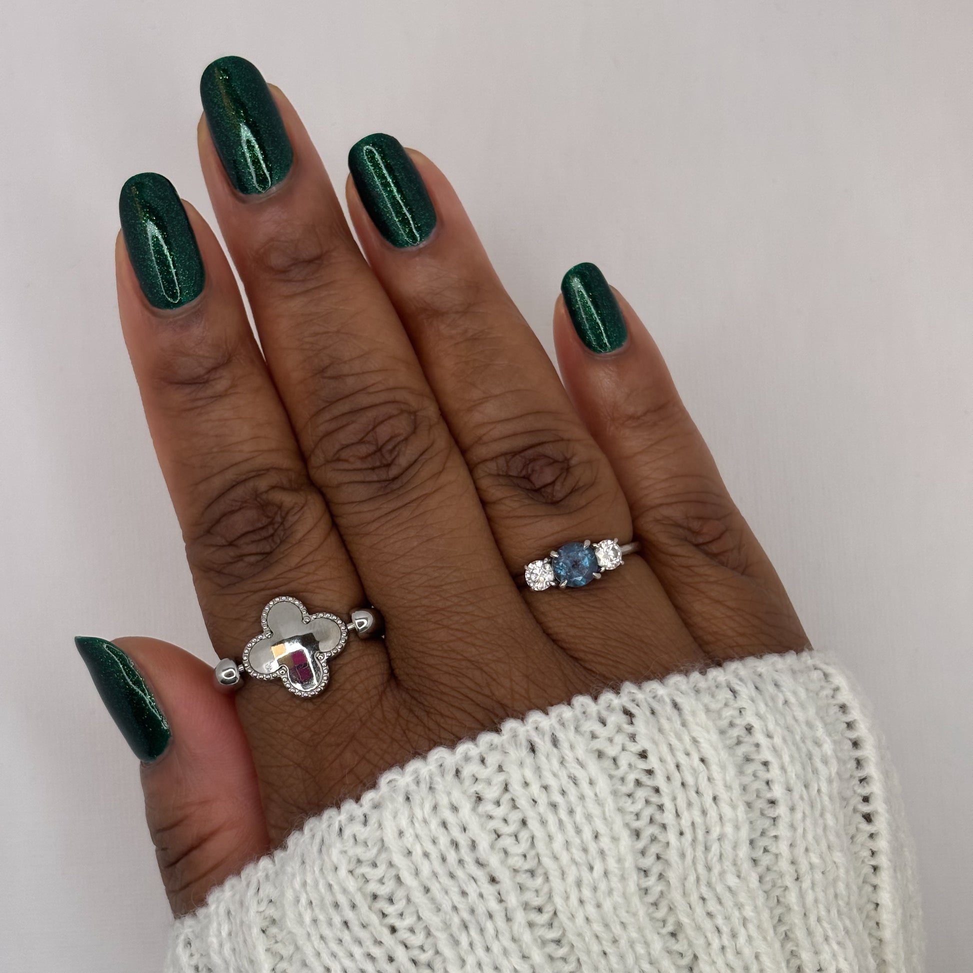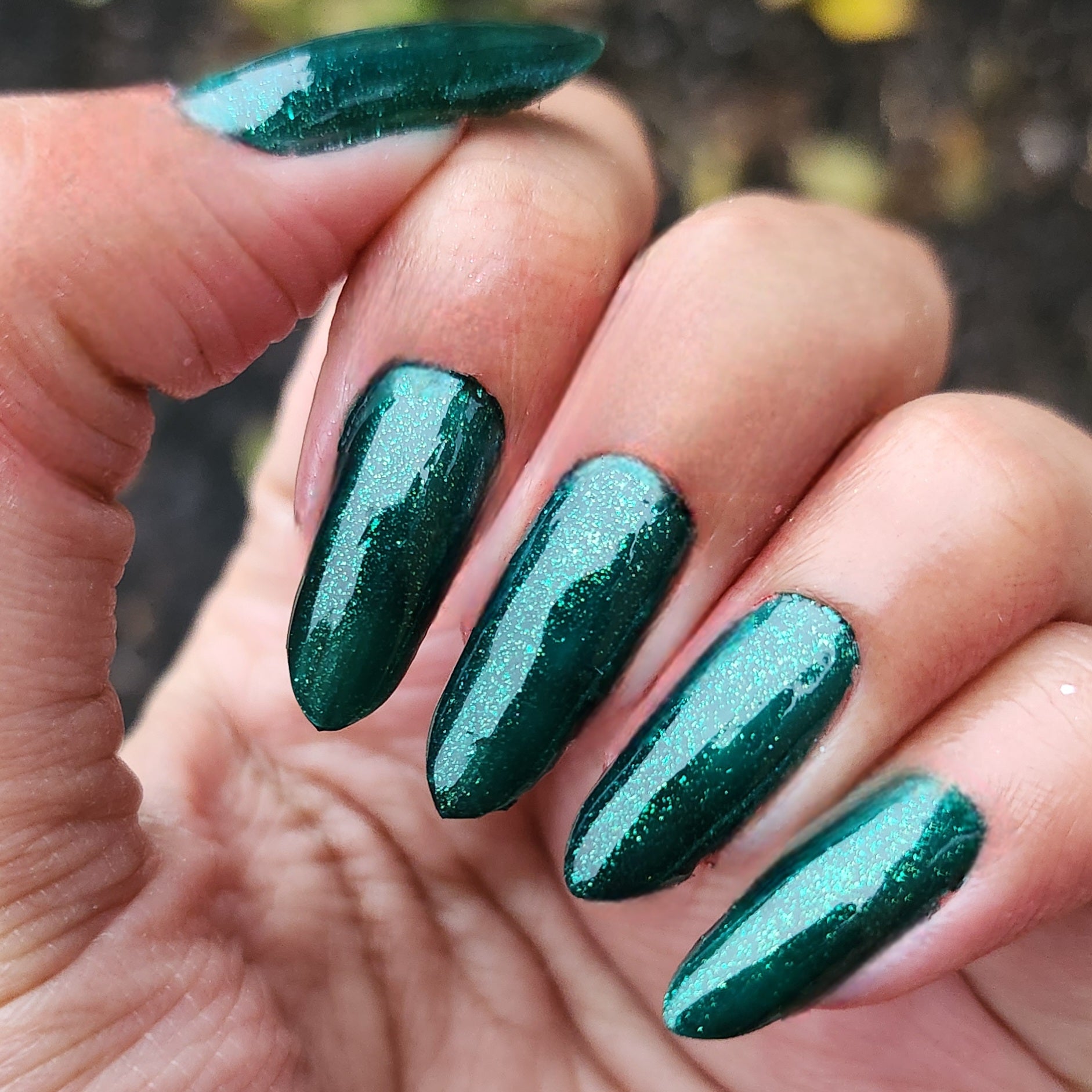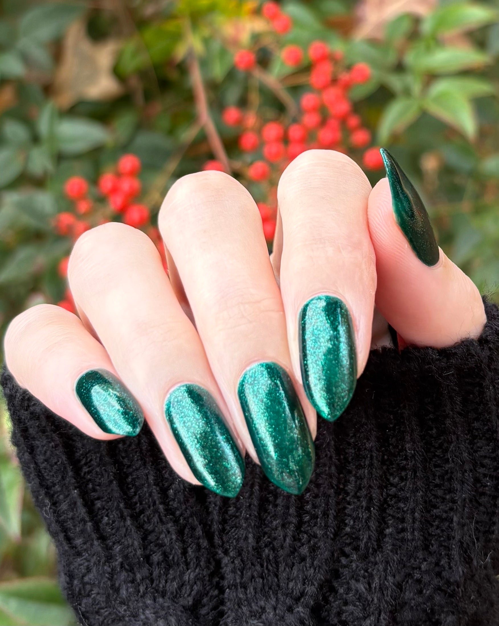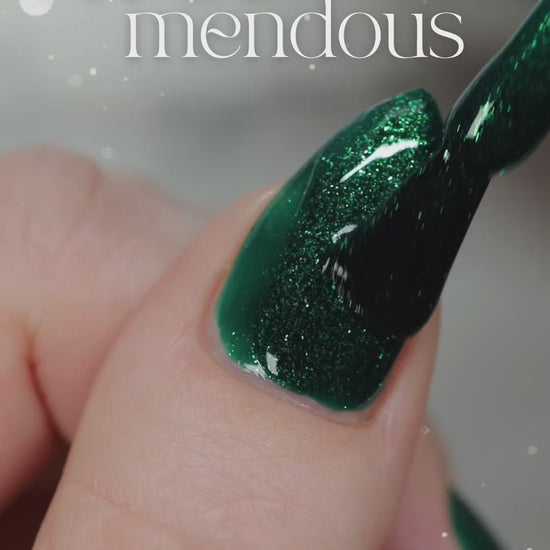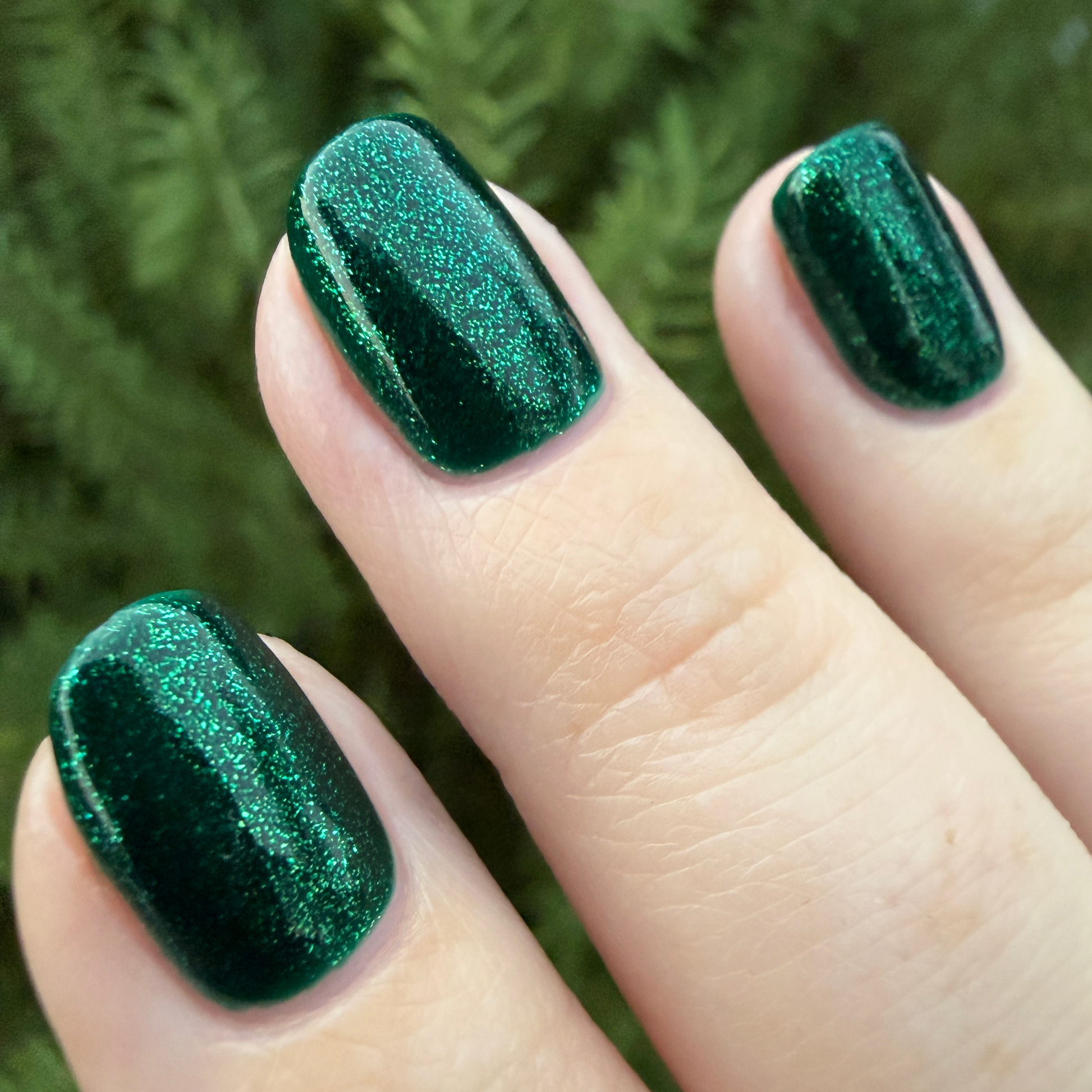 You're Tree-mendous is part of our Classic Holiday Tree-o Set. It's a medium-dark evergreen colored nail polish packed with glittery and sparkling green-to-yellow micro flakes to give an appearance of glitter, but contains zero glitter. This is a jelly-leaning polish. They are like a jelly in 1-2 coats, but the micro flakes build opacity in 3 coats.