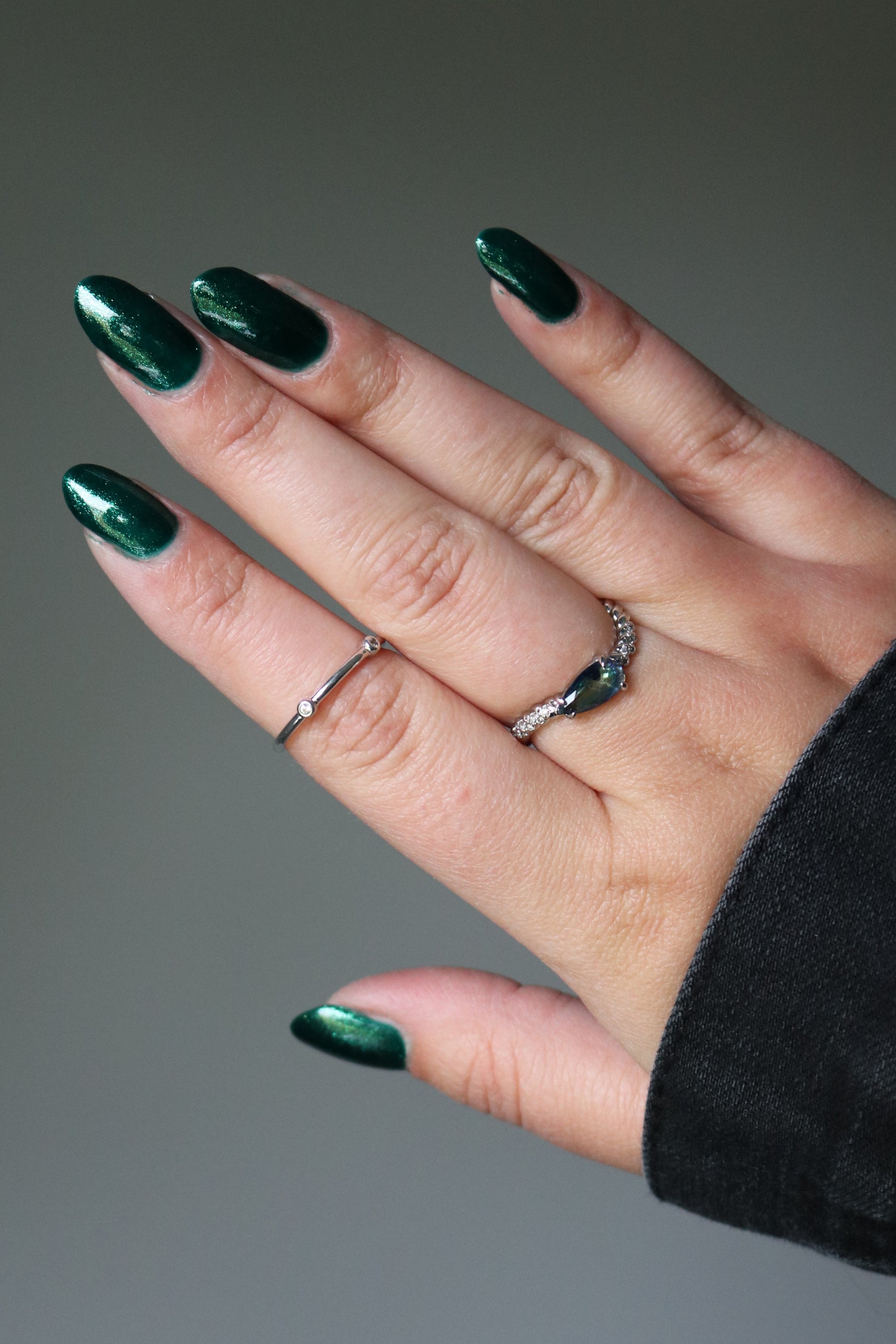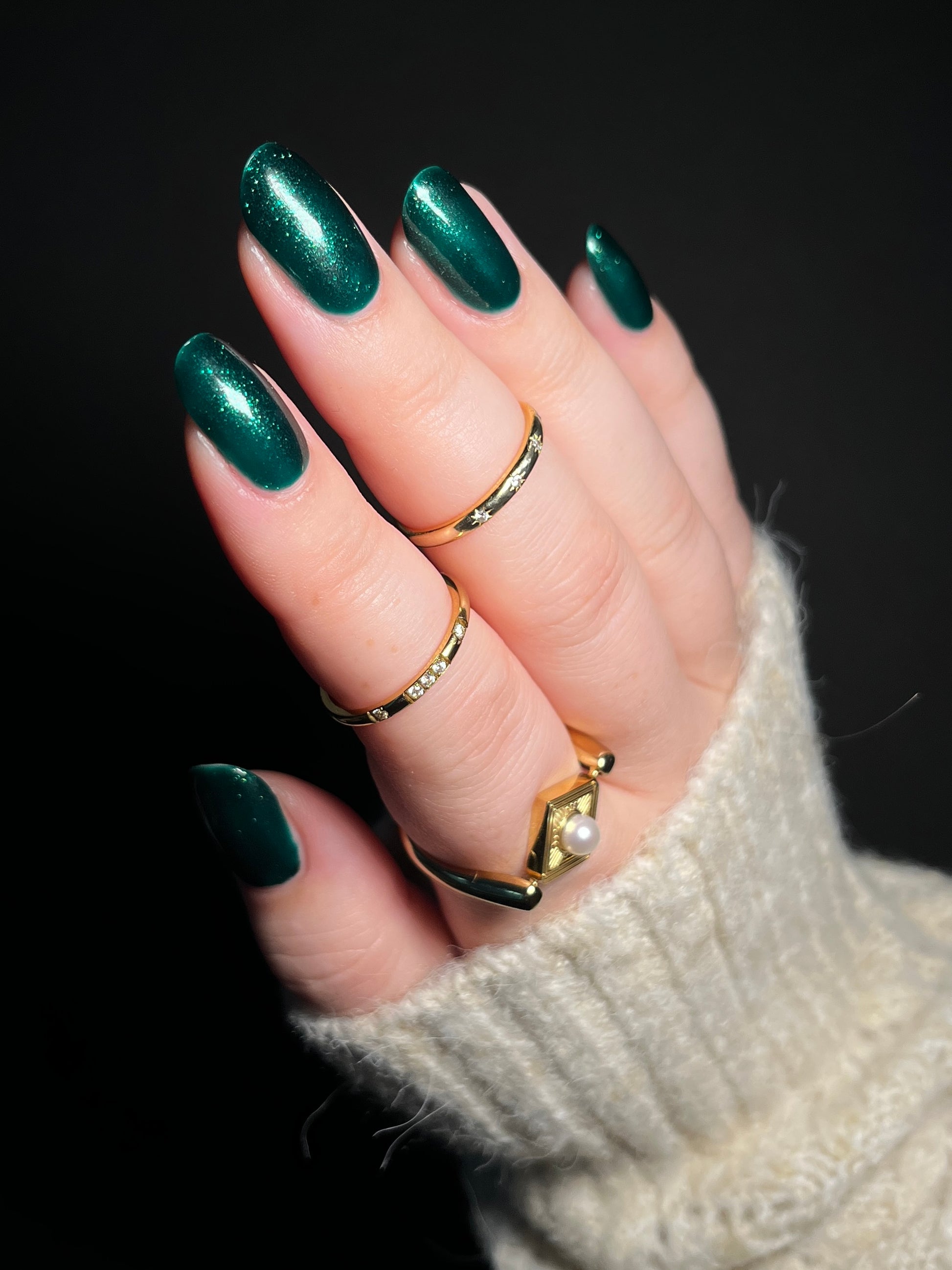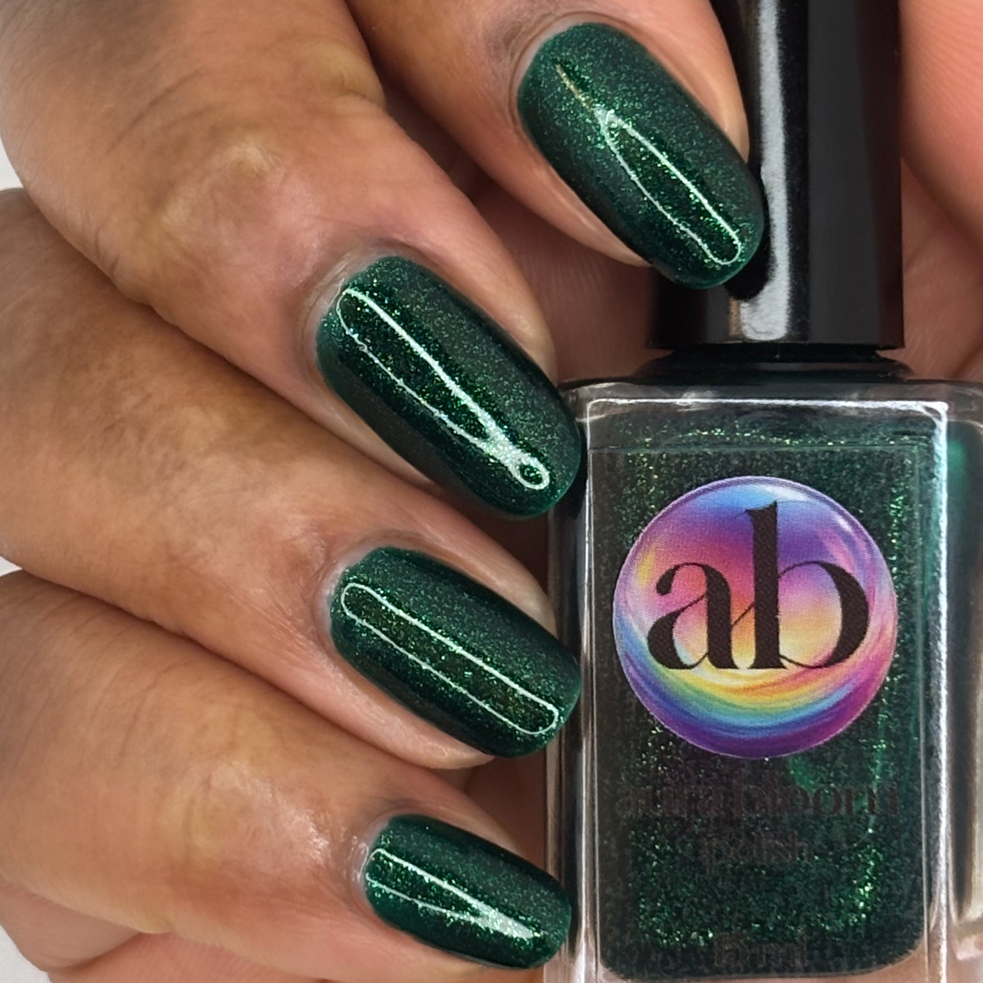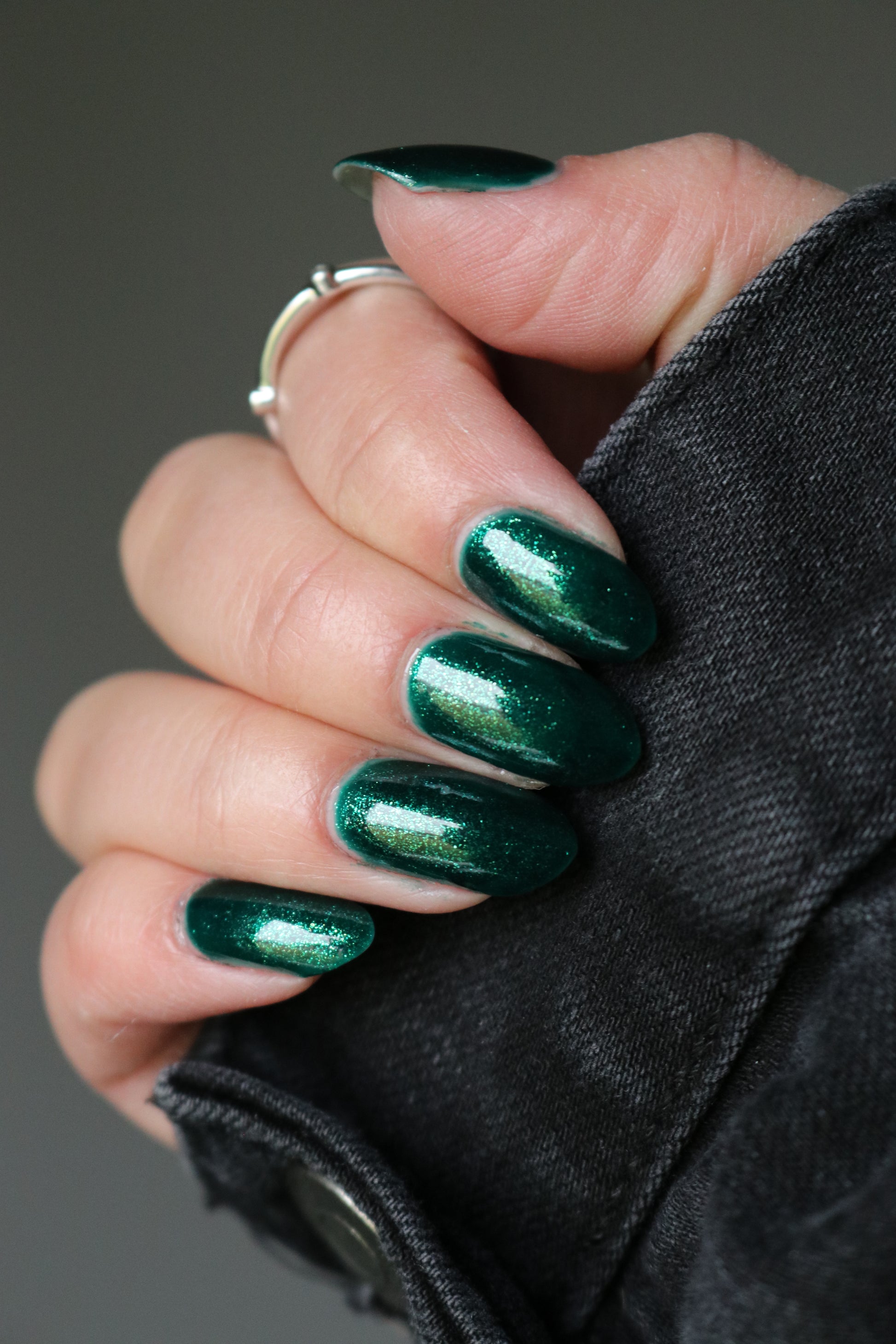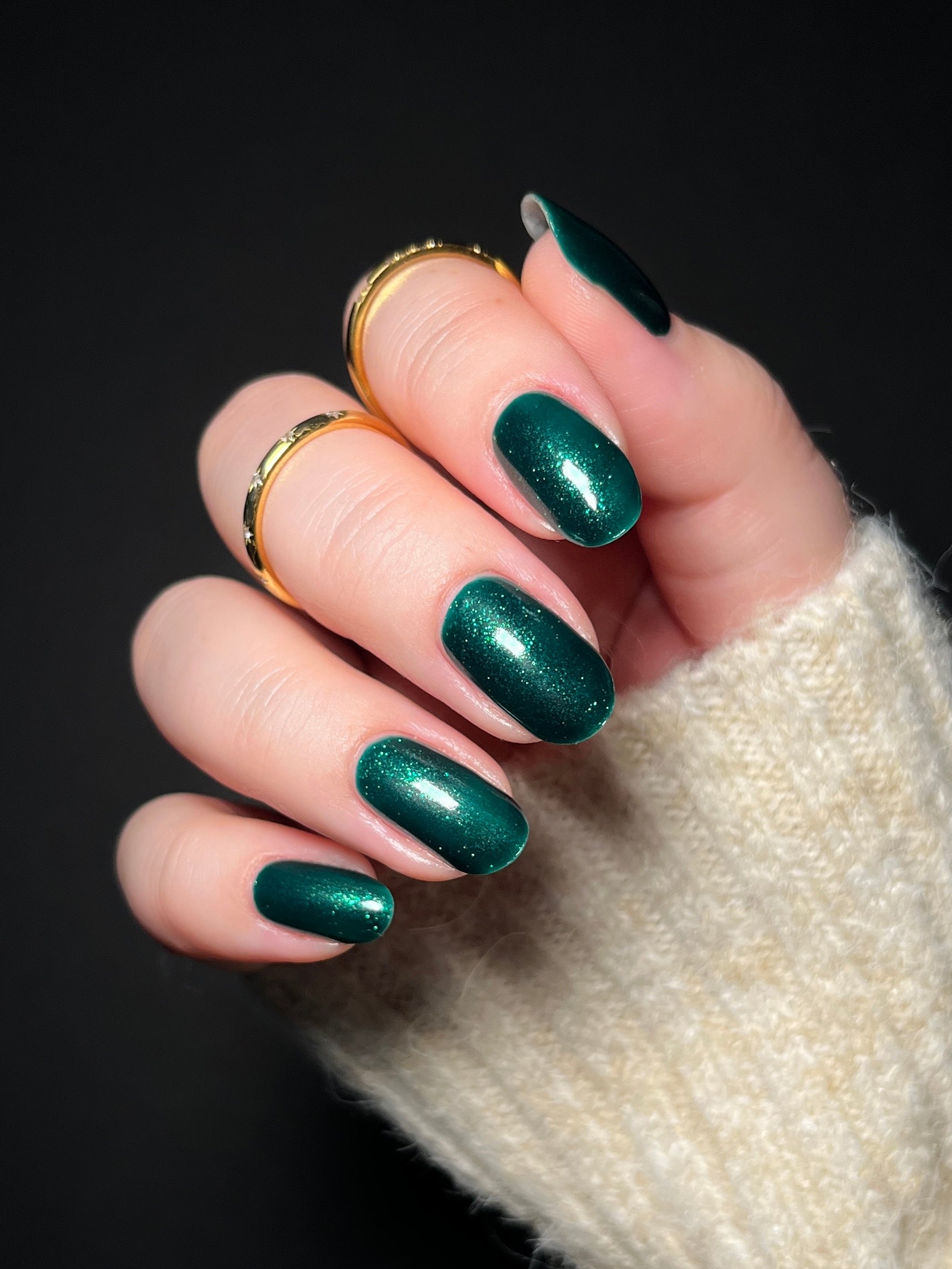 You're Tree-mendous is part of our Classic Holiday Tree-o Set. It's a medium-dark evergreen colored nail polish packed with glittery and sparkling green-to-yellow micro flakes to give an appearance of glitter, but contains zero glitter. This is a jelly-leaning polish. They are like a jelly in 1-2 coats, but the micro flakes build opacity in 3 coats.