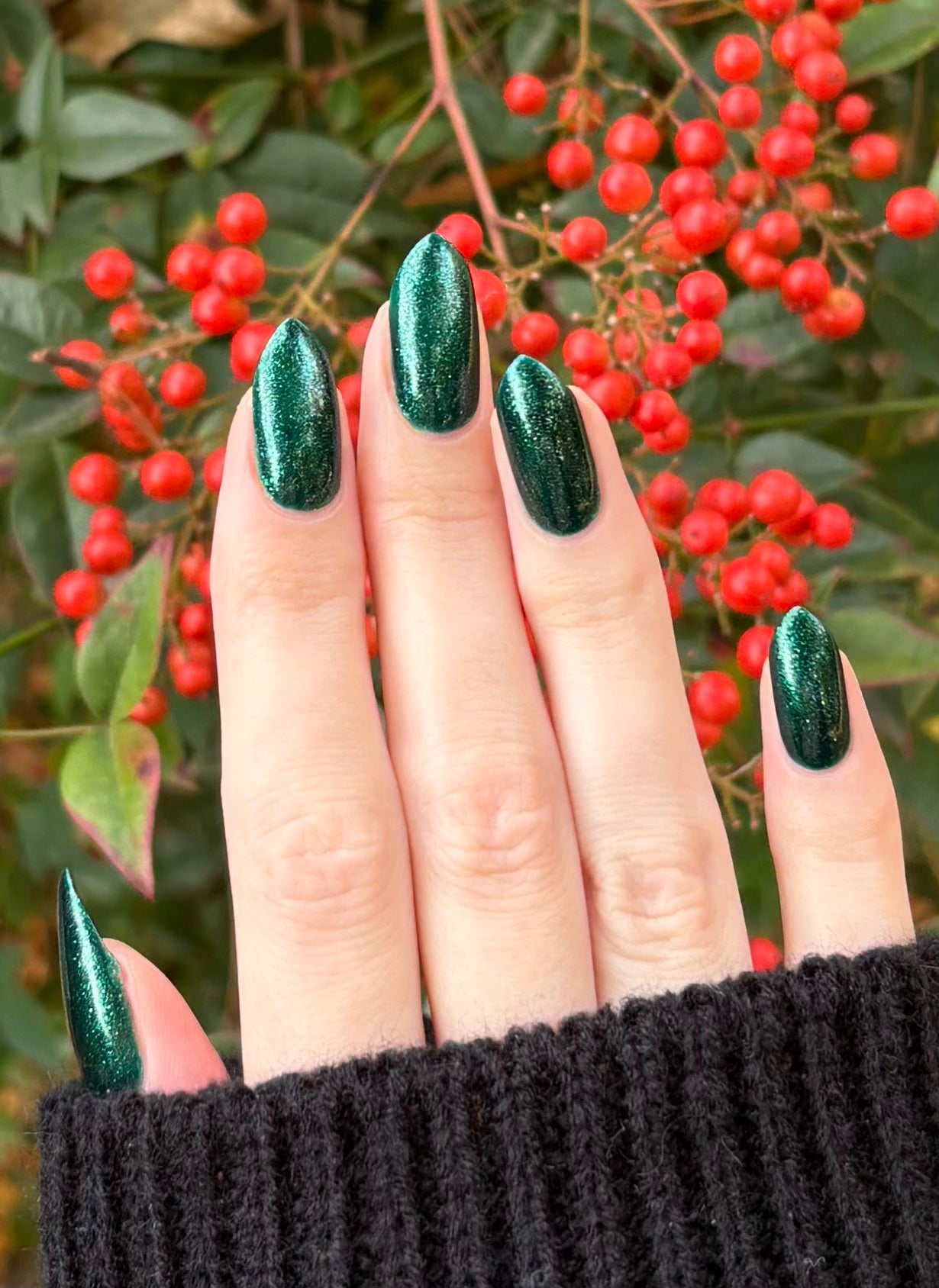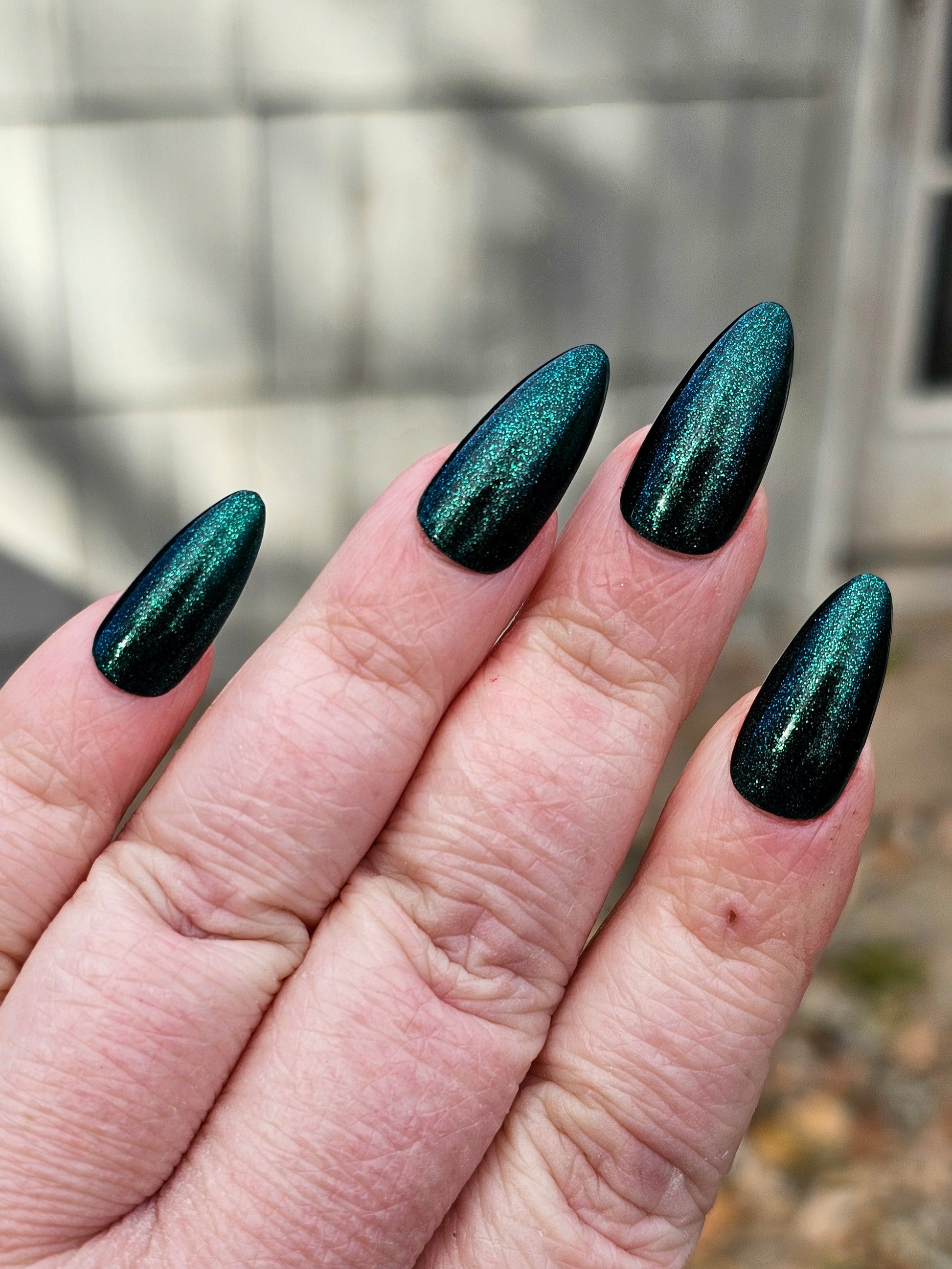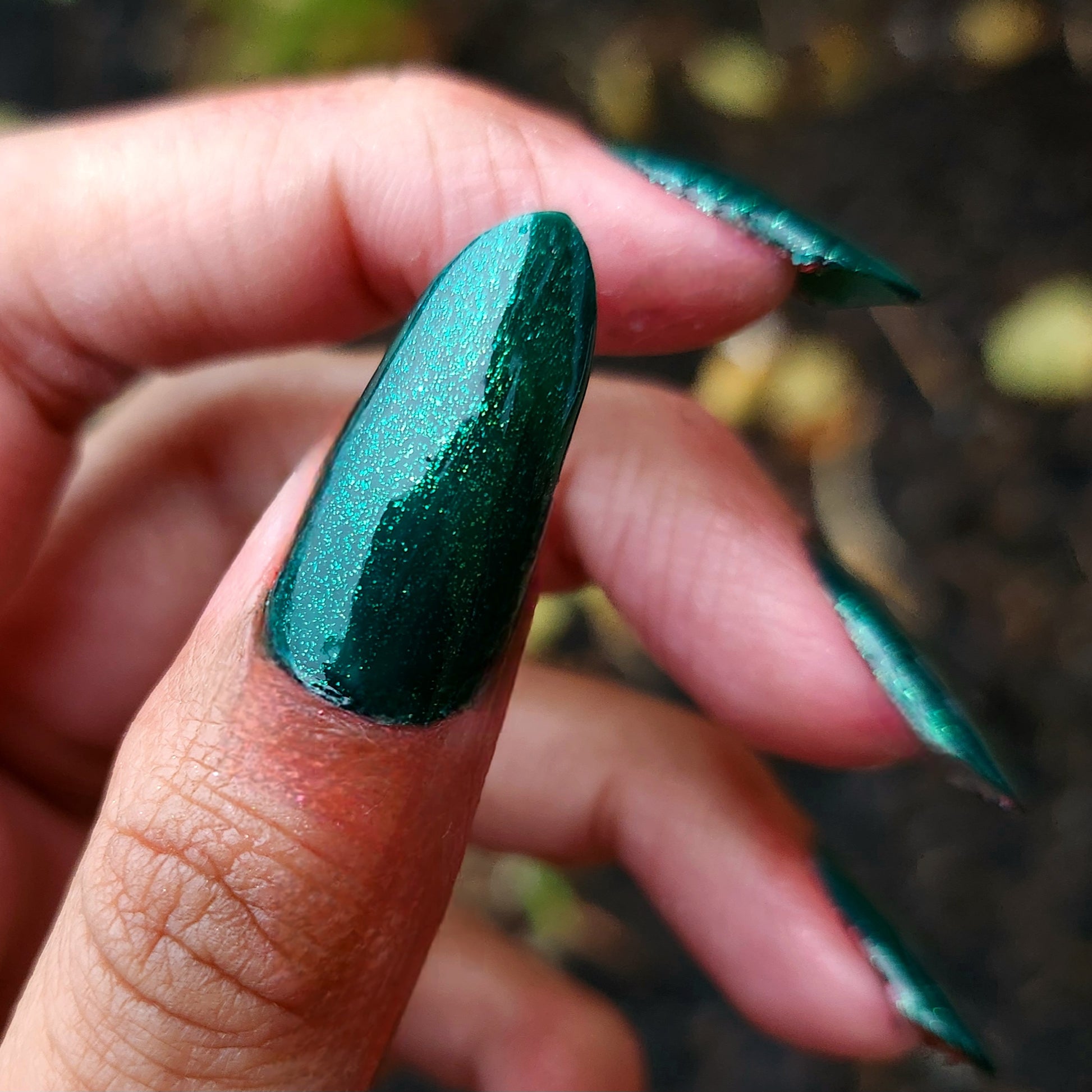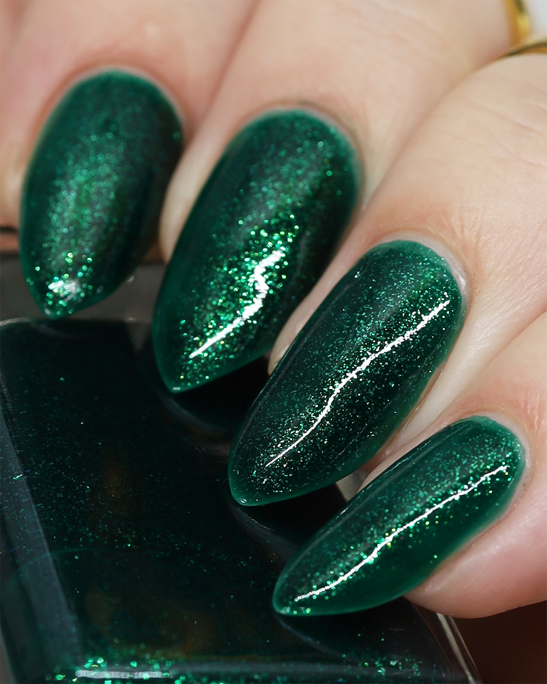 You're Tree-mendous is part of our Classic Holiday Tree-o Set. It's a medium-dark evergreen colored nail polish packed with glittery and sparkling green-to-yellow micro flakes to give an appearance of glitter, but contains zero glitter. This is a jelly-leaning polish. They are like a jelly in 1-2 coats, but the micro flakes build opacity in 3 coats.