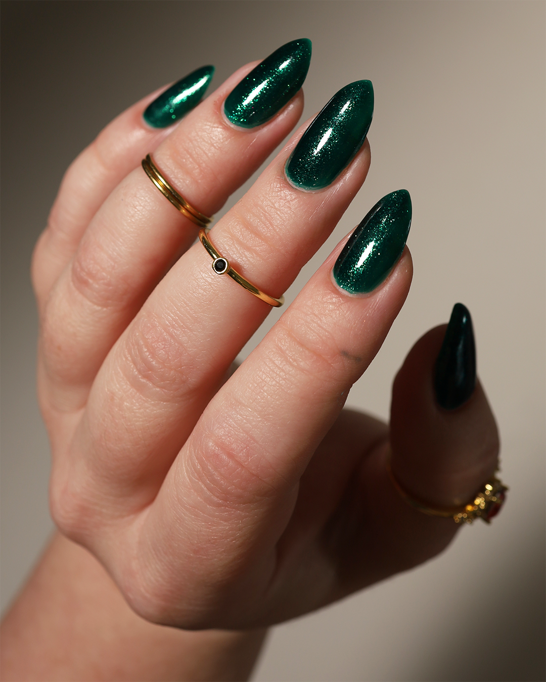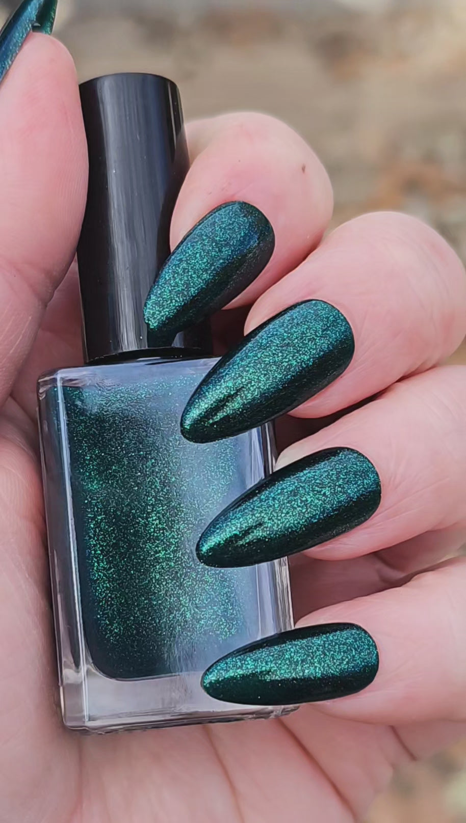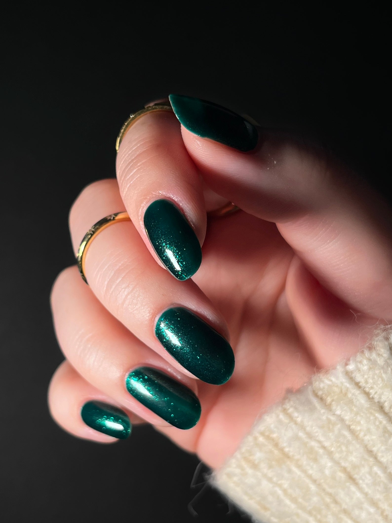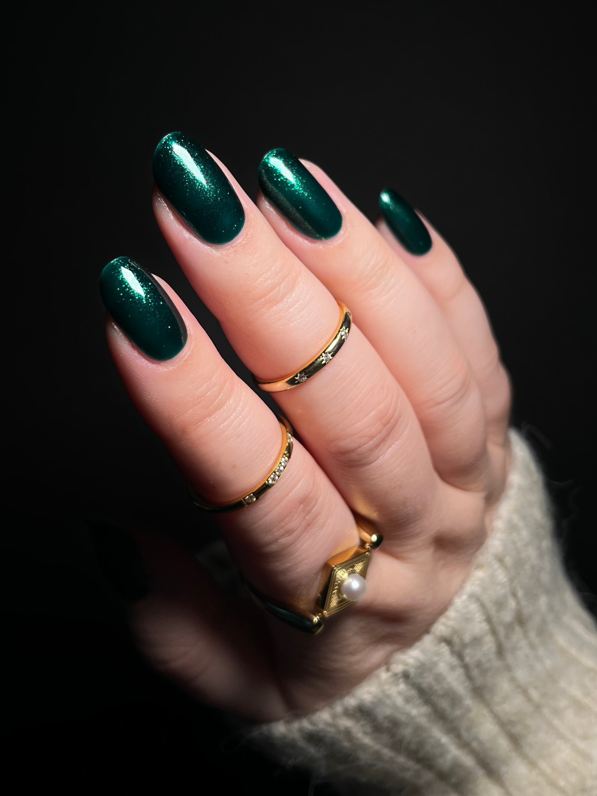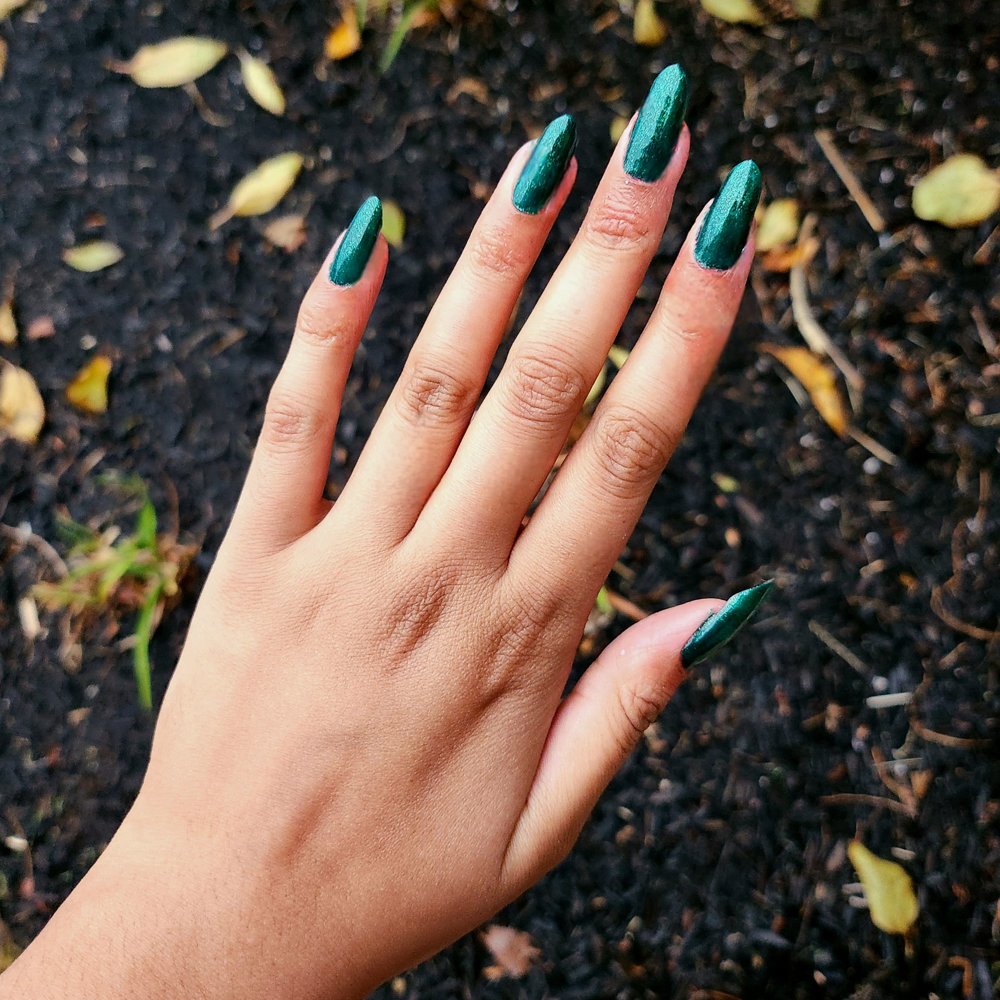 You're Tree-mendous is part of our Classic Holiday Tree-o Set. It's a medium-dark evergreen colored nail polish packed with glittery and sparkling green-to-yellow micro flakes to give an appearance of glitter, but contains zero glitter. This is a jelly-leaning polish. They are like a jelly in 1-2 coats, but the micro flakes build opacity in 3 coats.
